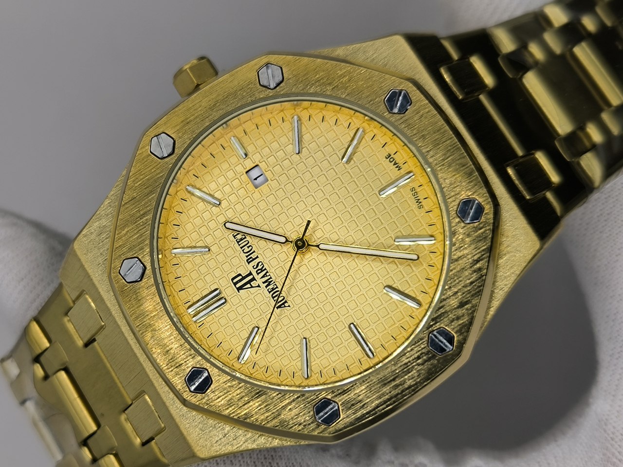 ساعت مچی مردانه آدمارس AUDEMARS مدل AP Aok طلایی با کیفیت سوپر کوالیتی انتخابی لوکس و ماندگار برای آقایان خوشسلیقه است قاب و بند استیل با رنگ ثابت و قفل استیل در کنار شیشه کریستال ضدخش جلوهای مقاوم و شیک به ساعت بخشیده موتور کوارتز دقیق و قابلیت روزشمار آن را به گزینهای کاربردی تبدیل کرده این مدل ضد آب را میتوانید از فروشگاه اینترنتی روبی مد تهیه کنید و استایل خود را با یک انتخاب خاص کامل کنید.