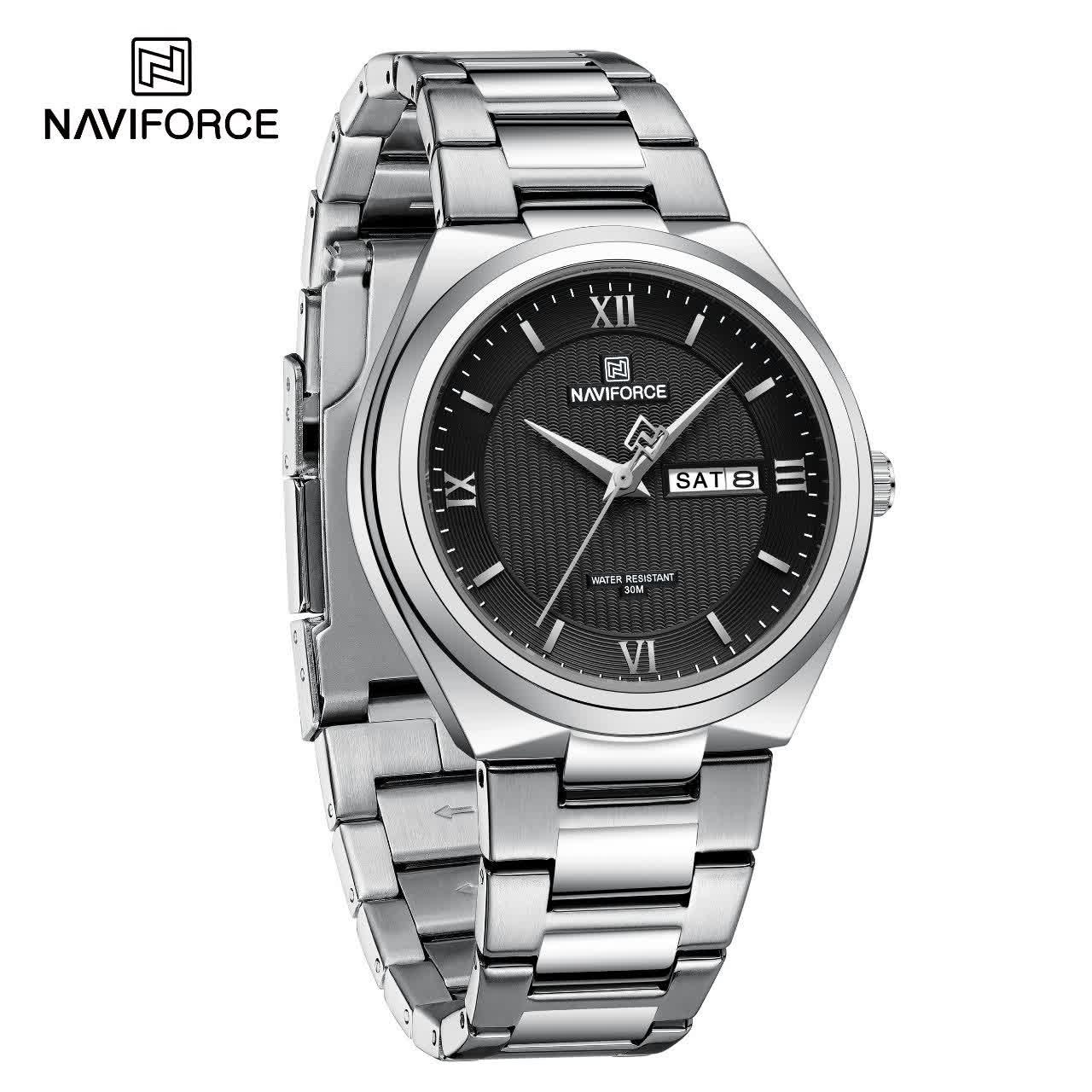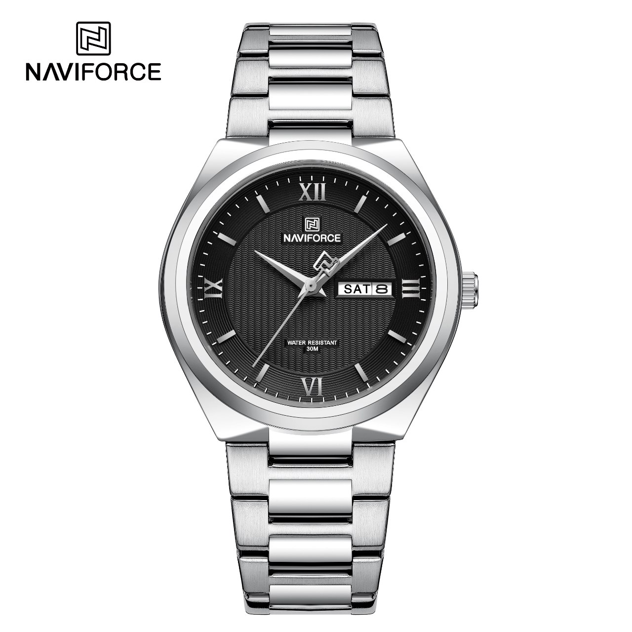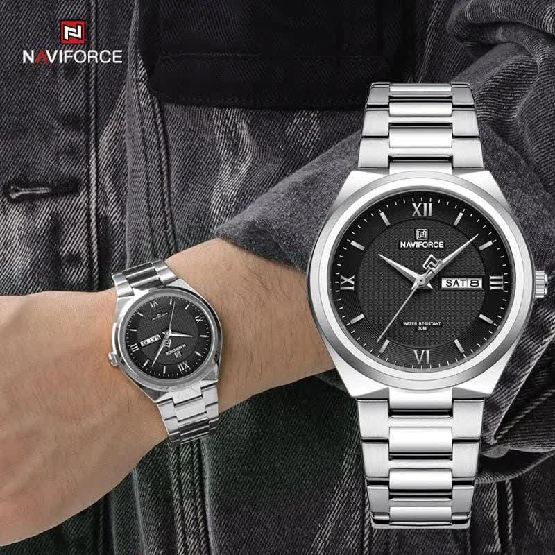 ساعت مچی عقربه ای مردانه نیوی فورس NAVIFORCE مدل Nf8030 اورجینال انتخابی شیک و کاربردی برای آقایان است که با کارت گارانتی و جعبه عرضه میشود این ساعت مجهز به موتور ژاپنی دقیق و تقویم روزانه بوده و قاب استیل مقاوم آن همراه با صفحه شب نما جلوهای خاص ایجاد میکند بند استیل رنگ ثابت با طراحی ضد حساسیت پوستی و قفل کلیپسی ضامن دار راحتی و امنیت استفاده را تضمین میکند شیشه معدنی ضد خش دوام بالایی دارد و فرم صفحه دایرهای طراحی کلاسیک و جذاب را کامل میسازد این محصول ویژه را میتوانید از فروشگاه اینترنتی روبی مد تهیه کنید.