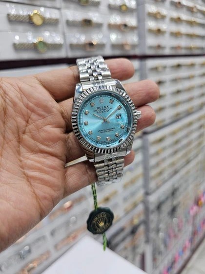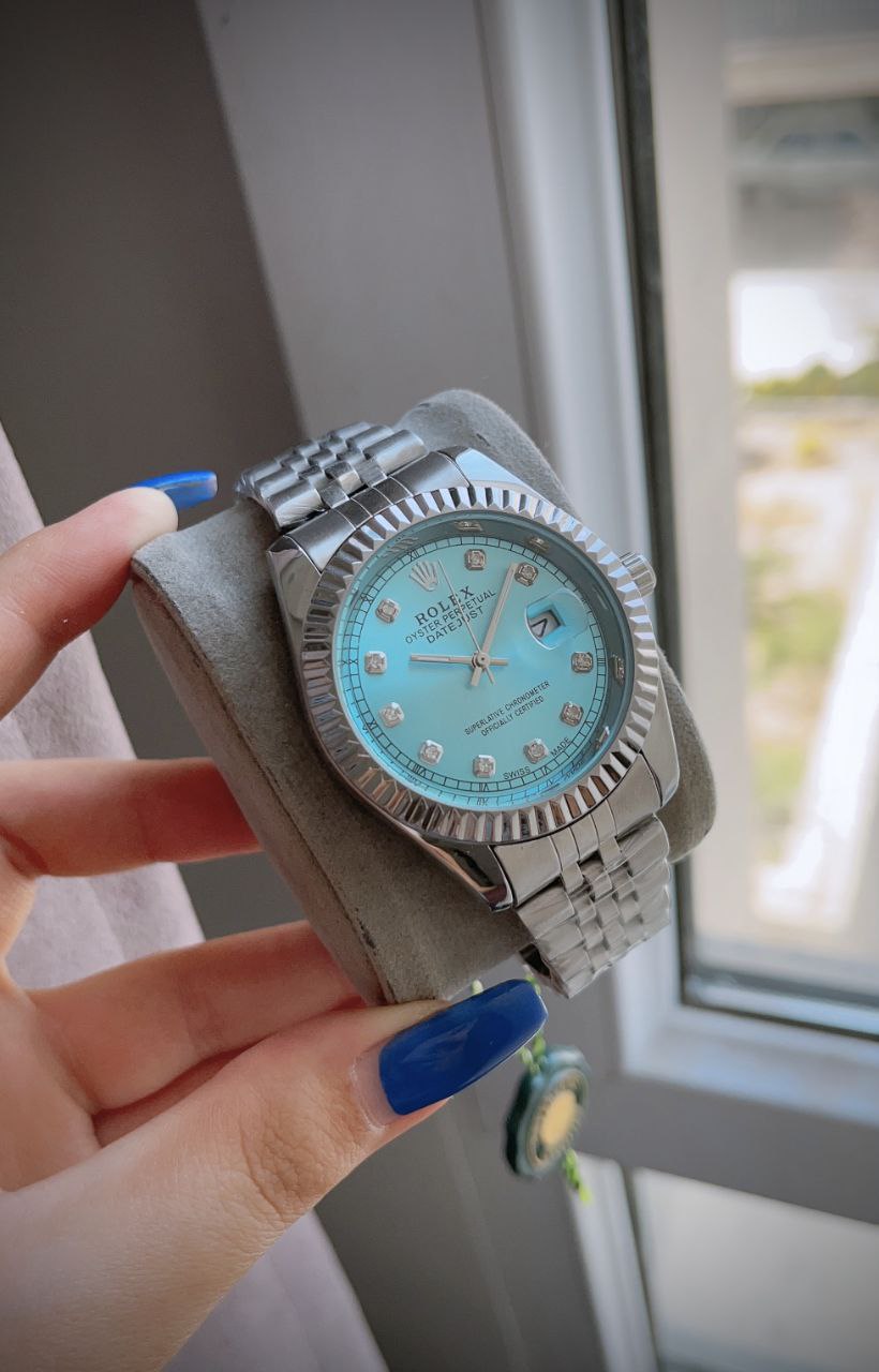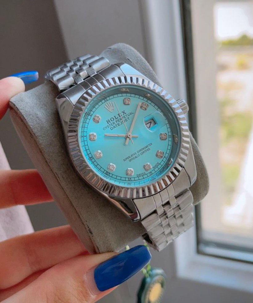 ساعت مچی مردانه رولکس ROLEX با صفحه فیروزهای و طراحی نگینی جلوهای لوکس و خاص دارد این ساعت با موتور کوارتز دقیق و بند استیل مقاوم همراهی مطمئن برای استفاده روزانه و رسمی است ویژگی ضدآب قفل کلیپسی و تقویم تلسکوپی آن را به انتخابی کاربردی و شیک تبدیل کرده است برای تهیه این محصول میتوانید به فروشگاه اینترنتی روبی مد مراجعه کنید.