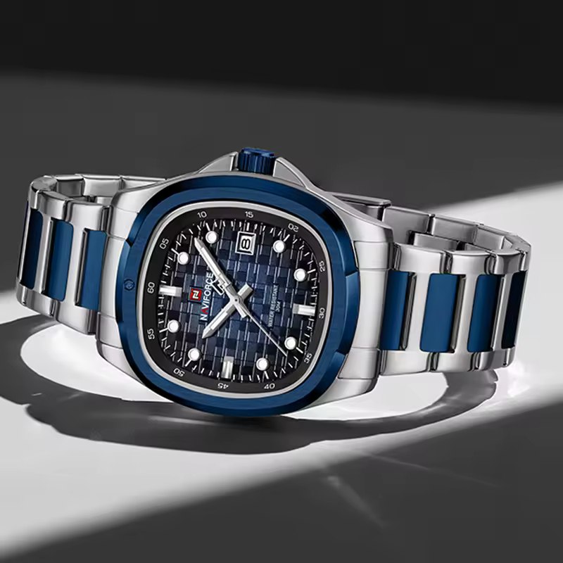 ساعت مچی عقربهای مردانه نیوی فورس مدل Nf9240 با فرم صفحه مربع طرح پتک و طراحی خاص انتخابی متفاوت برای استایلهای رسمی و روزمره است این مدل اورجینال همراه با جعبه و کارت گارانتی معتبر از فروشگاه اینترنتی روبی مد عرضه میشود دارای موتور ژاپنی دقیق تقویم روزشمار عقربههای شبنما و قاب استیل مقاوم است بند استیل توپُر با رنگ ثابت و ضد حساسیت پوستی در کنار قفل کلیپسی ضامندار راحتی و دوام را تضمین میکند همچنین شیشه معدنی ضد خش و مقاومت در برابر آب این ساعت را به گزینهای مطمئن و شیک برای آقایان خوشسلیقه تبدیل کرده است.