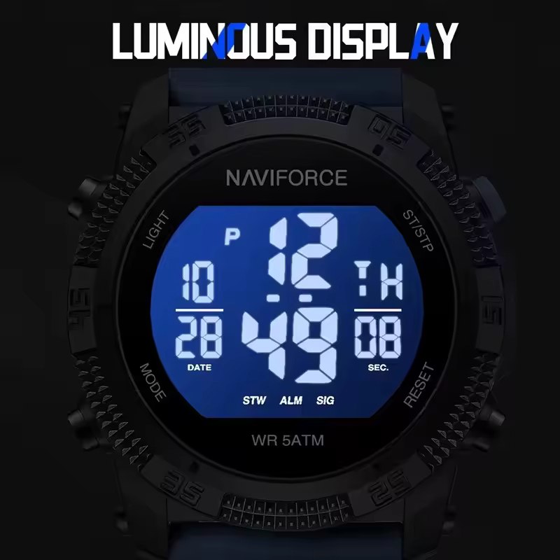 ساعت مچی مردانه دیجیتال نیوی فورس مدل Nf7104 با طراحی اسپرت و فرم صفحه دایرهای انتخابی مدرن و کاربردی برای استفاده روزمره است این مدل اورجینال همراه با جعبه و کارت گارانتی معتبر از فروشگاه اینترنتی روبی مد عرضه میشود دارای موتور ژاپنی کوارتز دقیق کرنومتر تایمر تقویم ثانیهشمار و صفحه چراغدار برای نمایش واضح در نور کم است بند رابر ضد حساسیت با قفل کمربندی سوزنی و شیشه معدنی ضد خش دوام و راحتی را تضمین میکند همچنین مقاومت در برابر آب این ساعت را به گزینهای مطمئن برای فعالیتهای روزانه و ورزشی تبدیل کرده است.