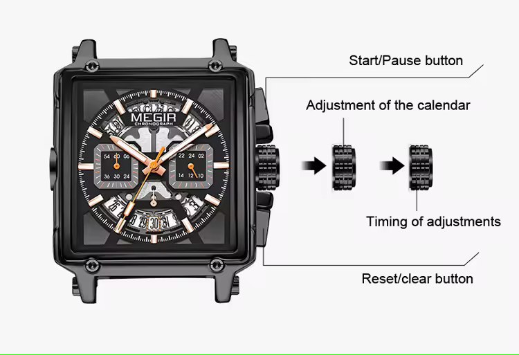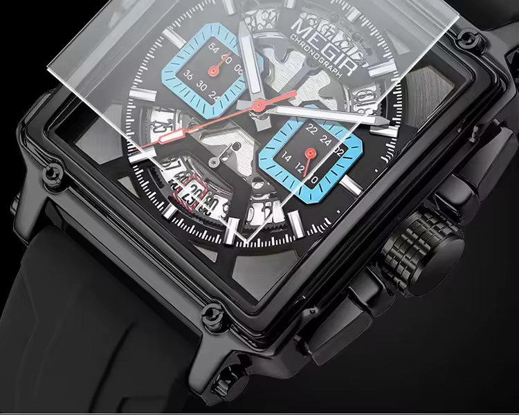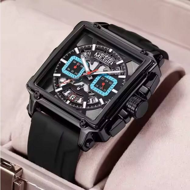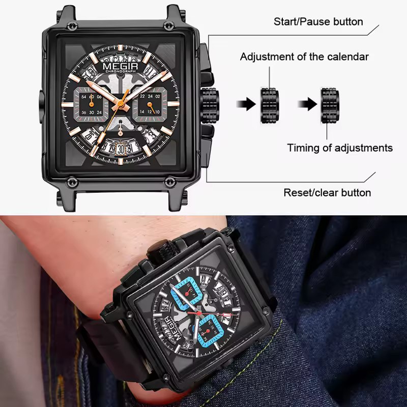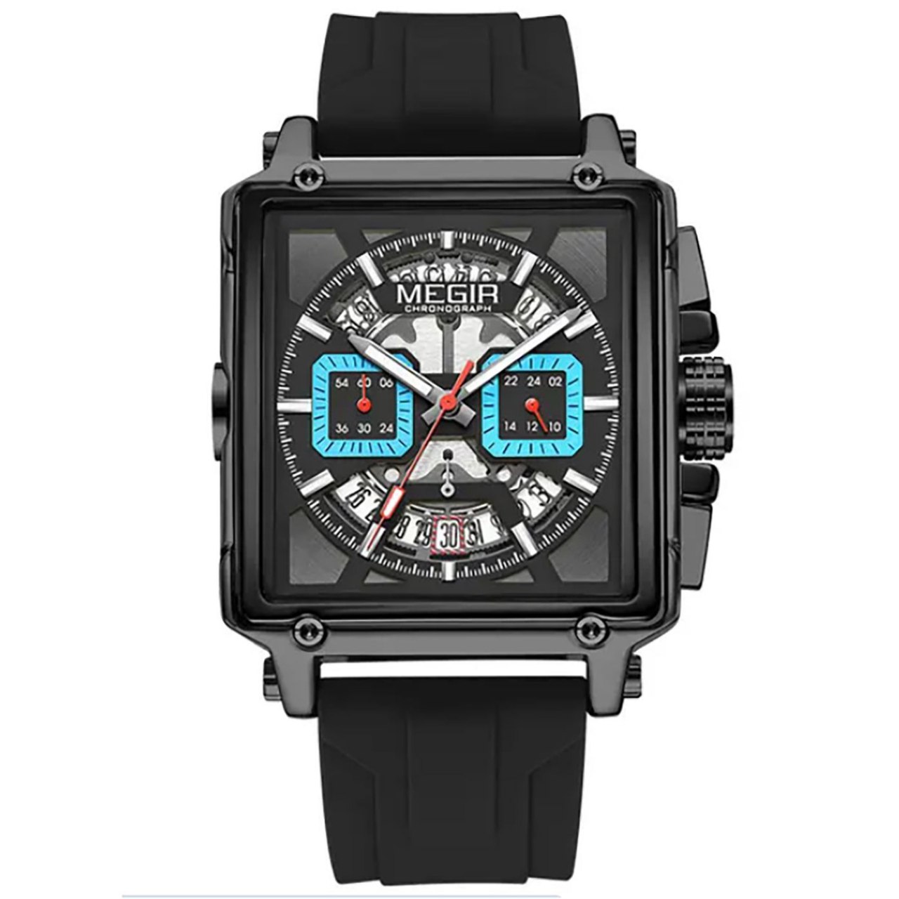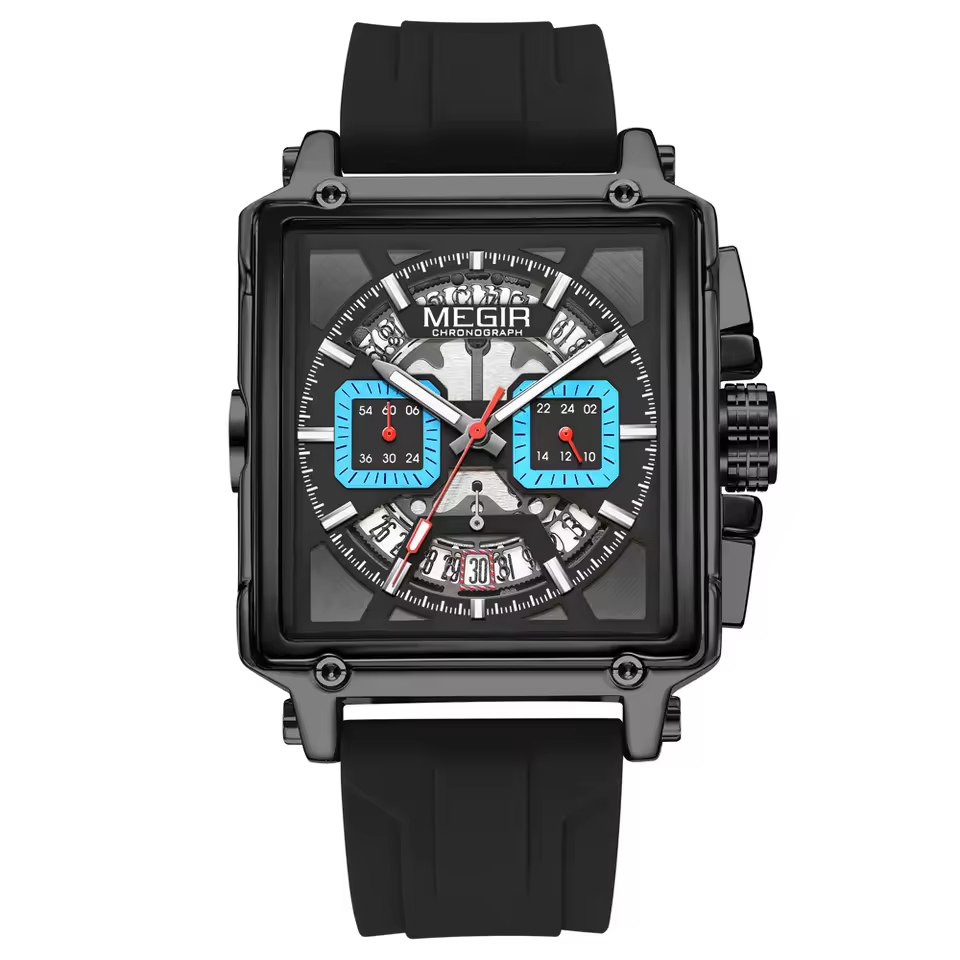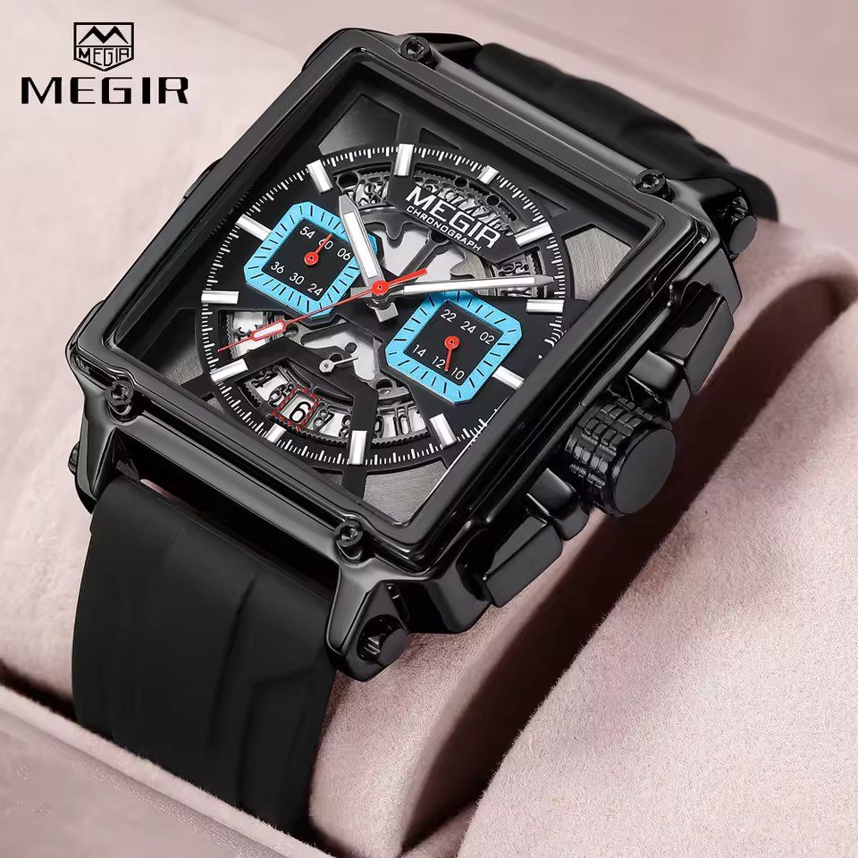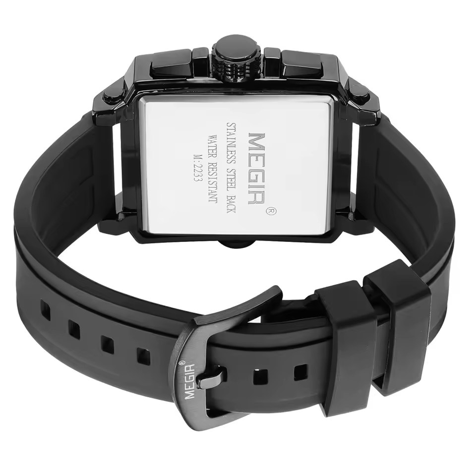 ساعت مچی کرنوگراف سه موتوره مردانه مگیر Megir مدل MN2233G-BKGN-9 اورجینال با کارت ضمانت vip و جعبه و دفترچه مجهز به موتور کوارتز ژاپن و تقویم روزانه دارای قاب استیل مقاوم و عقربه شب تاب ضد آب با بند رابر سیلیکونی ضد حساسیت پوستی شیشه معدنی ضد خش و قفل کمربندی سوزنی فرم صفحه مربع طراحی اسپرت و مدرن مناسب استفاده روزمره و رسمی از فروشگاه اینترنتی روبی مد این ساعت با کیفیت ساخت بالا و جزئیات دقیق انتخابی مطمئن برای آقایان خوش سلیقه است جلوه ای خاص به تیپ شما می بخشد و ترکیبی از دوام و زیبایی را در هر موقعیت همراهتان خواهد بود همچنین طراحی منحصر به فرد صفحه مربع آن جذابیت بیشتری به استایل شما اضافه می کند.