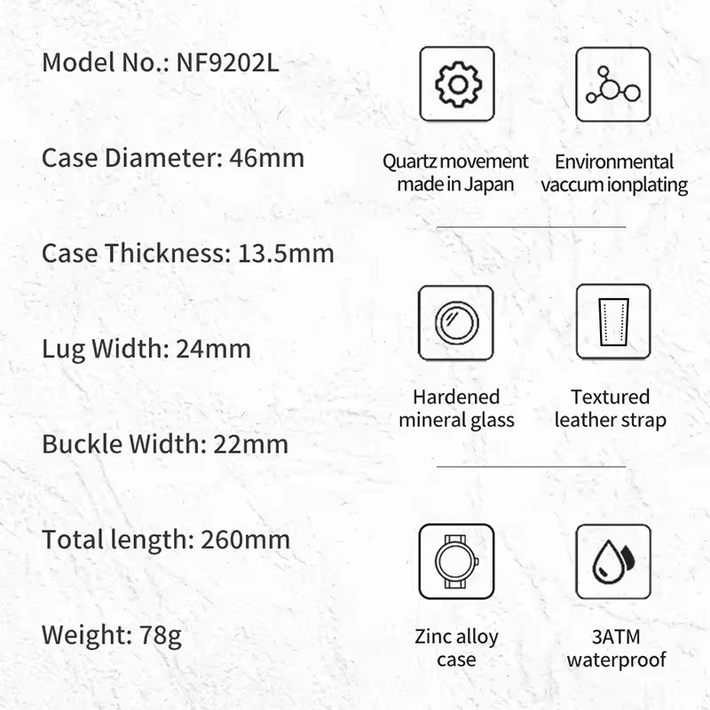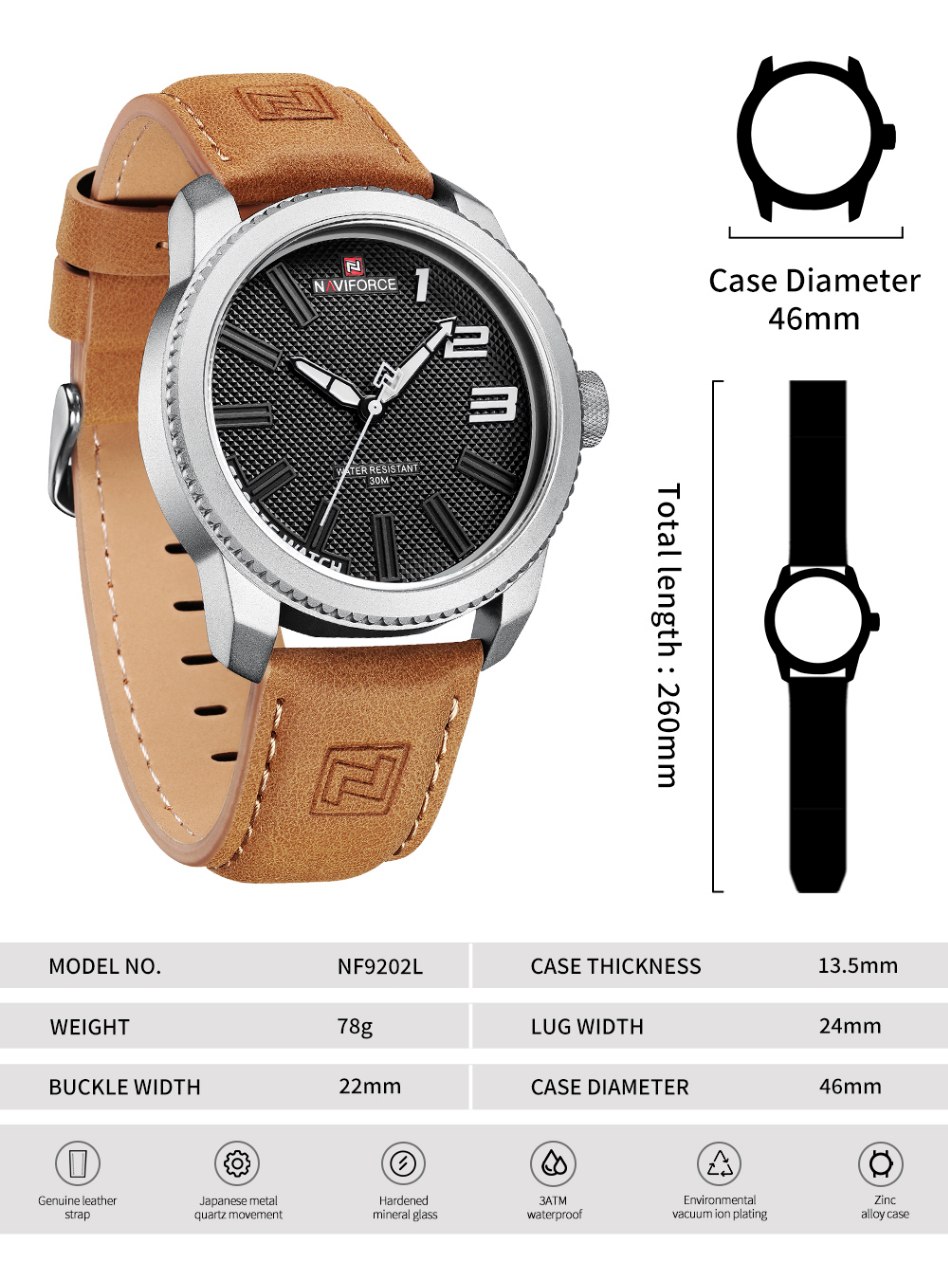 ساعت مچی مردانه نیوی فورس NAVIFORCE مدل Nf9202l اورجینال با کارت گارانتی و جعبه مجهز به موتور ژاپن و قاب استیل مقاوم ضد آب با عقربه شب نما بند چرم دور دوخت ضد حساسیت پوستی شیشه معدنی ضد خش و قفل کمربندی فرم صفحه گرد طراحی کلاسیک و شیک از فروشگاه اینترنتی روبی مد