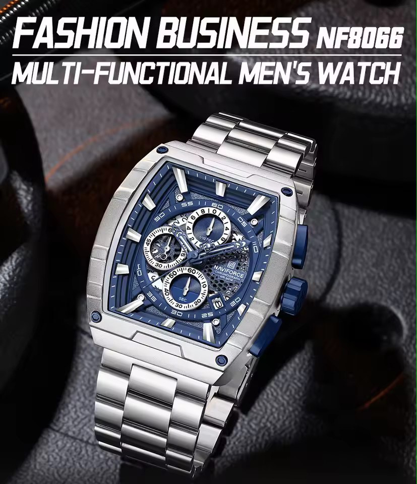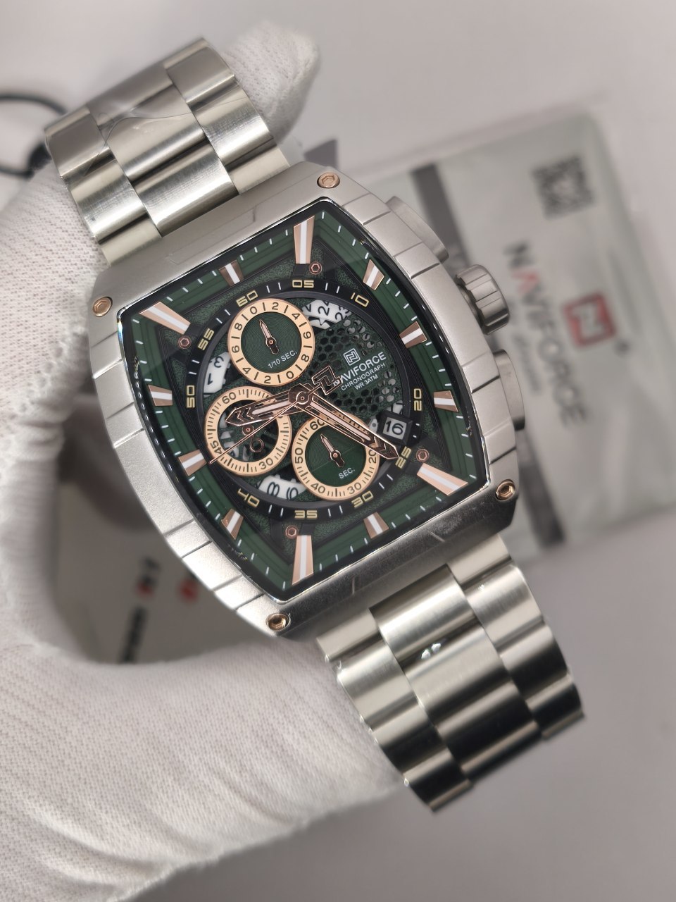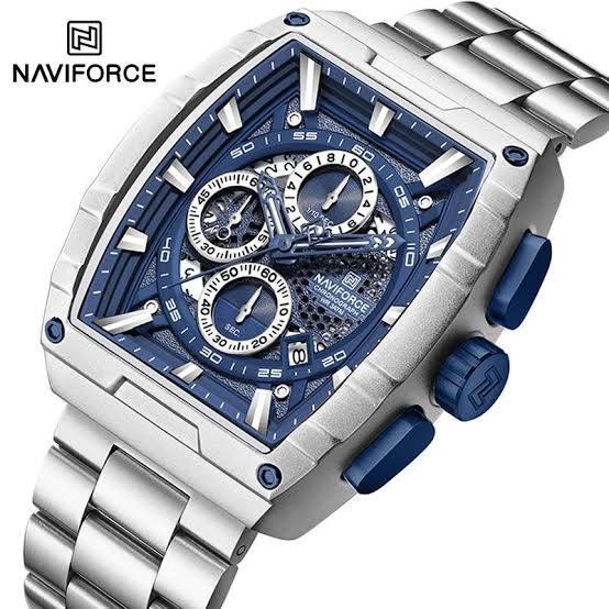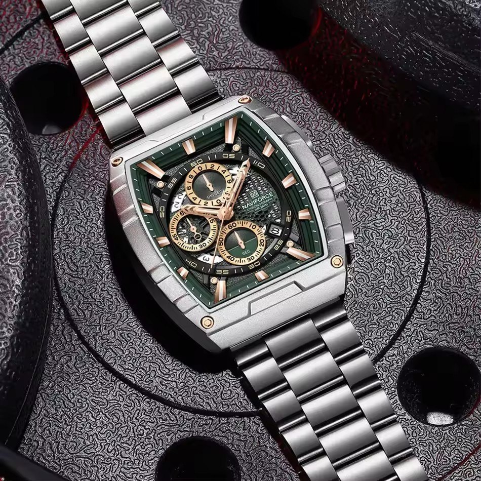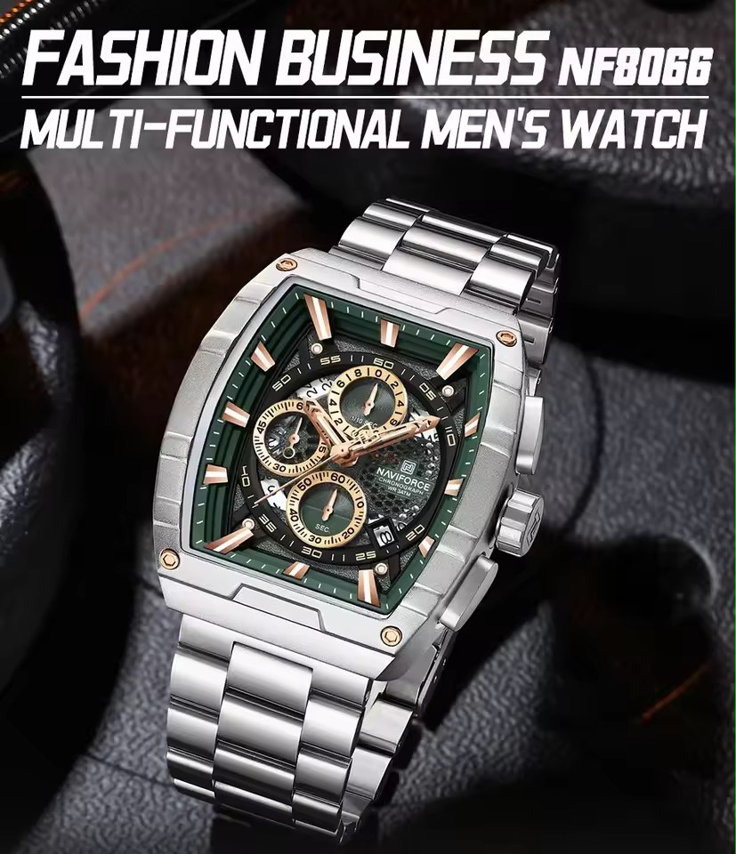 ساعت مچی کرنوگراف مردانه نیوی فورس NAVIFORCE مدل Nf8066 یک انتخاب شیک و قدرتمند برای آقایانی است که به کیفیت و استایل اهمیت میدهند این مدل با طراحی صفحه مستطیلی و بند استیل ضد زنگ و توپُر سنگین حس لوکس بودن را منتقل میکند سه موتوره کرنوگراف با موتور ژاپن کوارتز دقت بالا را تضمین میکند و وجود تقویم و عقربه شب تاب استفاده روزمره را راحتتر میسازد بدنه با قاب استیل و شیشه معدنی ضد خش ساخته شده تا در برابر ضربه و خط و خش مقاوم باشد همچنین ضد آب بودن بند ضد حساسیت پوستی و قفل کلیپسی ضامن دار این ساعت را به گزینهای کامل و مطمئن تبدیل کرده است این محصول ارجینال همراه با کارت گارانتی و جعبه از فروشگاه اینترنتی روبی مد عرضه میشود.