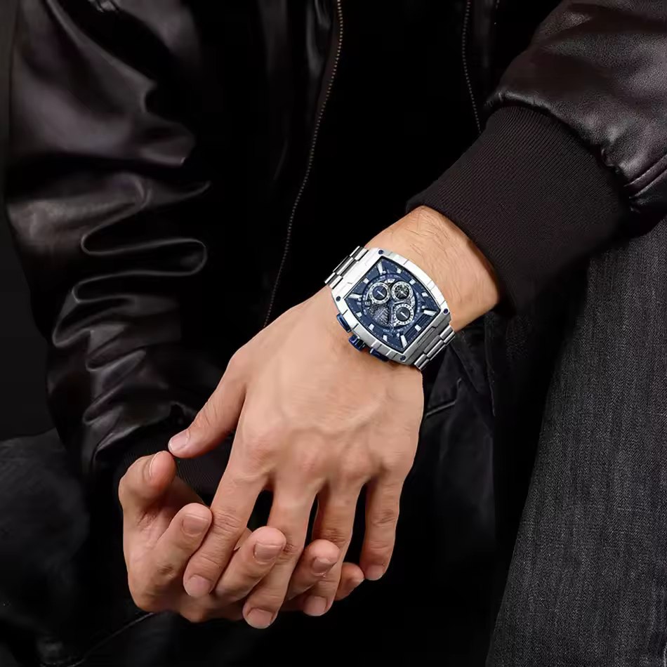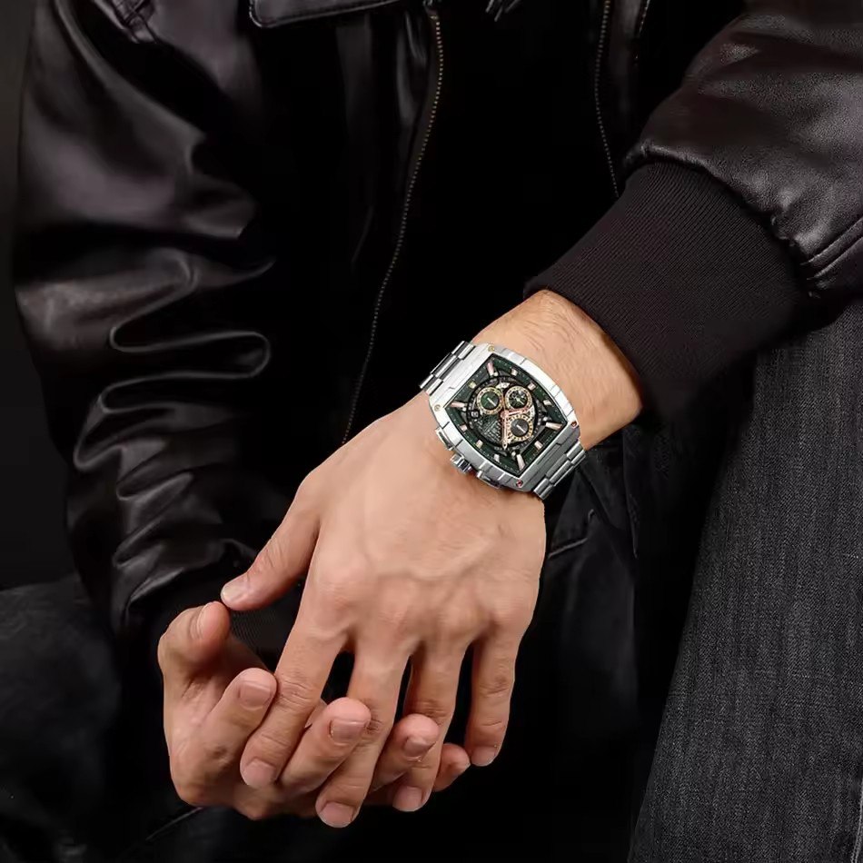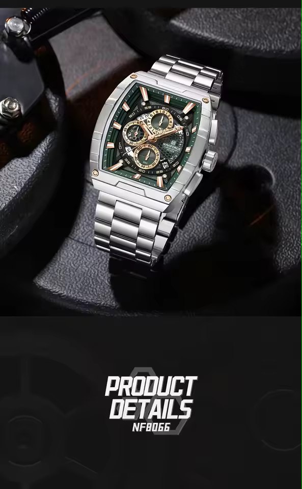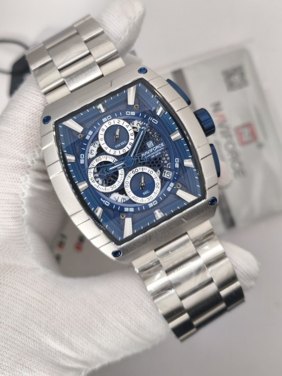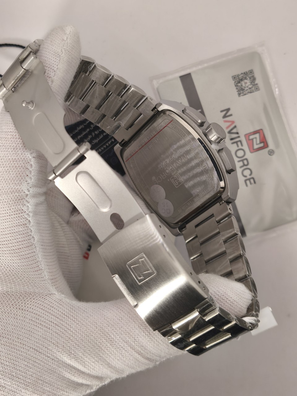 ساعت مچی کرنوگراف مردانه نیوی فورس NAVIFORCE مدل Nf8066 یک انتخاب شیک و قدرتمند برای آقایانی است که به کیفیت و استایل اهمیت میدهند این مدل با طراحی صفحه مستطیلی و بند استیل ضد زنگ و توپُر سنگین حس لوکس بودن را منتقل میکند سه موتوره کرنوگراف با موتور ژاپن کوارتز دقت بالا را تضمین میکند و وجود تقویم و عقربه شب تاب استفاده روزمره را راحتتر میسازد بدنه با قاب استیل و شیشه معدنی ضد خش ساخته شده تا در برابر ضربه و خط و خش مقاوم باشد همچنین ضد آب بودن بند ضد حساسیت پوستی و قفل کلیپسی ضامن دار این ساعت را به گزینهای کامل و مطمئن تبدیل کرده است این محصول ارجینال همراه با کارت گارانتی و جعبه از فروشگاه اینترنتی روبی مد عرضه میشود.