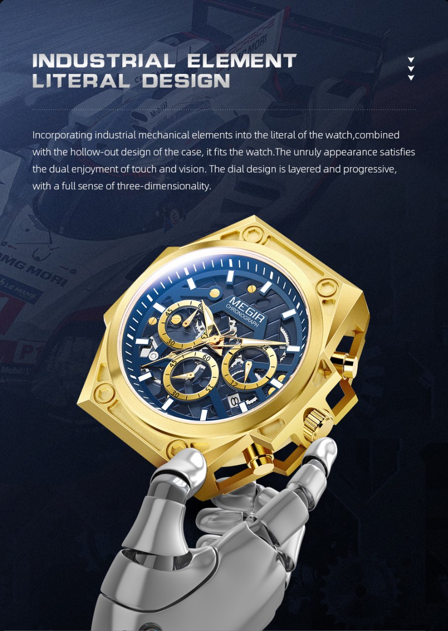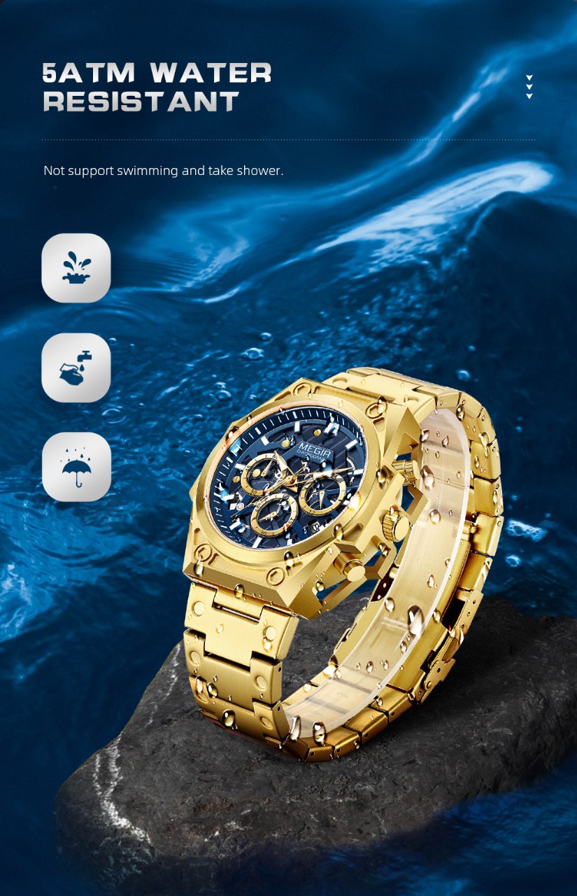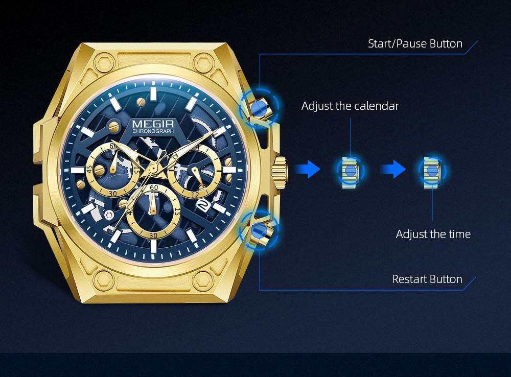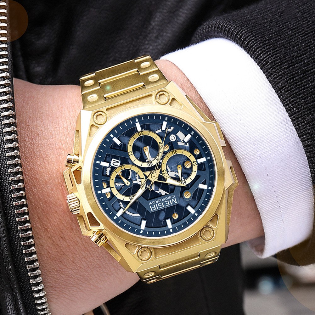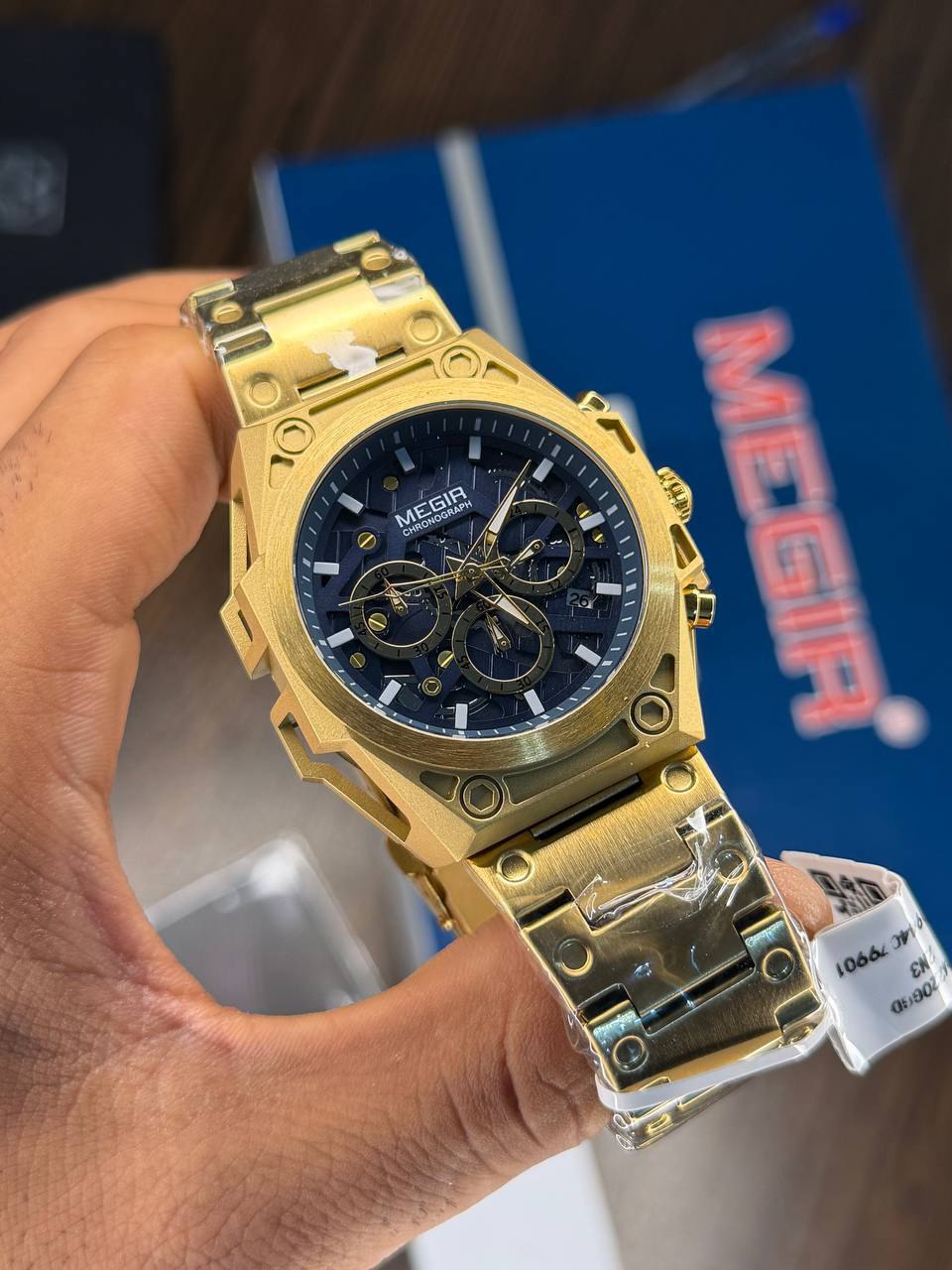 ساعت مچی کرنوگراف سه موتوره مردانه مگیر Megir مدل MS4220GGD-2N3 یک انتخاب شیک و مقاوم برای آقایانی است که به کیفیت و جزئیات اهمیت میدهند این مدل با موتور کوارتز ژاپنی دقیق قاب استیل فرم صفحه دایره ای و بند استیل رنگ ثابت و ضد حساسیت ساخته شده و با شیشه معدنی ضد خش دوام بالایی ارائه میدهد وجود کرنوگراف فعال تقویم عقربه شب تاب و قابلیت ضد آب بودن آن را برای استفاده روزمره و رسمی ایده آل میکند این محصول ارجینال بوده و همراه با کارت ضمانت vip جعبه و دفترچه از طریق فروشگاه اینترنتی روبی مد عرضه میشود و قفل کلیپسی ضامن دار نیز راحتی و امنیت استفاده را کامل میکند.