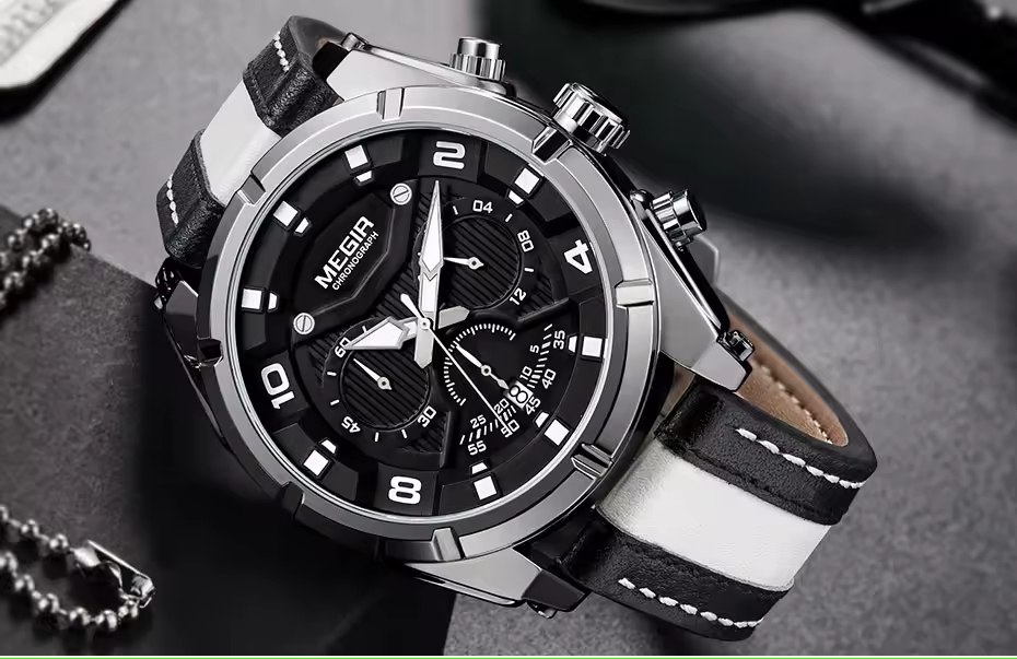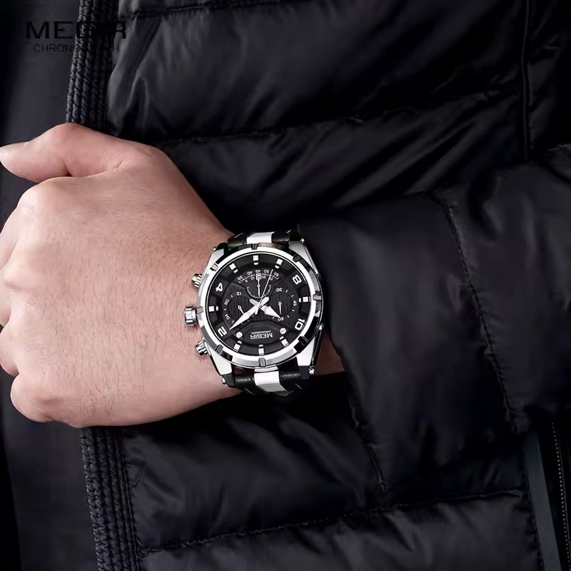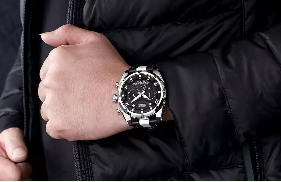 این ساعت مچی کرنوگراف سه موتوره مردانه مگیر Megir مدل ML2076GBK-1 با طراحی شیک و بند چرمی دوردوخت یک انتخاب جذاب و کاربردی برای استفاده روزمره و استایلی رسمی است این مدل با موتور کوارتز ژاپن عملکردی دقیق ارائه میدهد و به لطف قابلیت کرنوگراف و تقویم یک همراه کامل محسوب میشود قاب استیل مقاوم و شیشه معدنی ضد خش دوام بالایی ایجاد کرده و عقربه شب تاب خوانایی ساعت را در تاریکی حفظ میکند بند چرمی ضد حساسیت با قفل کمربندی سوزنی راحتی و استحکام را تضمین میکند این ساعت ضد آب است و به صورت ارجینال همراه با جعبه دفترچه و کارت ضمانت vip از فروشگاه اینترنتی روبی مد ارائه میشود فرم صفحه دایره ای شکل نیز ظاهر کلاسیک و جذاب آن را کامل میکند.