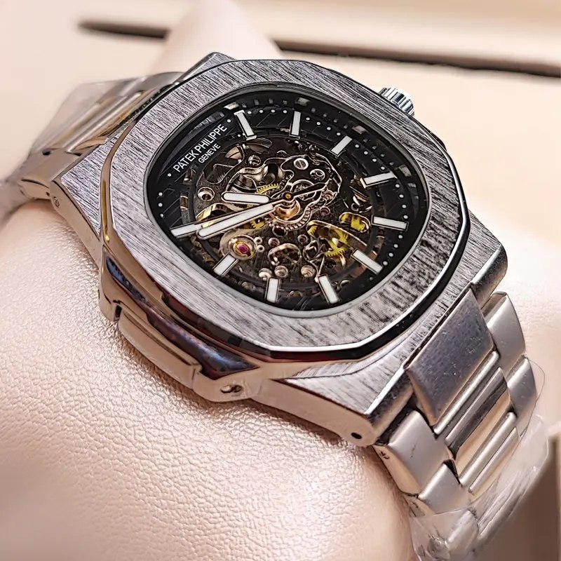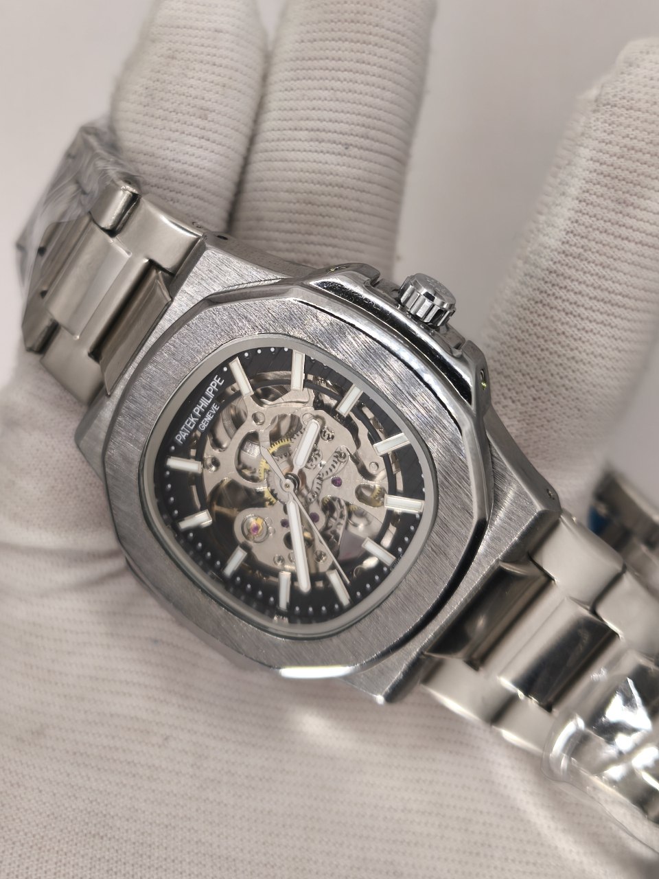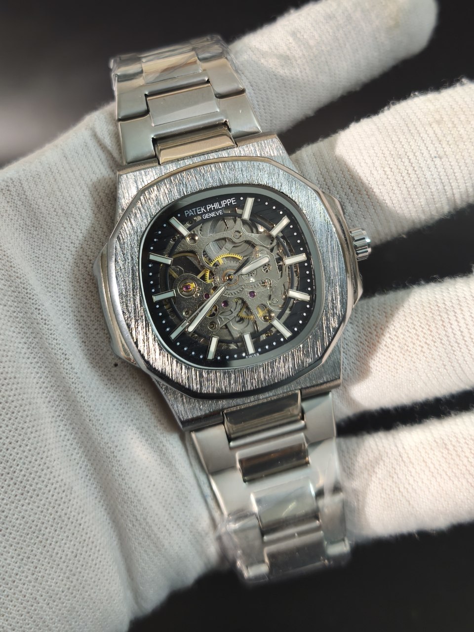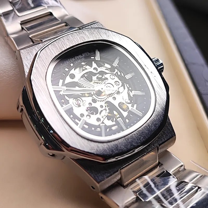 ساعت مچی مردانه اتوماتیک پتک فیلیپ اسکلتون PATEK PHILIPPE با طراحی چرخ دنده متحرک و صفحه پشت و رو نمایان یک مدل لوکس و چشمگیر برای استایل خاص است این ساعت با موتور اتومات بدون نیاز به باطری شیشه سافایر صفحه ضد خط و خش و پشت شیشه ای لنگر دار ساخته شده تا دوام و جذابیت را همزمان ارائه دهد بند ضد حساسیت پوستی رنگ ثابت قفل جدید پروانه ای و مقاومت بالا دربرابر آب کیفیت آن را کامل میکند این مدل خاص را میتوانید از فروشگاه اینترنتی روبی مد تهیه کنید.