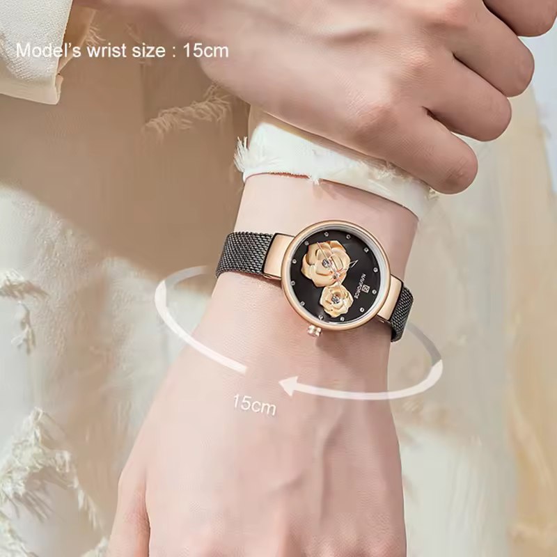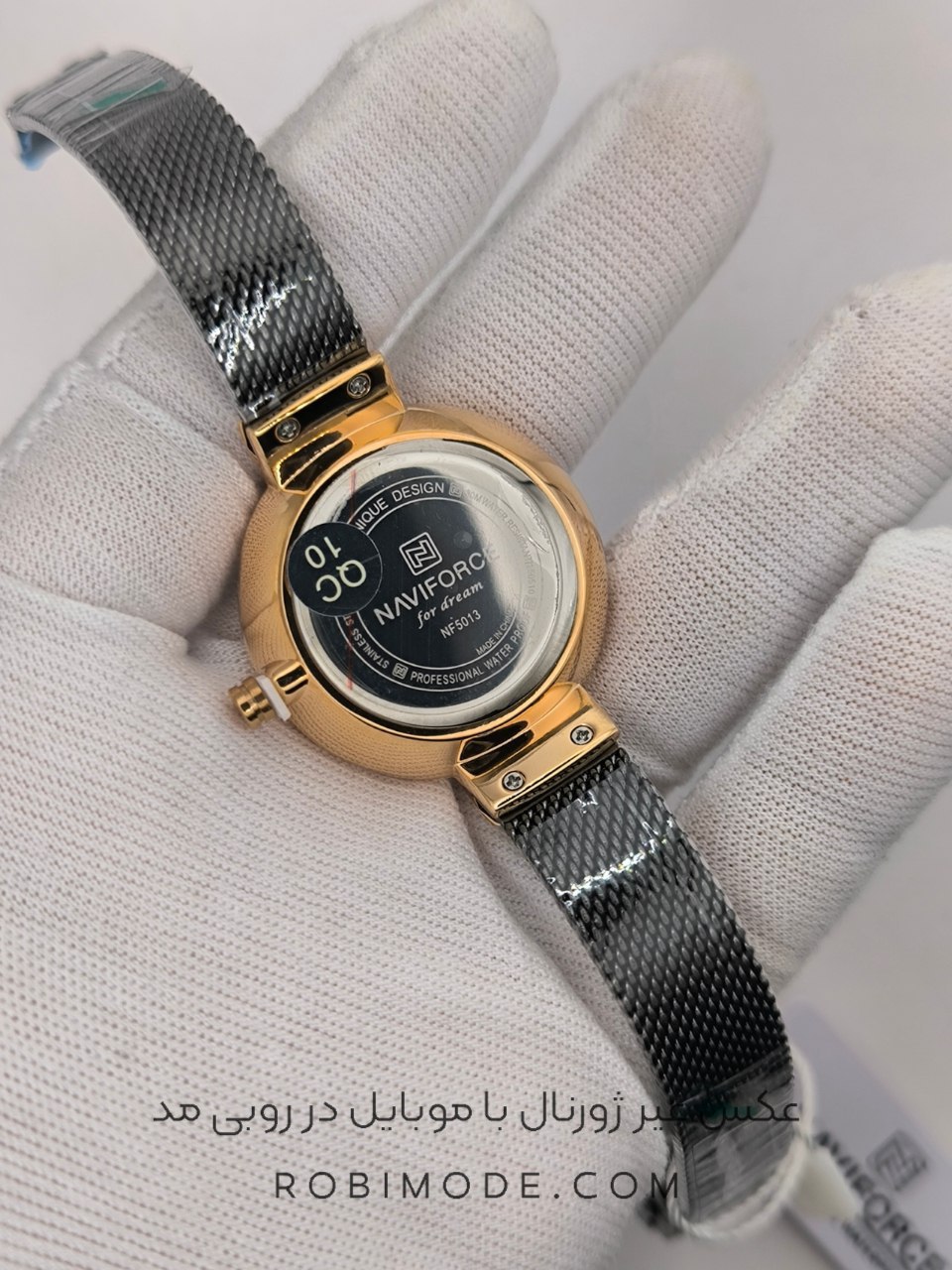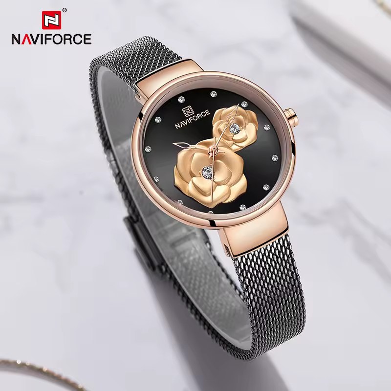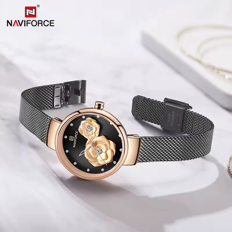 این ساعت مچی عقربهای زنانه نیوی فورس NAVIFORCE مدل Nf5013 طرح گل با طراحی ظریف و صفحه دایرهای مزین به گل و الماس یک انتخاب شیک و زنانه است که در فروشگاه اینترنتی روبی مد عرضه میشود و با موتور ژاپنی دقیق و قابلیت تقویم عملکردی قابل اعتماد ارائه میدهد و قاب استیل همراه با بند حصیری استیل رنگ ثابت جلوهای لوکس و ماندگار ایجاد میکند و شیشه معدنی ضد خش از صفحه محافظت میکند و بند ضد حساسیت پوستی راحتی استفاده روزانه را بالا میبرد و عقربه شبنما خوانایی ساعت را در نور کم حفظ میکند و این مدل ضد آب بوده و همراه با جعبه و کارت گارانتی اورجینال ارائه میشود تا یک انتخاب کامل برای استایل روزمره و مجلسی باشد..