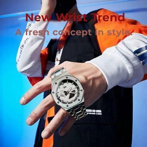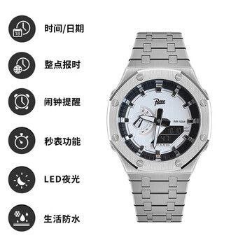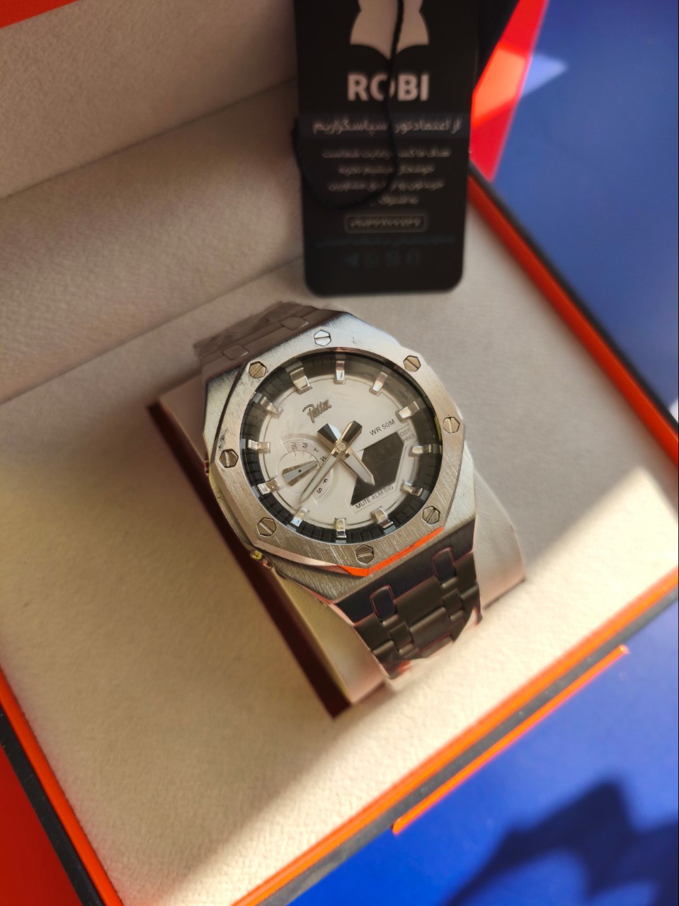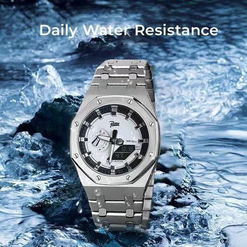 ساعت مچی مردانه پتک Patta مدل 1816 SIWT اورجینال با نمایشگر دوگانه آنالوگ و دیجیتال انتخابی شیک و کاربردی برای آقایان خاص پسند است. این ساعت با بند استیل ضدزنگ توپُر سنگین درجه یک و رنگ بند استیل در کنار صفحه سفید و فرم صفحه گرد جلوه ای لوکس و مردانه دارد. صفحه و عقربه های شب تاب به همراه نور پس زمینه LED خوانایی عالی در شب فراهم می کنند و شیشه ضد خط و خش دوام بالای آن را تضمین می کند. امکاناتی مانند آلارم تایمر ساعت جهانی قفل پروانه ای خاص و مقاومت در برابر آب تا عمق 30 متر دقت و کارایی را همزمان ارائه می دهد و بند ضد حساسیت پوستی استفاده طولانی مدت را راحت می سازد. این مدل یک ساعت فوق العاده برای تو که فوق العاده ای و اکنون از فروشگاه اینترنتی روبی مد در دسترس است.