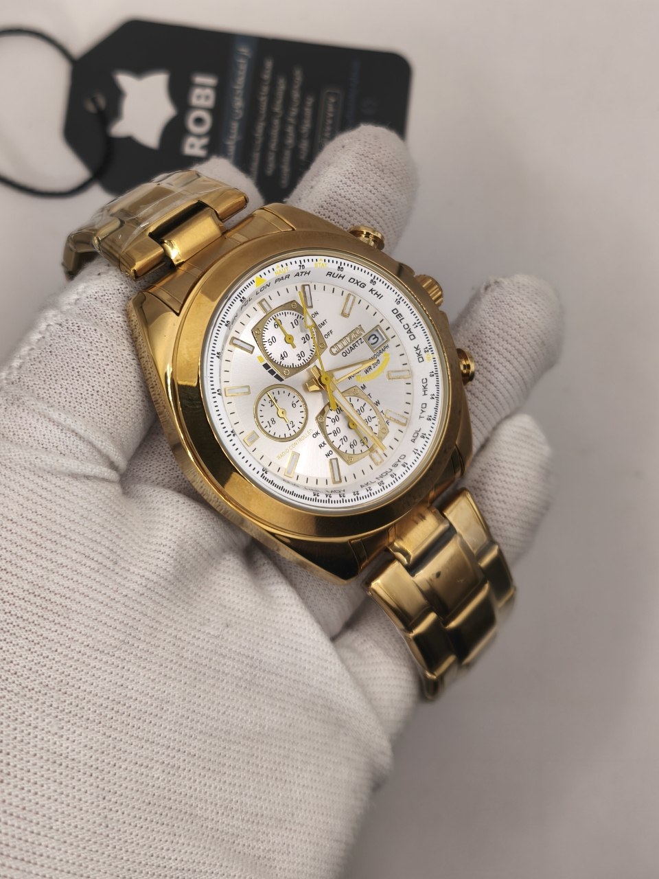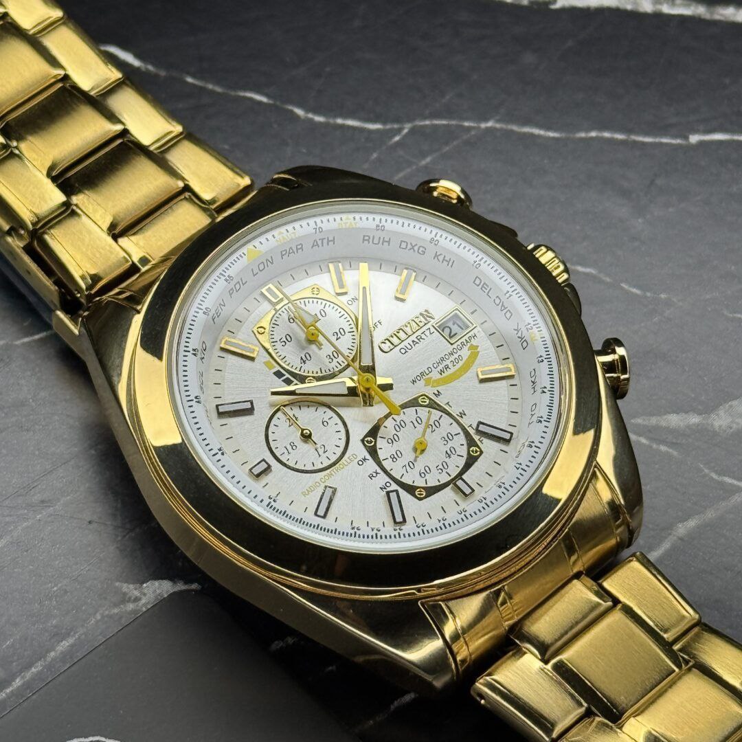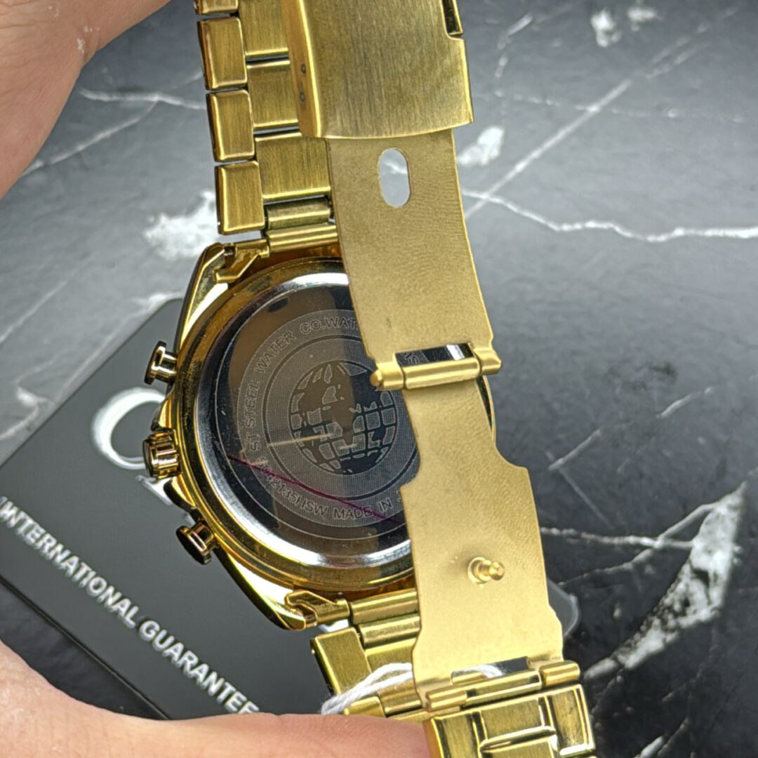 ساعت مچی مردانه کرنوگراف برند سیتیزن CITEZEN مدل 3310 سه موتوره طلایی انتخابی شیک برای استایل کژوال لوکس فشن و خلبانی است. این مدل با بند طلایی و صفحه سفید عرضه میشود و رنگهای دیگر نیز موجود است کافیست پیام دهید. مجهز به موتور کوارتز ژاپنی ارجینال با سه موتور فعال کرنوگراف تقویم دار شب نما و ضد آب صد درصد ضمانتی است. بدنه فول استیل رنگ ثابت با بند استیل توپر سنگین درجه یک ضد حساسیت پوستی قفل کلیپسی ضامن دار و فرم صفحه دایره دارد. شیشه معدنی ضد خش سافایر به همراه گارانتی و جعبه ارائه میشود و از فروشگاه اینترنتی روبی مد قابل تهیه است.