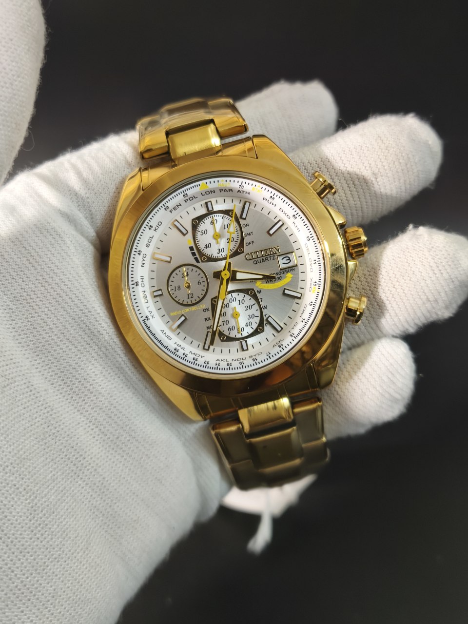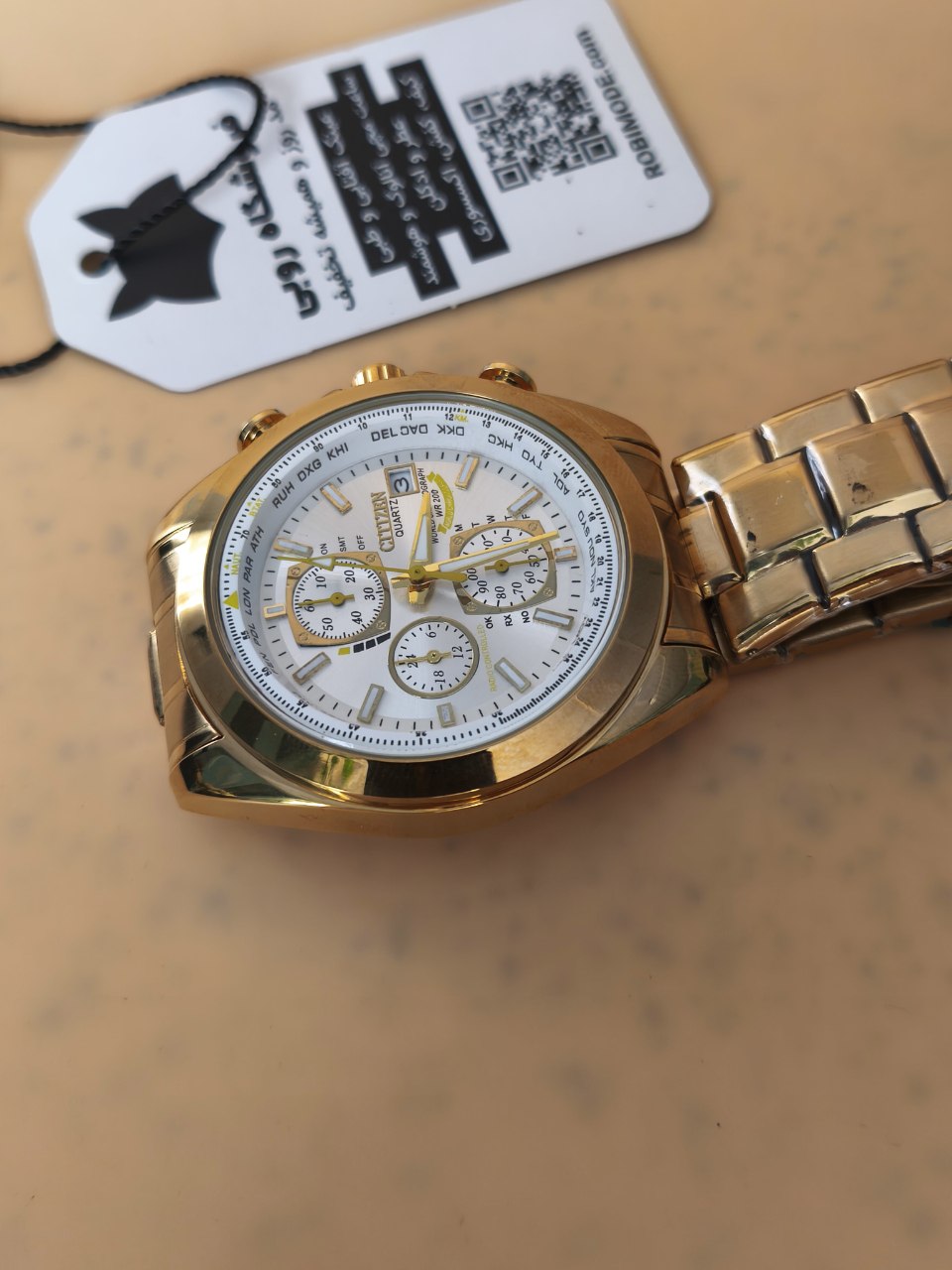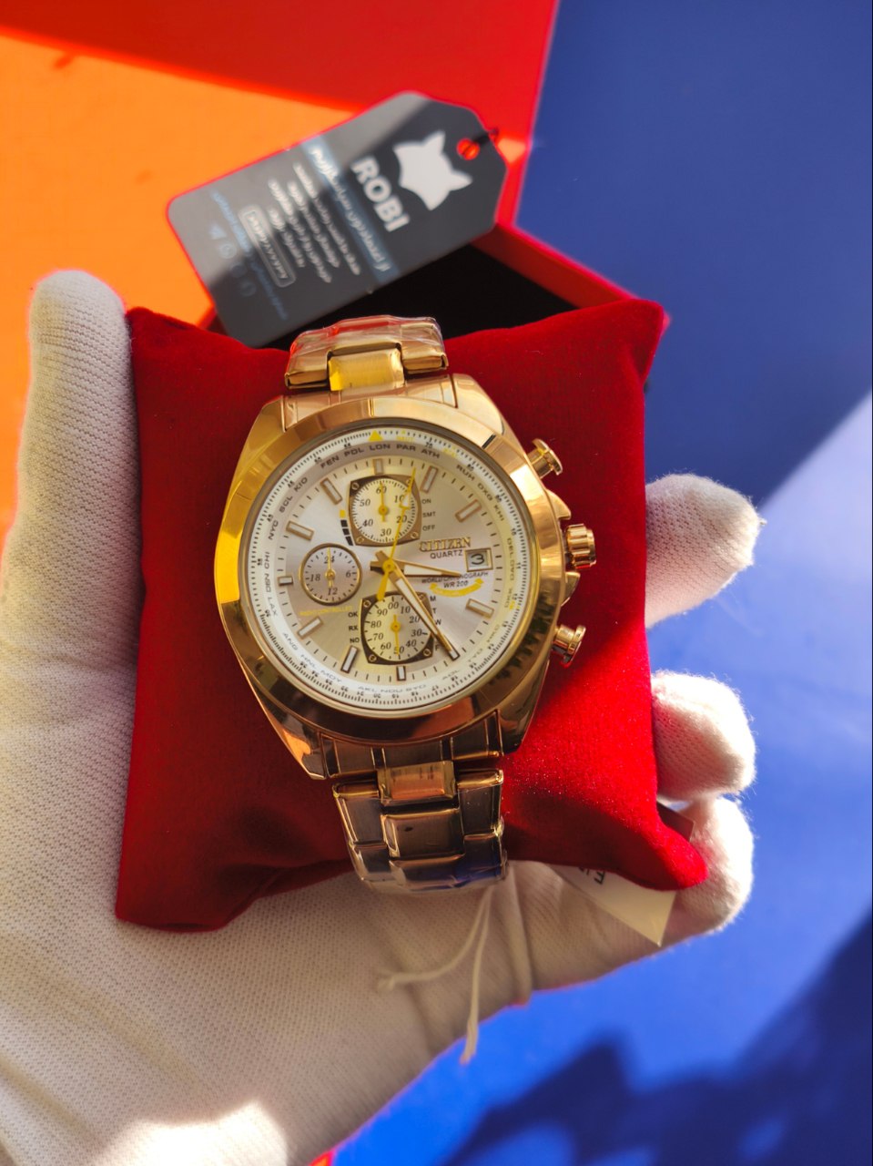 ساعت مچی مردانه کرنوگراف برند سیتیزن CITEZEN مدل 3310 سه موتوره طلایی انتخابی شیک برای استایل کژوال لوکس فشن و خلبانی است. این مدل با بند طلایی و صفحه سفید عرضه میشود و رنگهای دیگر نیز موجود است کافیست پیام دهید. مجهز به موتور کوارتز ژاپنی ارجینال با سه موتور فعال کرنوگراف تقویم دار شب نما و ضد آب صد درصد ضمانتی است. بدنه فول استیل رنگ ثابت با بند استیل توپر سنگین درجه یک ضد حساسیت پوستی قفل کلیپسی ضامن دار و فرم صفحه دایره دارد. شیشه معدنی ضد خش سافایر به همراه گارانتی و جعبه ارائه میشود و از فروشگاه اینترنتی روبی مد قابل تهیه است.