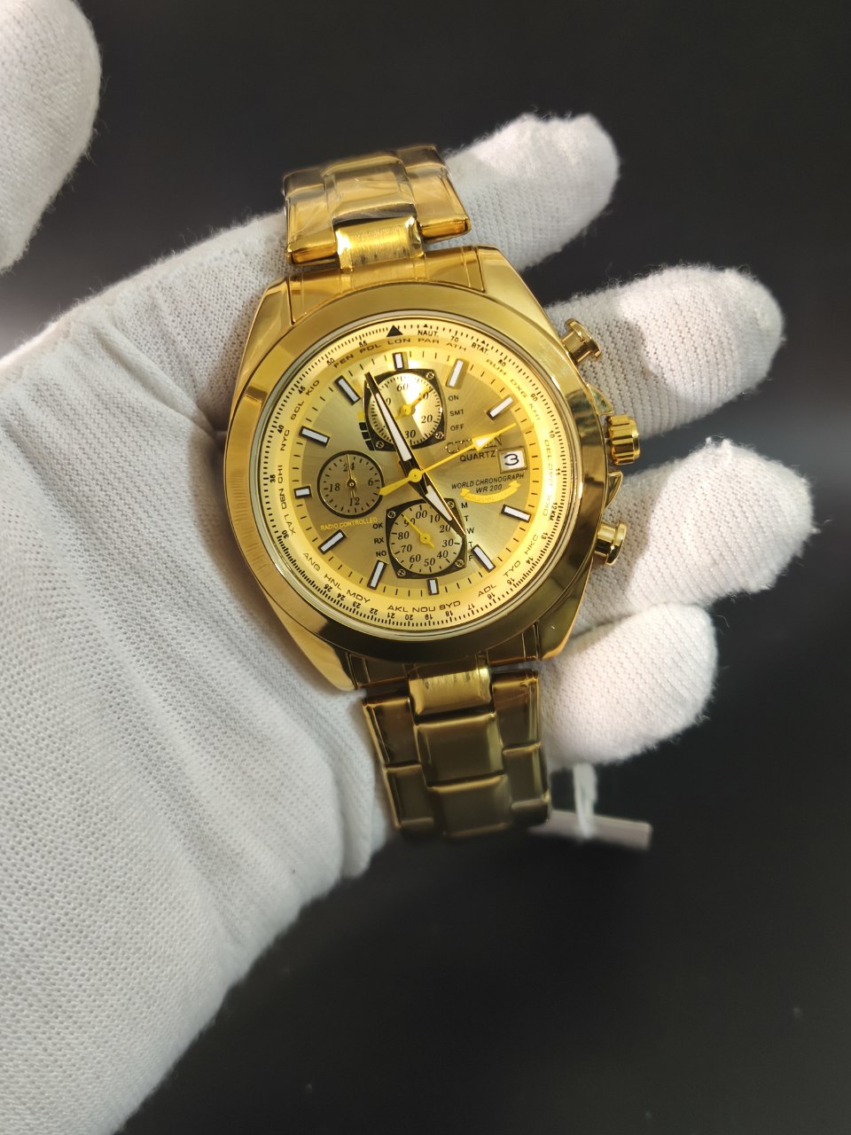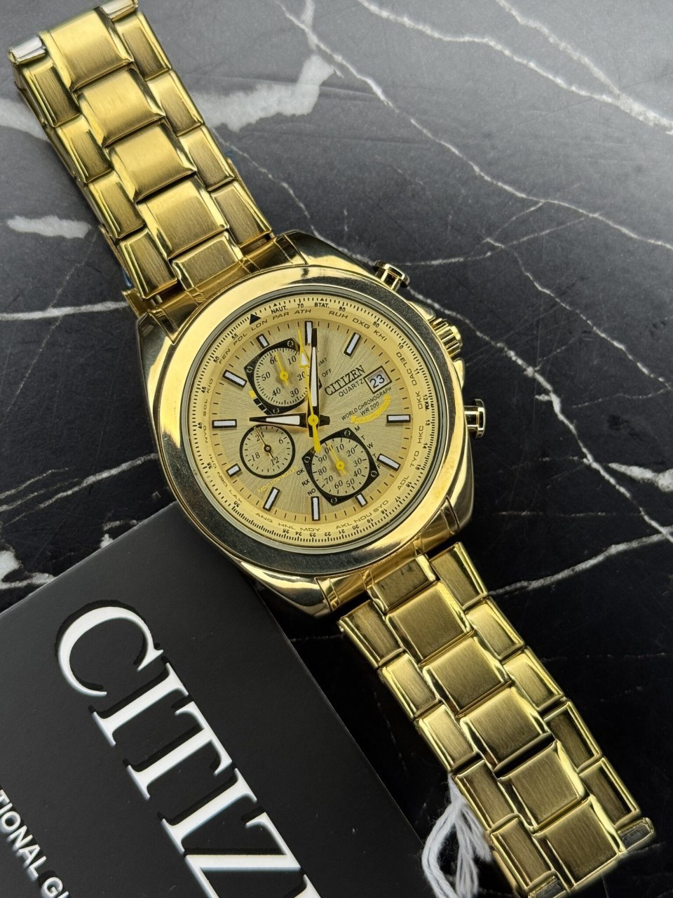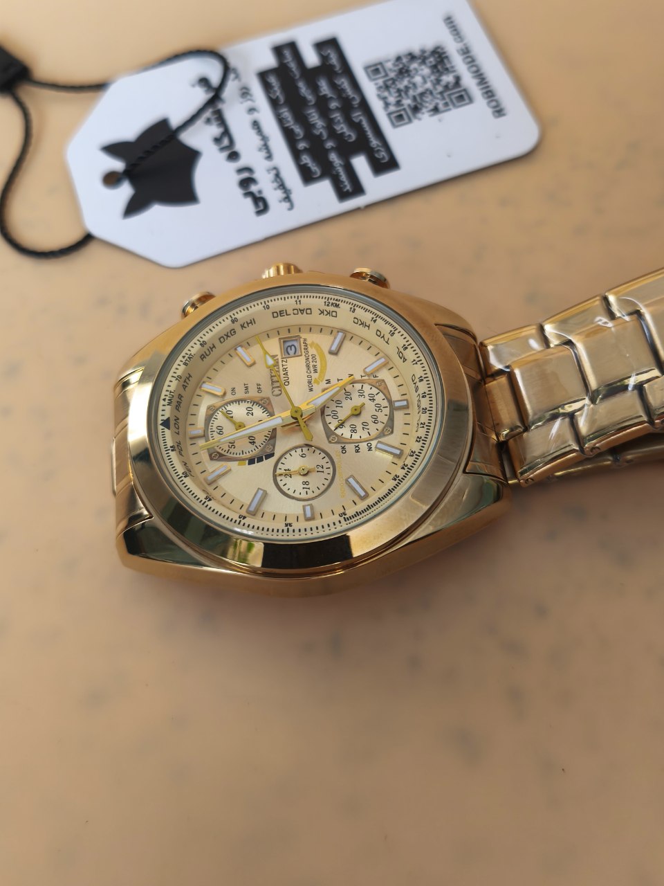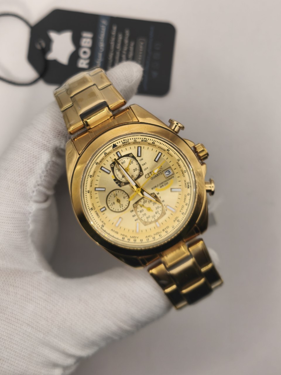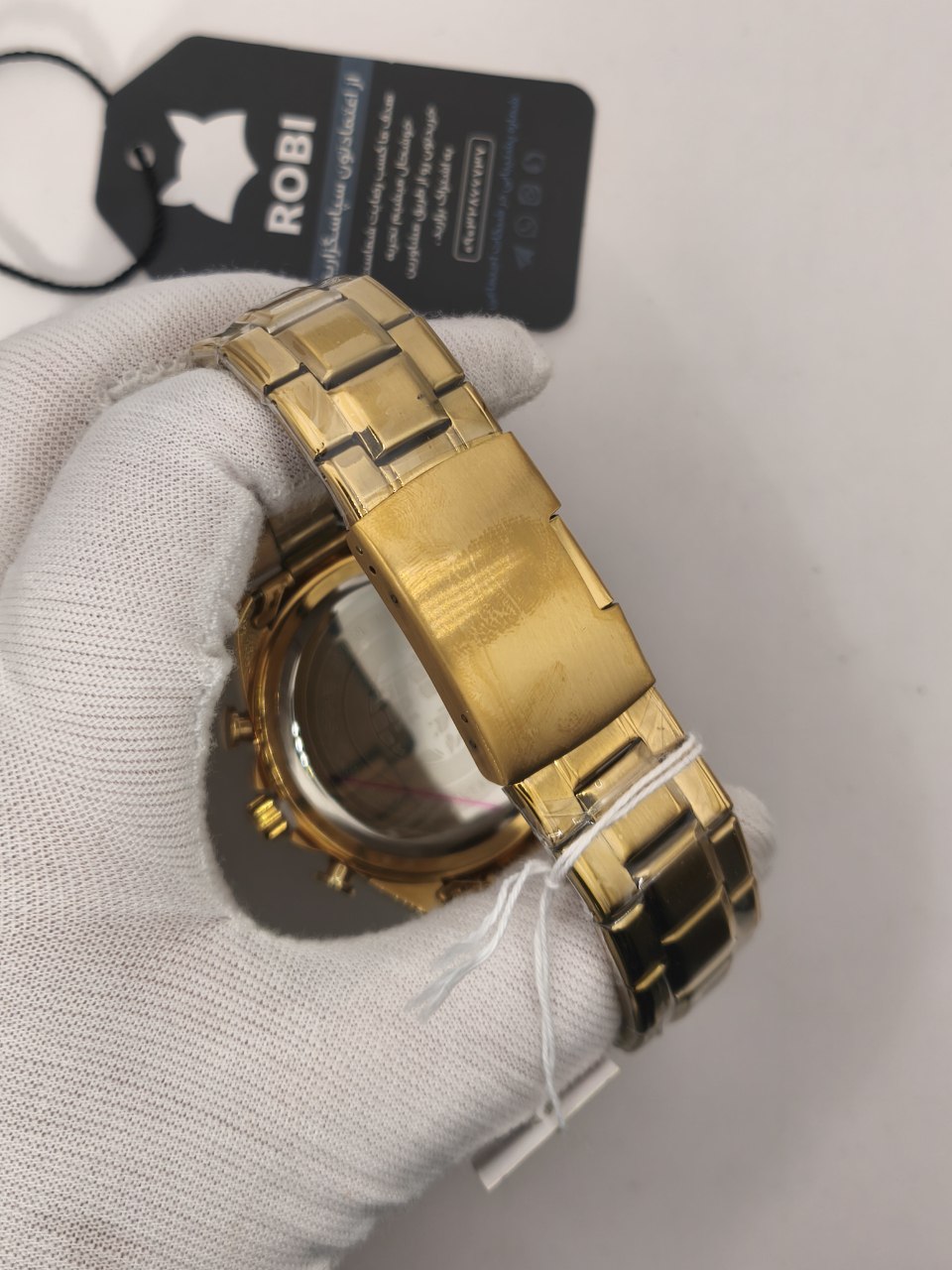 ساعت مچی مردانه کرنوگراف برند سیتیزن CITEZEN مدل 3310 سه موتوره طلایی انتخابی لوکس و شیک برای استایل کژوال فشن و خلبانی است این مدل با بند طلایی و صفحه طلایی عرضه میشود و رنگهای دیگر نیز موجود است کافیست پیام دهید مجهز به موتور کوارتز ژاپنی ارجینال با سه موتور فعال کرنوگراف تقویم دار شب نما و ضد آب صد درصد ضمانتی است بدنه فول استیل رنگ ثابت با بند استیل توپر سنگین درجه یک ضد حساسیت پوستی قفل کلیپسی ضامن دار و فرم صفحه دایره دارد شیشه معدنی ضد خش سافایر به همراه گارانتی و جعبه ارائه میشود و از فروشگاه اینترنتی روبی مد قابل تهیه است