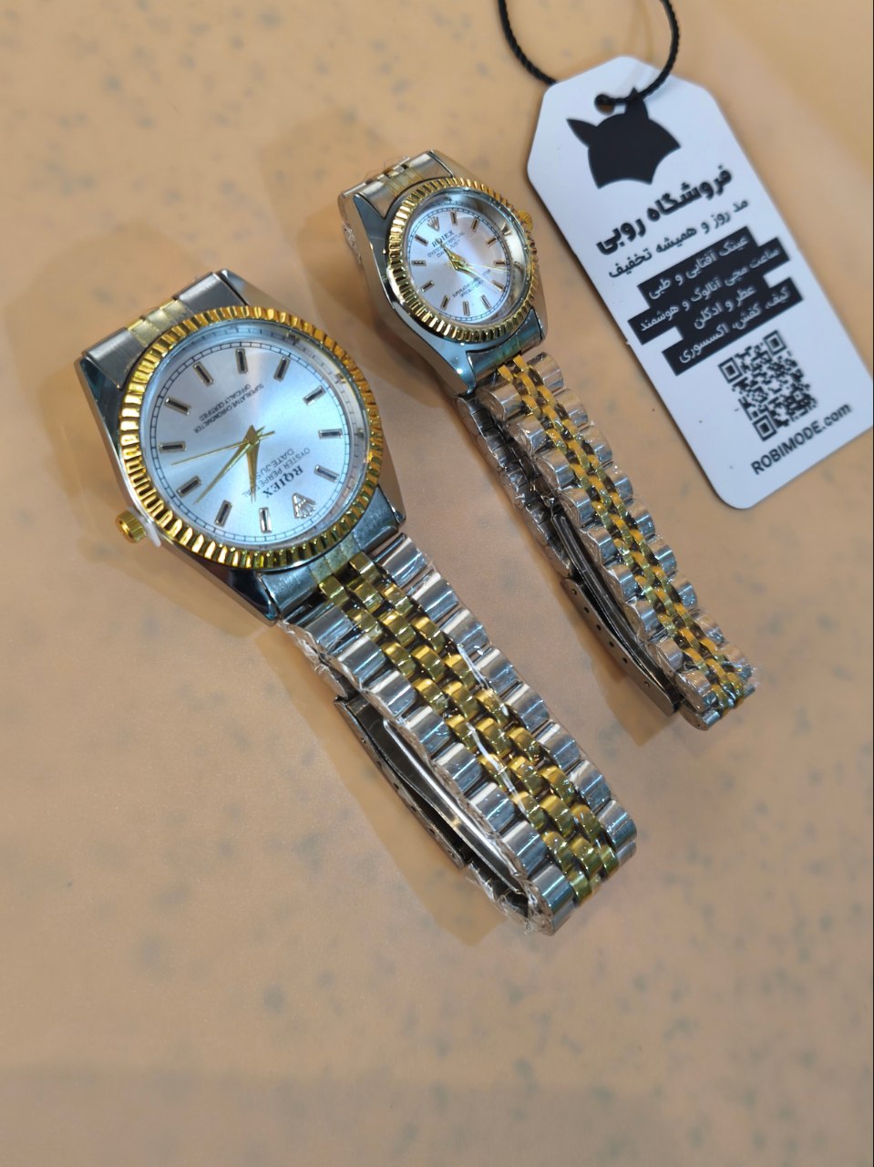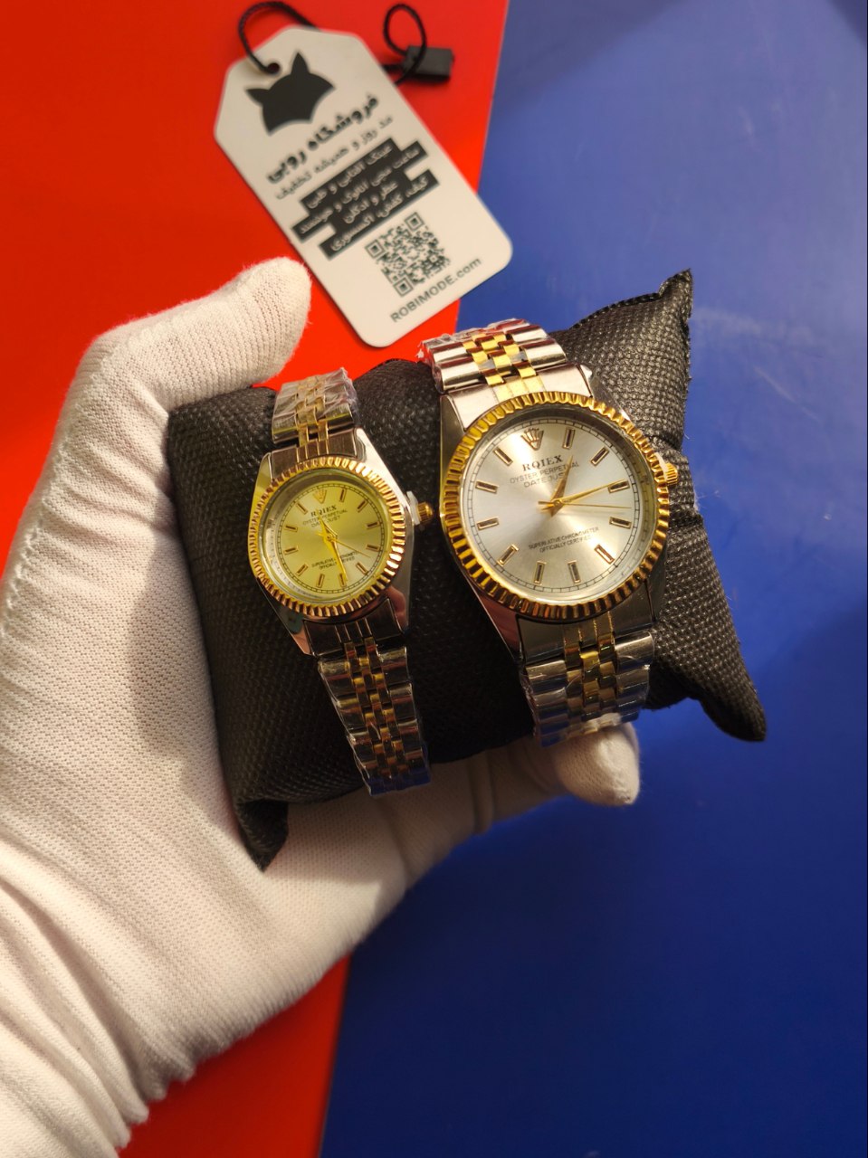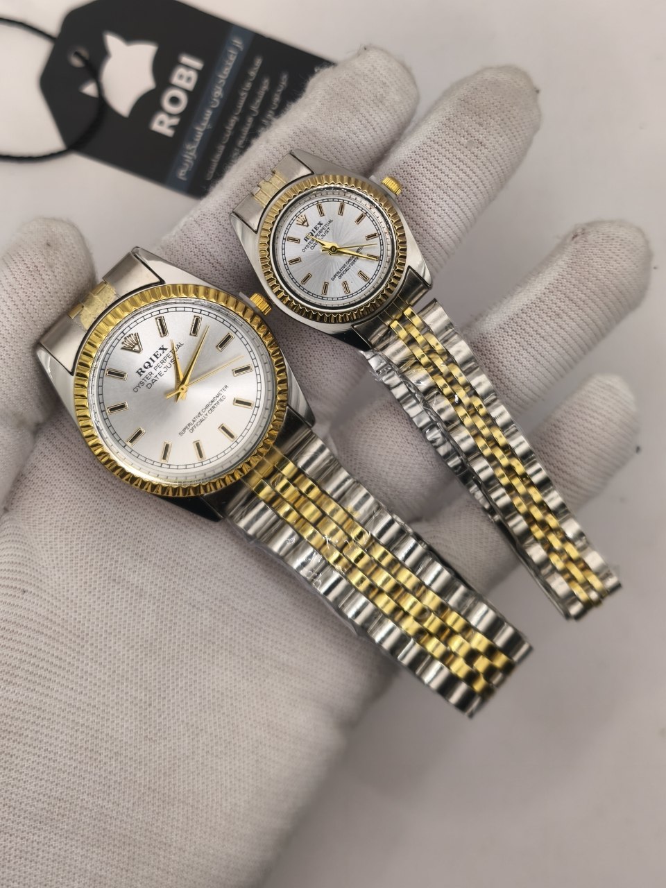 ست ساعت رولکس دیت جاست زنانه و مردانه ROLEX Date Just با کیفیت عالی و صفحه سفید انتخابی شیک و خاص برای استایل شماست. رنگ بند نقره ای رگه طلایی با صفحه سفید ارائه می شود و رنگ های دیگر نیز موجود است که در آخرین عکس قابل مشاهده بوده و برای دریافت کافی است پیام دهید. کیفیت ساخت درجه یک متفاوت با نمونه های بازاری در کنار موتور کوارتز دقیق دقت و دوام بالایی را فراهم می کند. بند استیل ضدزنگ قاب استیل رنگ ثابت قفل کلیپسی بند ضد حساسیت پوستی و صفحه سافایر ضد خش خیال شما را از بابت کیفیت راحت می کند. این ست یک گزینه عالی برای ست کردن است و از فروشگاه اینترنتی روبی مد قابل سفارش می باشد.