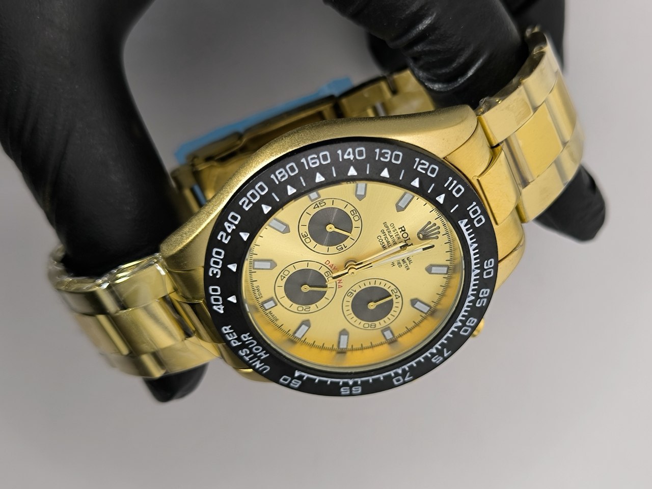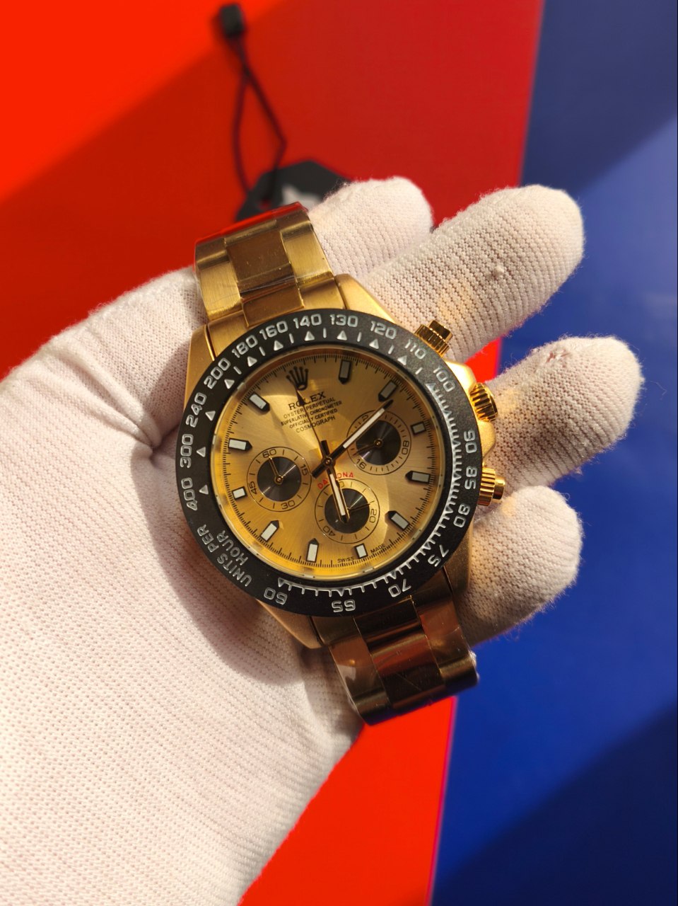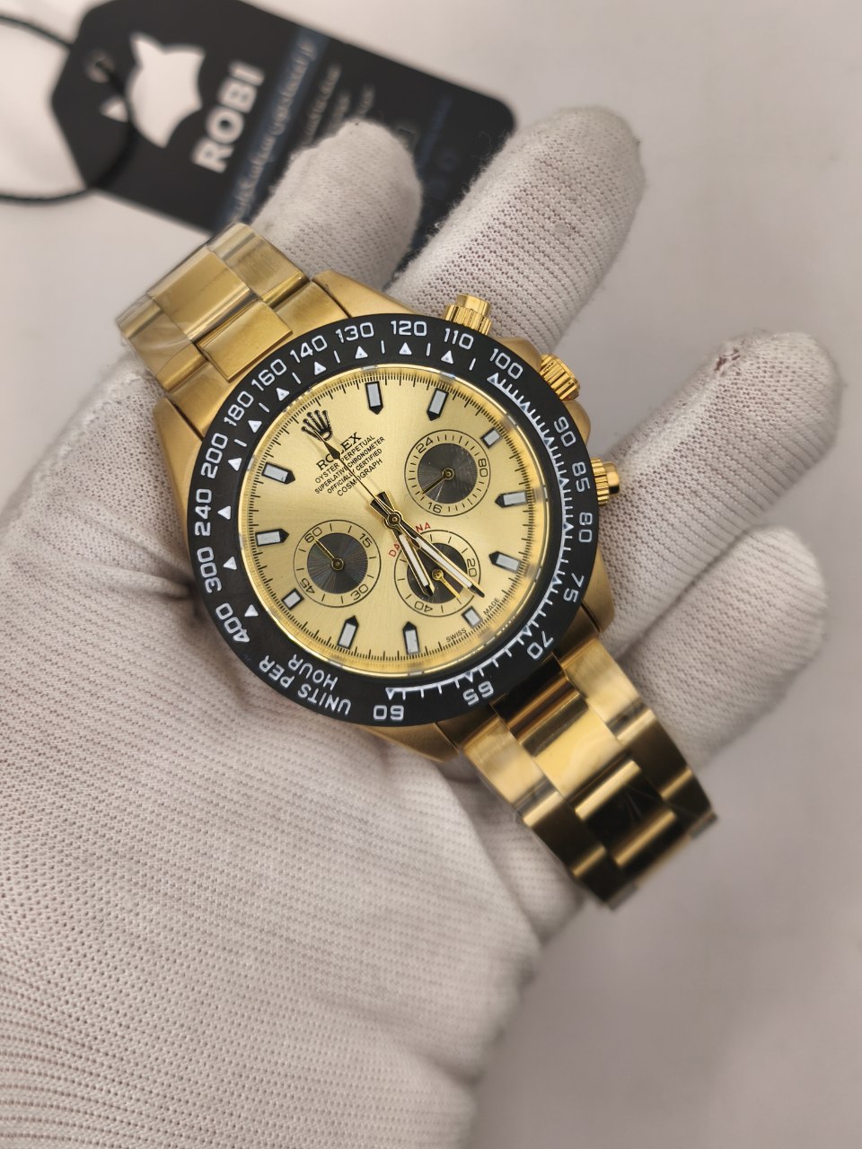 ساعت مچی مردانه کرنوگراف رولکس ديتونا ROLEX Daytona با کیفیت فوق العاده و صفحه طلایی انتخابی لوکس و جذاب است و رنگ بند طلایی با صفحه طلایی عرضه می شود و رنگ های دیگر نیز موجود است. کرنوگراف سه موتور فعال قفل رولکسی دو قفله قاب کربنی بند استیل رنگ ثابت روز شمار ضد آب تا عمق بالا شیشه کریستال ضد خش و تاچیمتر متفاوت ویژگی هایی منحصر به فرد ارائه می دهند. بند ضد حساسیت صفحه ضد خط و خش رنگ کوره ای باکیفیت و طراحی متفاوت با نمونه بازاری دوام و راحتی را تضمین می کند. این ساعت فوق العاده خاص و جذاب یک گزینه عالی برای ست کردن است و هم اکنون از فروشگاه اینترنتی روبی مد قابل سفارش است.