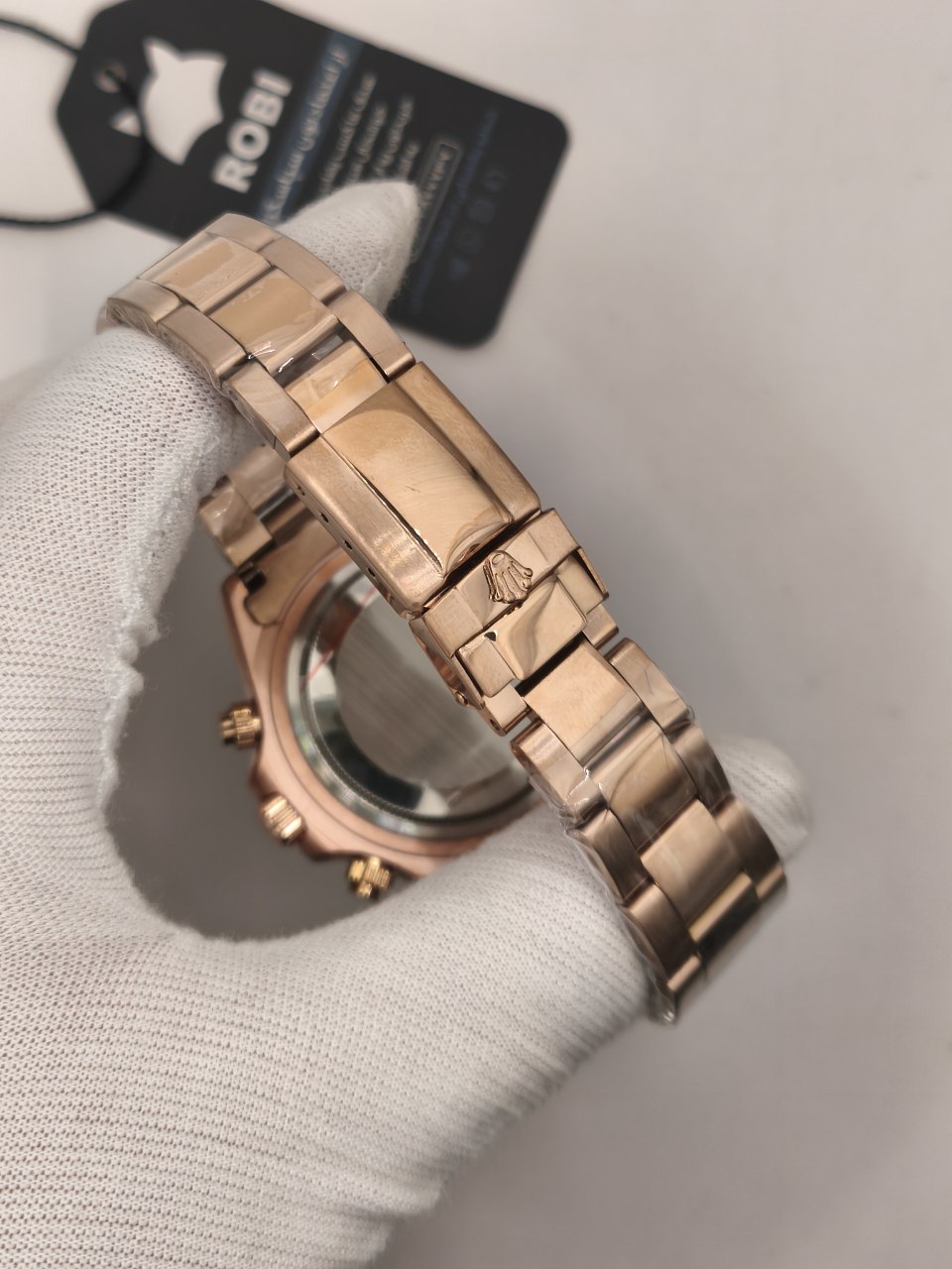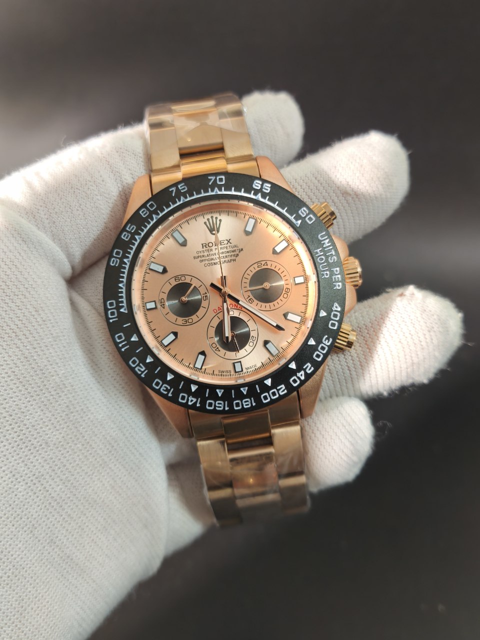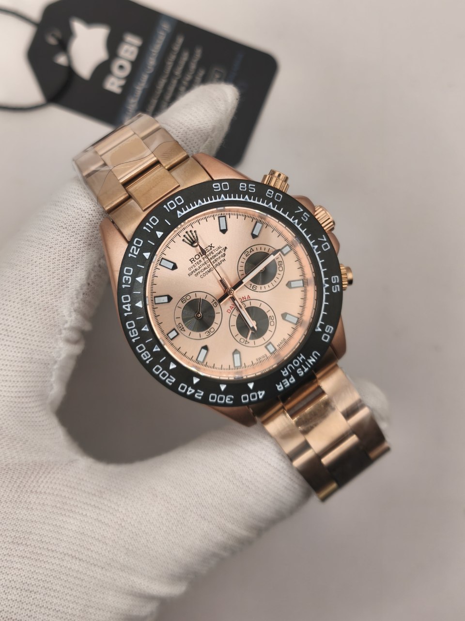ساعت مچی مردانه کرنوگراف رولکس ديتونا ROLEX Daytona با کیفیت فوق العاده و رنگ بند و صفحه رزگلد خاص انتخابی لوکس و جذاب است و رنگ های دیگر نیز موجود است که در آخرین عکس قابل مشاهده است. کرنوگراف سه موتور فعال قفل رولکسی دو قفله قاب کربنی بند استیل رنگ ثابت روز شمار ضد آب تا عمق بالا شیشه کریستال ضد خش و تاچیمتر متفاوت ویژگی هایی منحصر به فرد ارائه می دهند. بند ضد حساسیت صفحه ضد خط و خش رنگ کوره ای باکیفیت و طراحی متفاوت با نمونه بازاری دوام و راحتی را تضمین می کند. این ساعت فوق العاده خاص و جذاب یک گزینه عالی برای ست کردن است و هم اکنون از فروشگاه اینترنتی روبی مد قابل سفارش است.