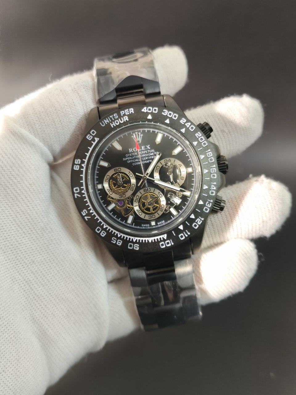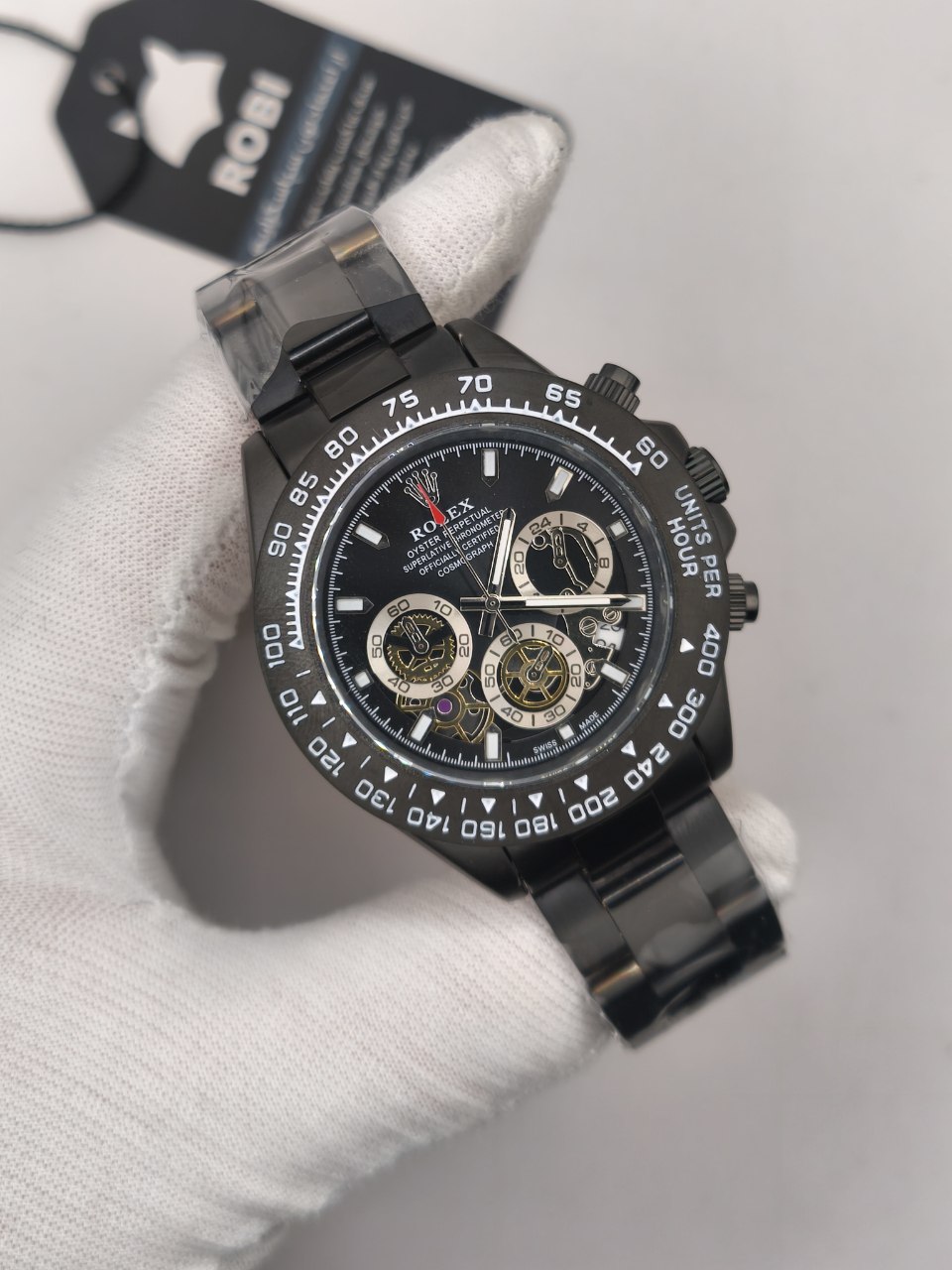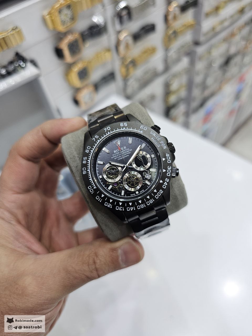 ساعت مچی مردانه کرنوگراف رولکس ديتونا ROLEX Daytona فول بلاک با کیفیت فوق العاده و رنگ بند مشکی و صفحه مشکی انتخابی لوکس و جذاب است و رنگ های دیگر نیز موجود است که در آخرین عکس قابل مشاهده است. کرنوگراف سه موتور فعال قفل رولکسی دو قفله قاب کربنی بند استیل رنگ ثابت روز شمار ضد آب شیشه کریستال ضد خش و تاچیمتر متفاوت ویژگی هایی منحصر به فرد ارائه می دهند. بند ضد حساسیت صفحه ضد خط و خش رنگ کوره ای باکیفیت و طراحی متفاوت با نمونه بازاری دوام و راحتی را تضمین می کند. این ساعت فوق العاده خاص و جذاب یک گزینه عالی برای ست کردن است و هم اکنون از فروشگاه اینترنتی روبی مد قابل سفارش است.