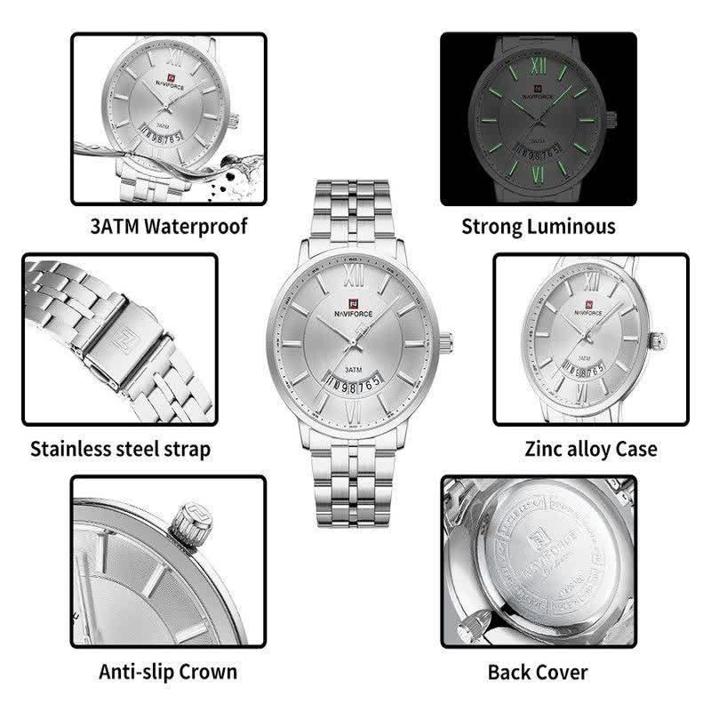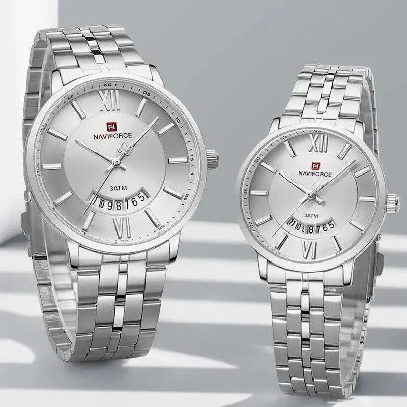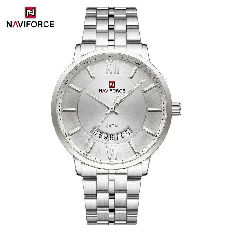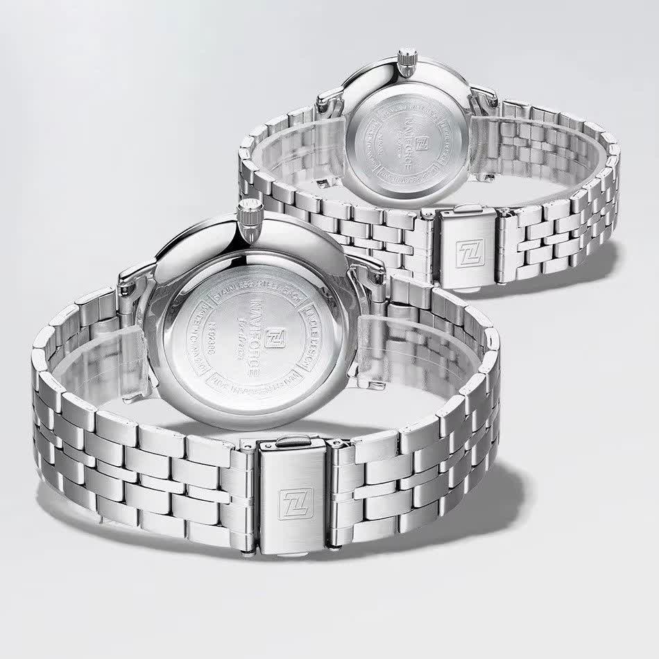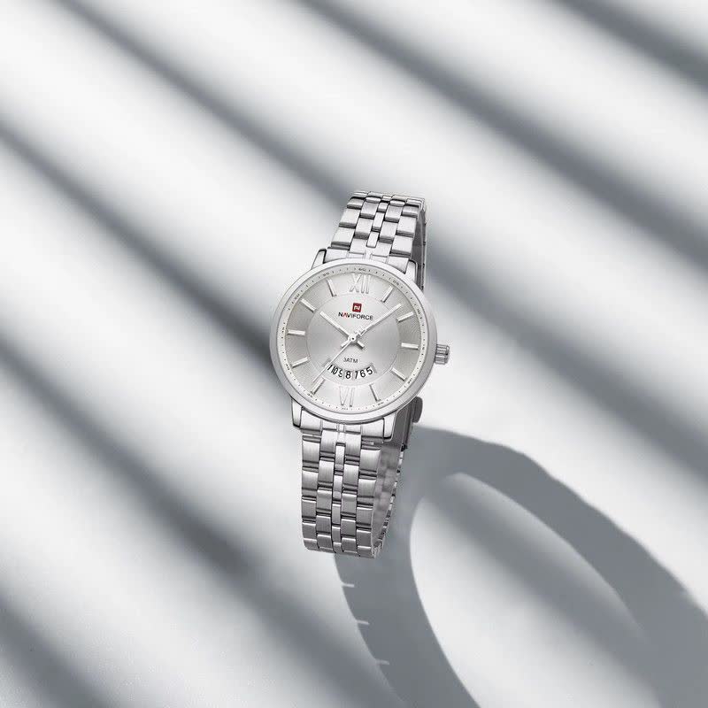 ساعت مچی عقربه ای زنانه نیوی فورس NAVIFORCE مدل NF9238 با ارائه فروشگاه اینترنتی روبی مد انتخابی شیک و کاربردی برای بانوان خوش سلیقه است. این ساعت ارجینال با کارت گارانتی و جعبه عرضه می شود و از موتور ژاپن کوارتز دقیق بهره می برد. قاب و بند استیل رنگ ثابت با صفحه سفید جلوه ای مدرن ایجاد کرده و بند ضد حساسیت به همراه قفل کلیپسی ضامن دار راحتی استفاده را تضمین می کند. شیشه معدنی ضد خش عقربه شب نما تقویم دار بودن و فرم صفحه دایره ای از دیگر ویژگی های آن است. این مدل ضد آب بوده و مناسب هر سلیقه و استایلی طراحی شده است.