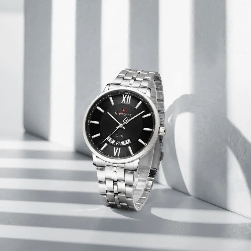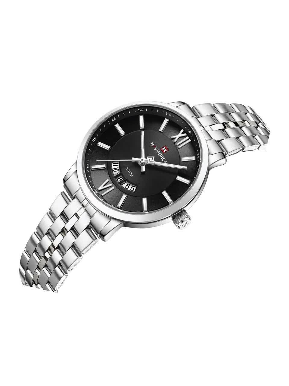 ساعت مچی عقربه ای زنانه نیوی فورس NAVIFORCE مدل NF9238 با موتور ژاپن کوارتز و صفحه مشکی انتخابی شیک و خاص برای بانوان است که توسط فروشگاه اینترنتی روبی مد عرضه می شود. این محصول ارجینال به همراه کارت گارانتی و جعبه ارائه شده و دارای قاب و بند استیل رنگ ثابت با طراحی ظریف است. شیشه معدنی ضد خش به همراه عقربه شب نما و تقویم کارایی بالایی در استفاده روزمره ایجاد می کند. بند ضد حساسیت پوستی با قفل کلیپسی ضامن دار راحتی و ایمنی را تضمین می کند. این ساعت با فرم صفحه دایره ای ضد آب بوده و مناسب هر سلیقه و استایلی است.