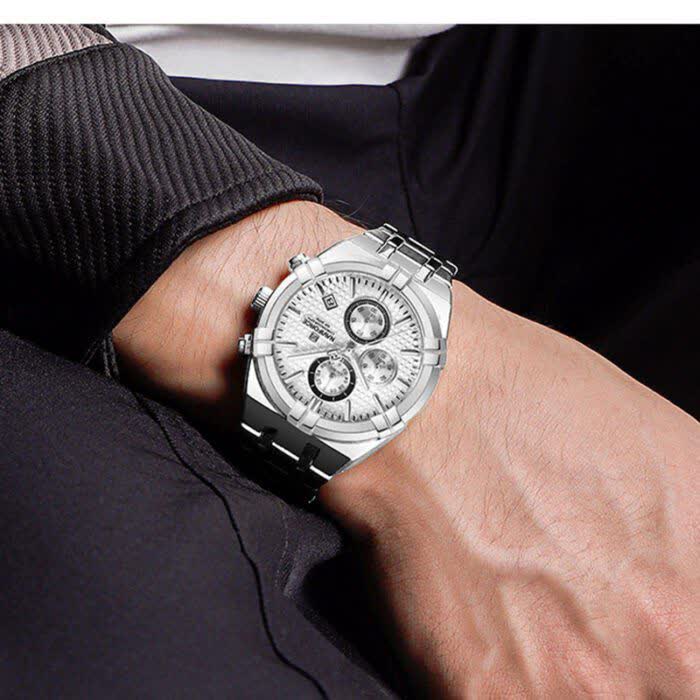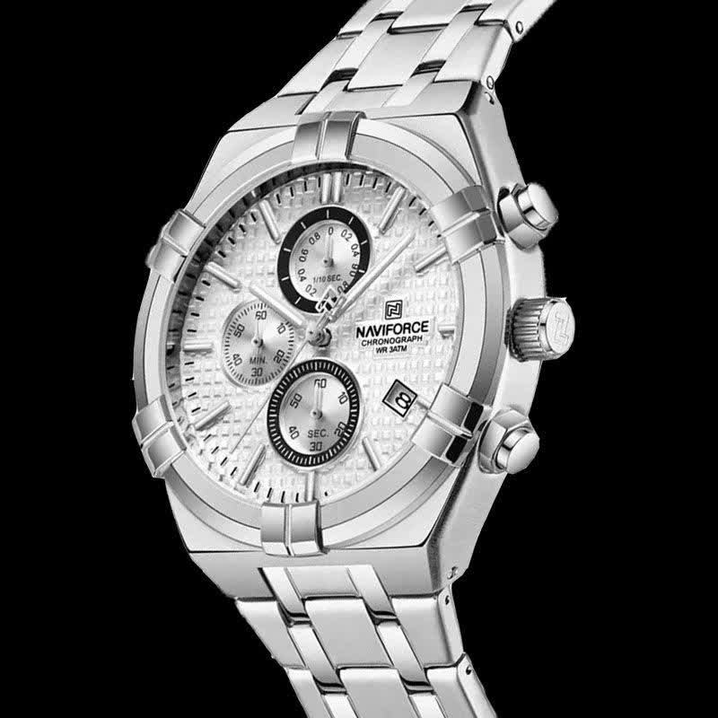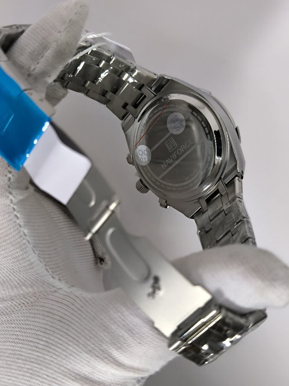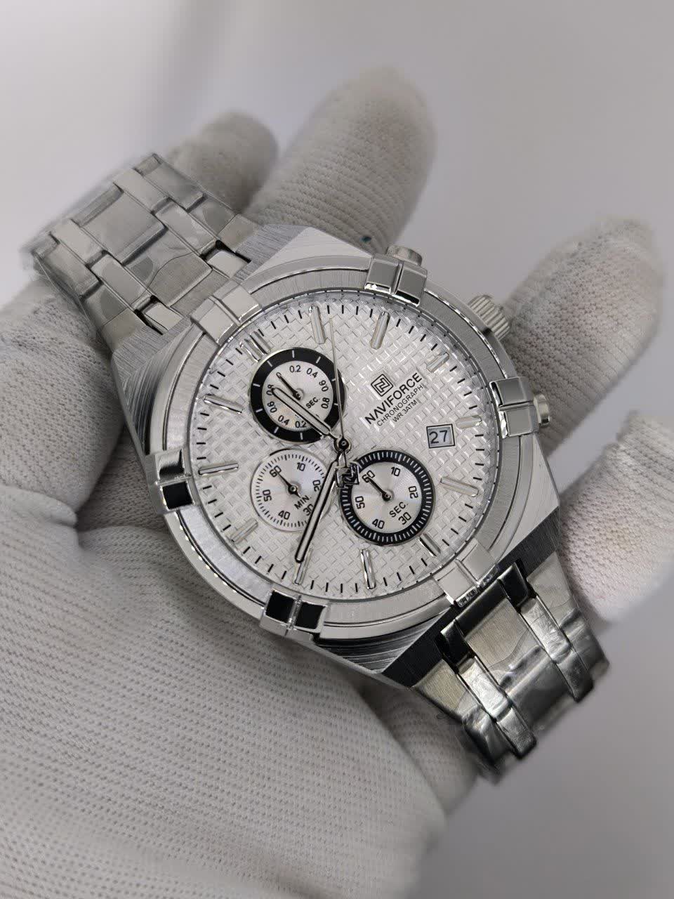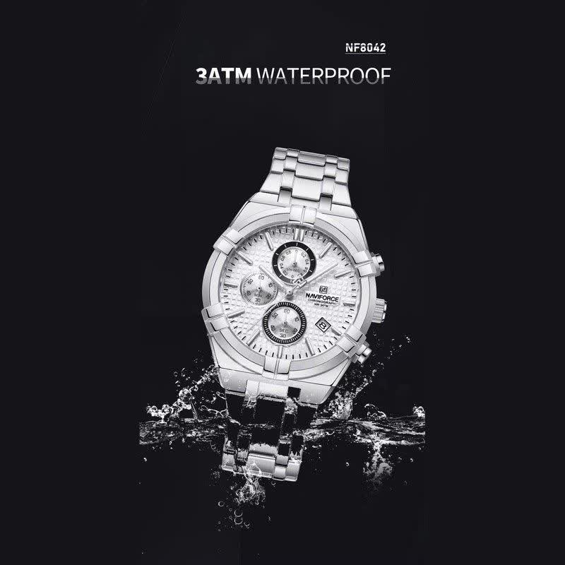 ساعت مچی کرنوگراف مردانه نیوی فورس NAVIFORCE مدل NF8042 اورجینال استیل انتخابی خاص و قدرتمند برای آقایان خوش سلیقه است که توسط فروشگاه اینترنتی روبی مد عرضه می شود. این ساعت سه موتوره کرنوگراف با موتور ژاپن و تقویم دار بوده و دارای قاب و بند استیل توپُر رنگ ثابت با صفحه سفید و فرم دایره ای می باشد. شیشه معدنی ضد خش به همراه عقربه شب تاب خوانایی بالایی در هر شرایط نوری ایجاد می کند. بند ضد حساسیت پوستی با قفل کلیپسی ضامن دار راحتی و ایمنی را تضمین می کند. این مدل ضد آب بوده و مناسب افراد خاص پسند و متفاوت طراحی شده است.