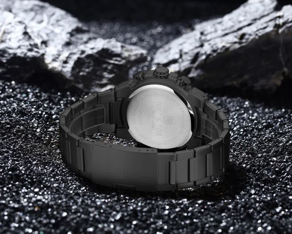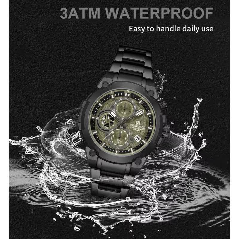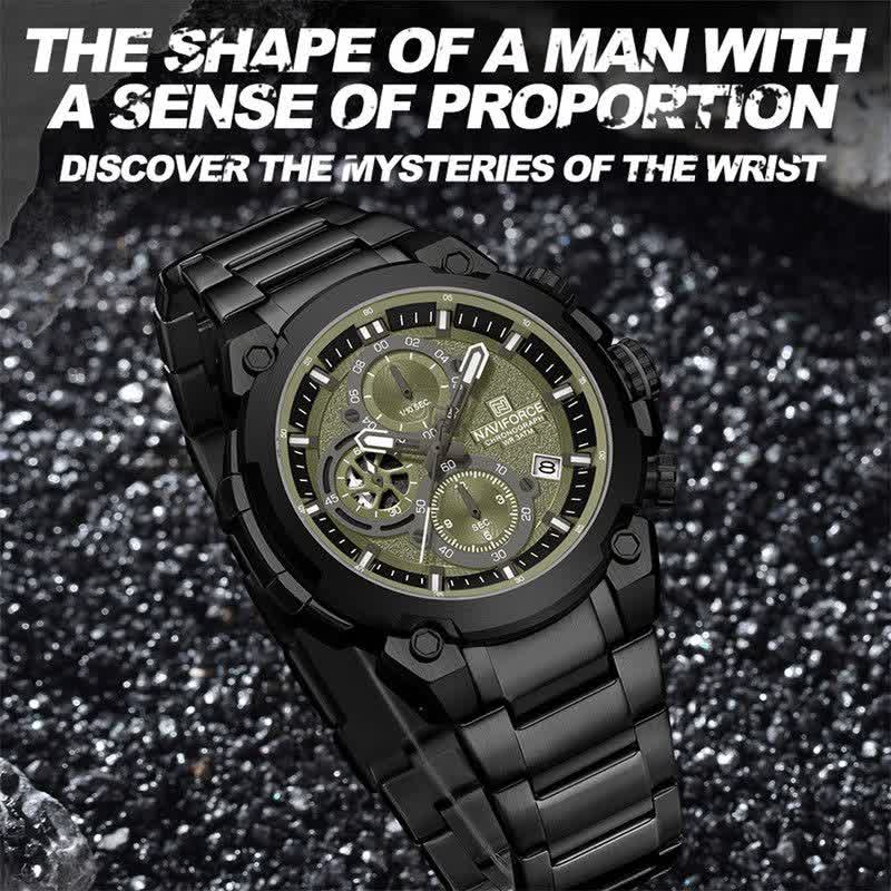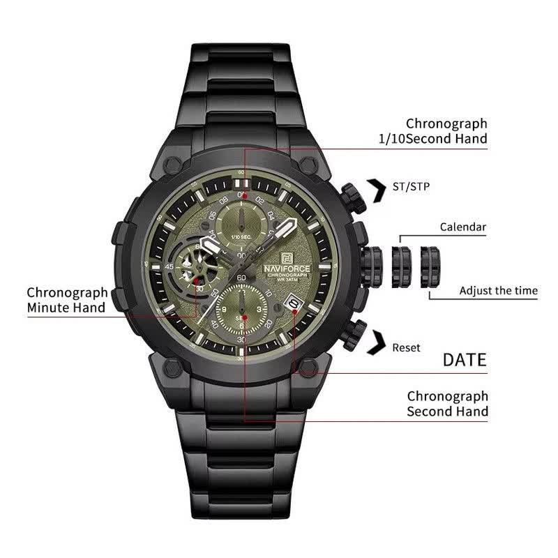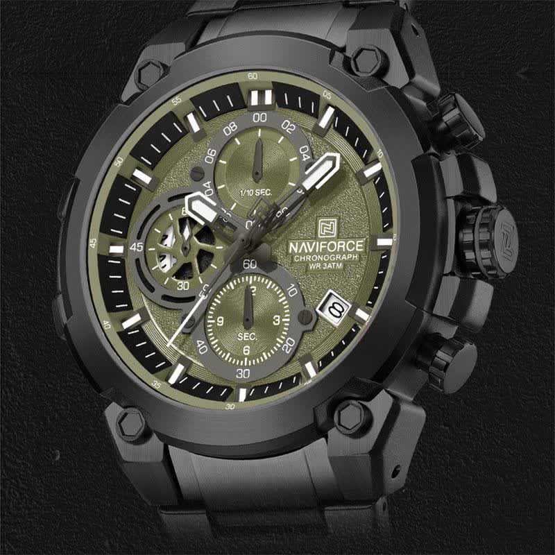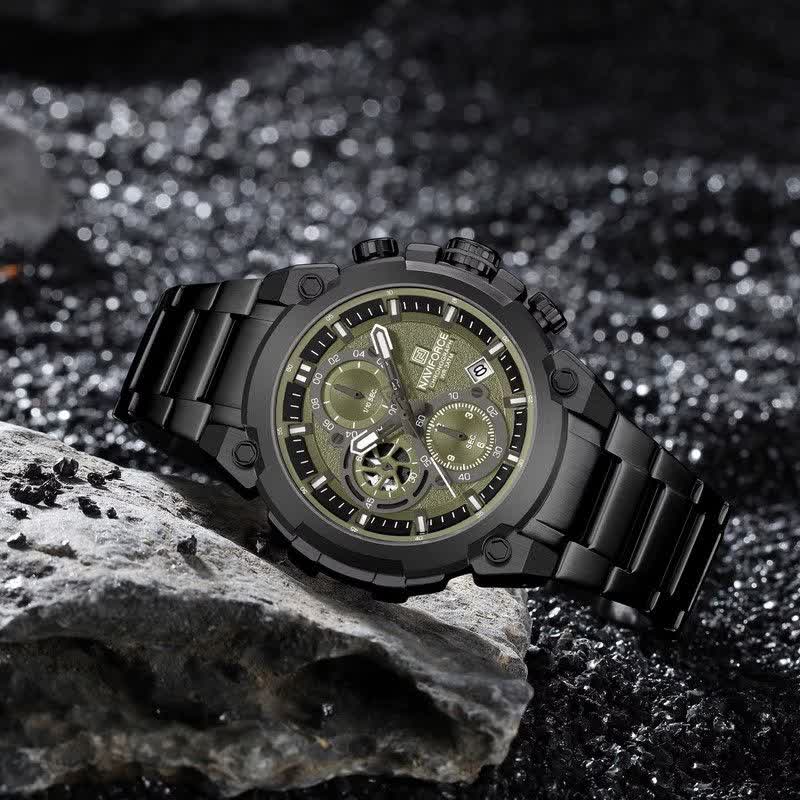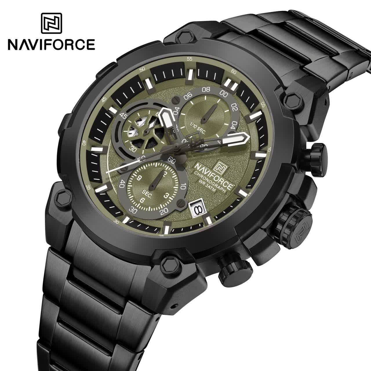 ساعت مچی کرنوگراف مردانه نیوی فورس NAVIFORCE مدل NF8071 با موتور ژاپن و طراحی جذاب انتخابی متفاوت برای آقایان شیک پوش است که توسط فروشگاه اینترنتی روبی مد ارائه می شود. این ساعت سه موتوره کرنوگراف و تقویم دار بوده و دارای قاب استیل و بند استیل توپُر رنگ ثابت با صفحه سبز تیره و فرم دایره ای می باشد. شیشه معدنی ضد خش در کنار عقربه شب تاب خوانایی عالی را در شب و روز فراهم می کند. بند ضد حساسیت پوستی با قفل کلیپسی ضامن دار راحتی و امنیت استفاده را تضمین می کند. این مدل ضد آب بوده و لحظات دوست داشتنی را با این ساعت تجربه خواهید کرد.