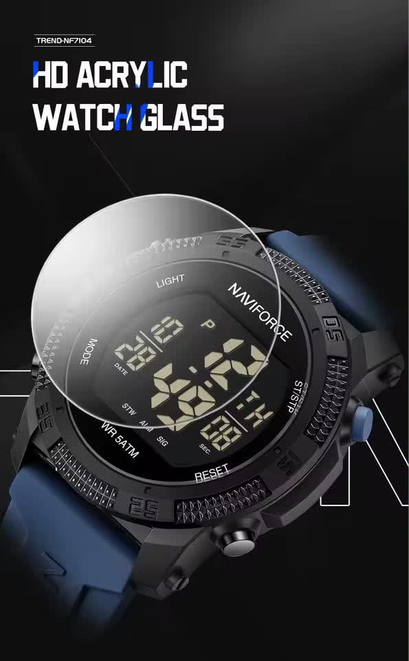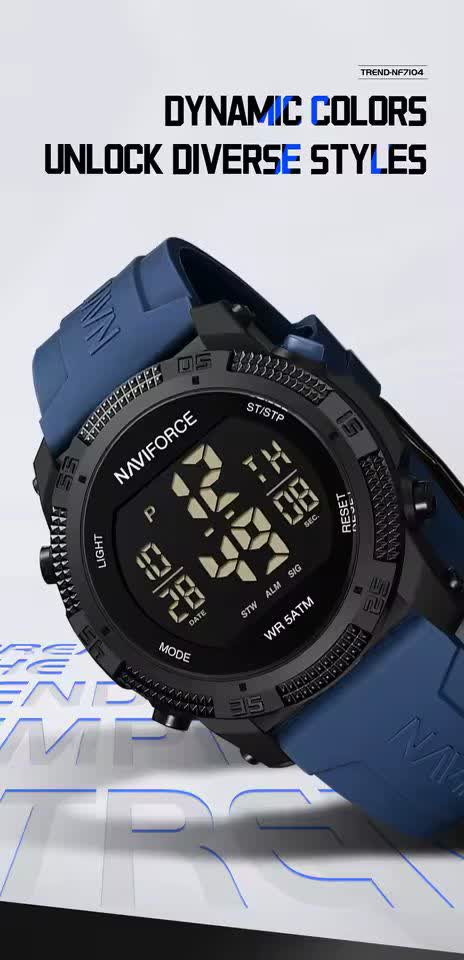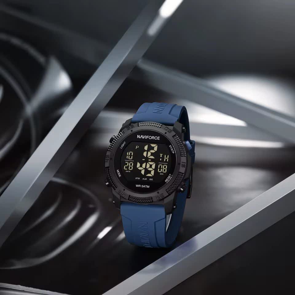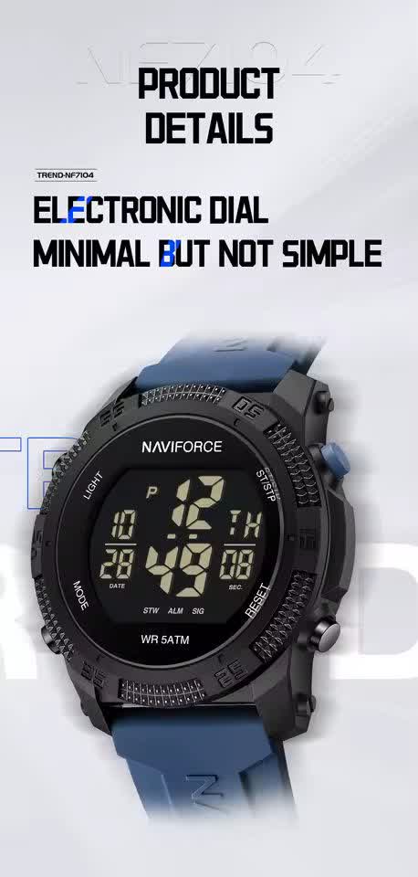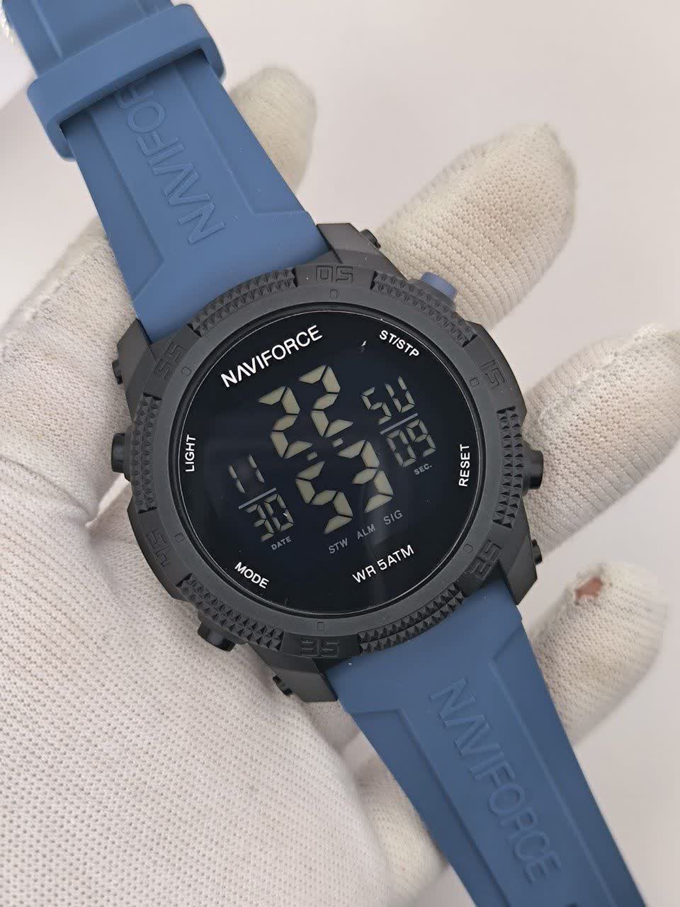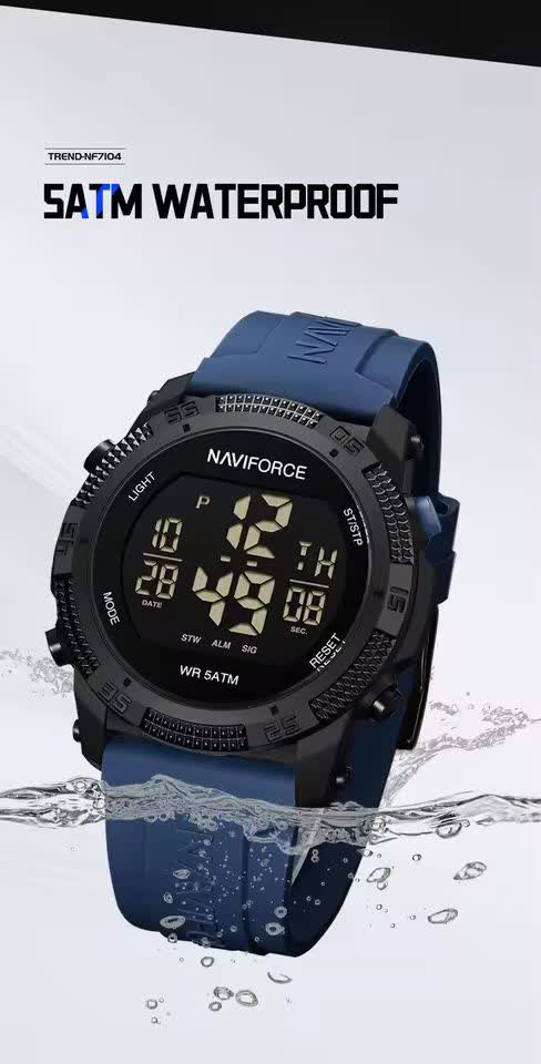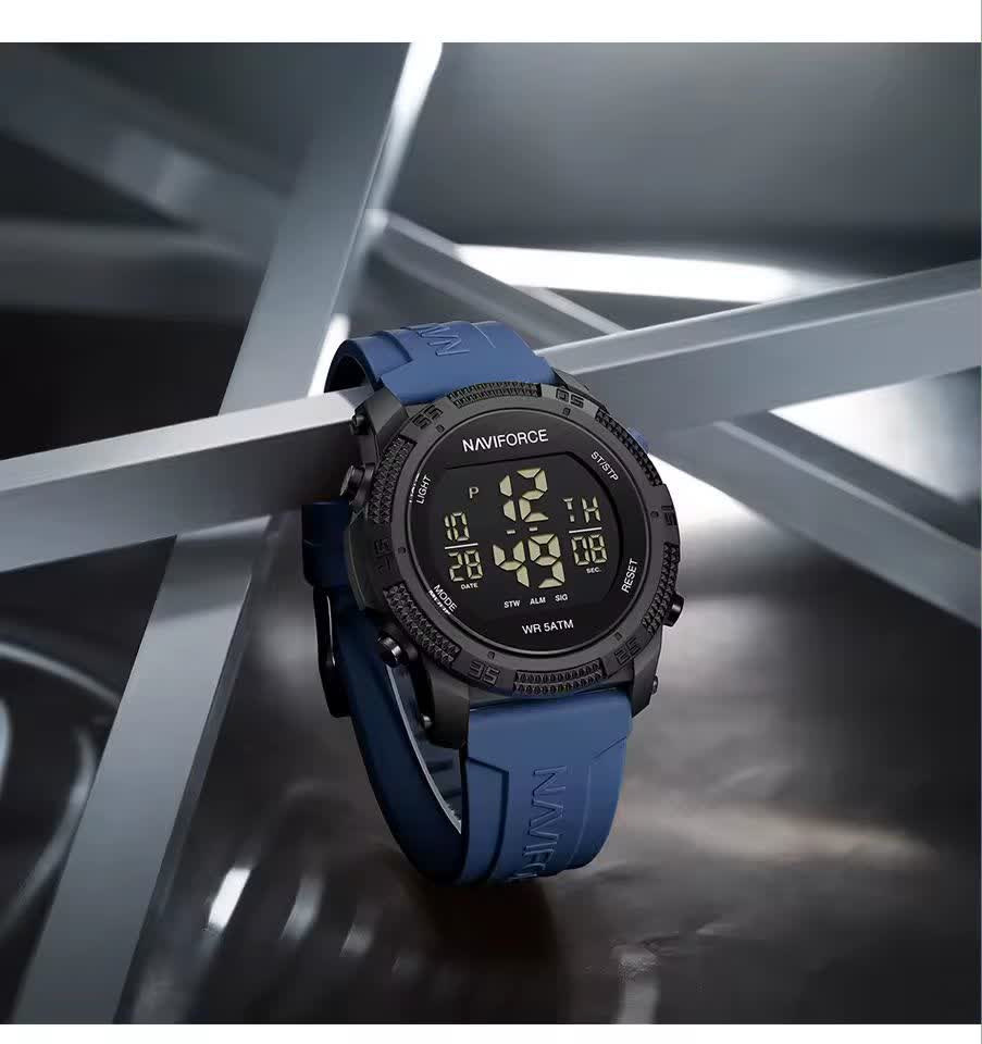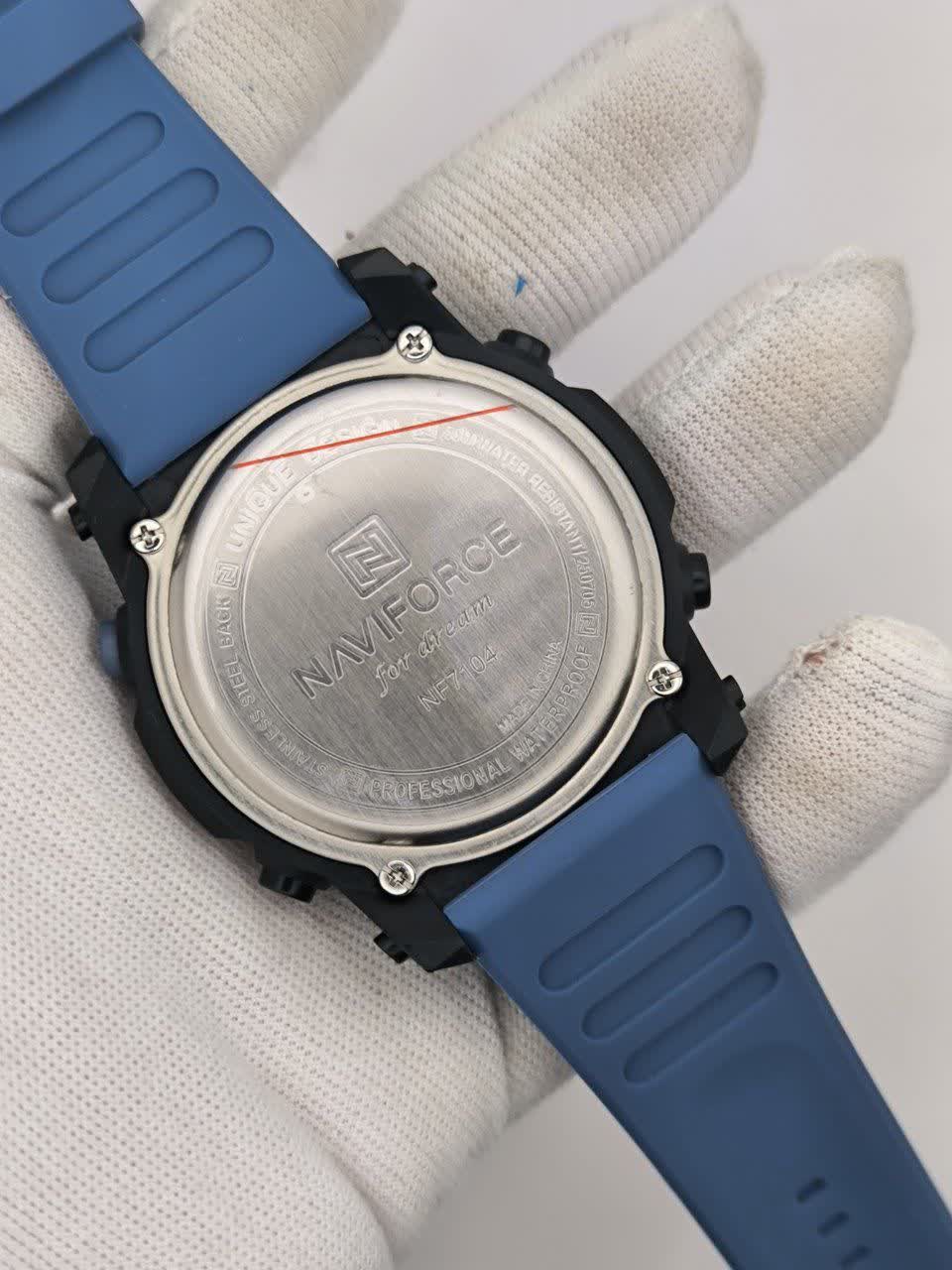 ساعت مچی مردانه دیجیتال نیوی فورس NAVIFORCE مدل NF7104 با طراحی اسپرت و خاص توسط فروشگاه اینترنتی روبی مد عرضه می شود. این مدل ارجینال با کارت گارانتی و جعبه دارای موتور ژاپن کوارتز بوده و امکاناتی مانند کرنومتر تایمر تقویم ثانیه شمار و صفحه چراغ دار را ارائه می دهد. بند رابر سرمه ای ضد حساسیت با قفل کمربندی سوزنی در کنار شیشه معدنی ضد خش و قابلیت ضد آب بودن این ساعت را به یکی از خاص ترین های نیوی فورس برای استفاده روزمره تبدیل کرده است.