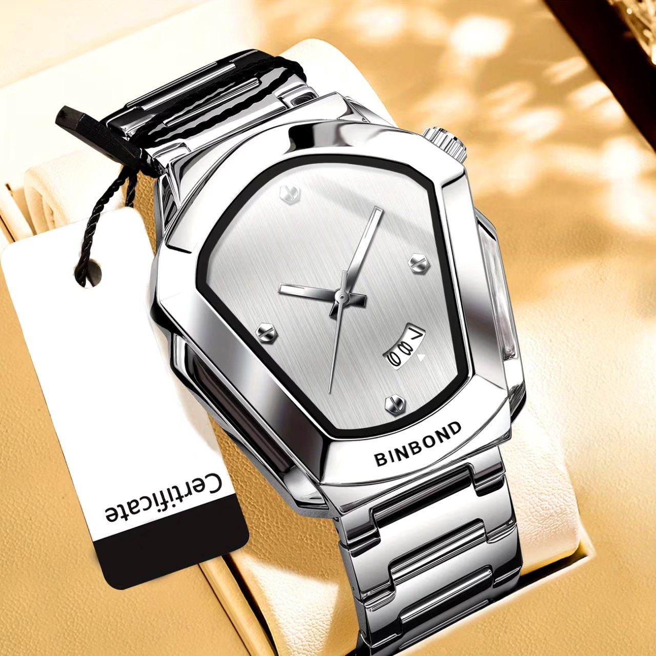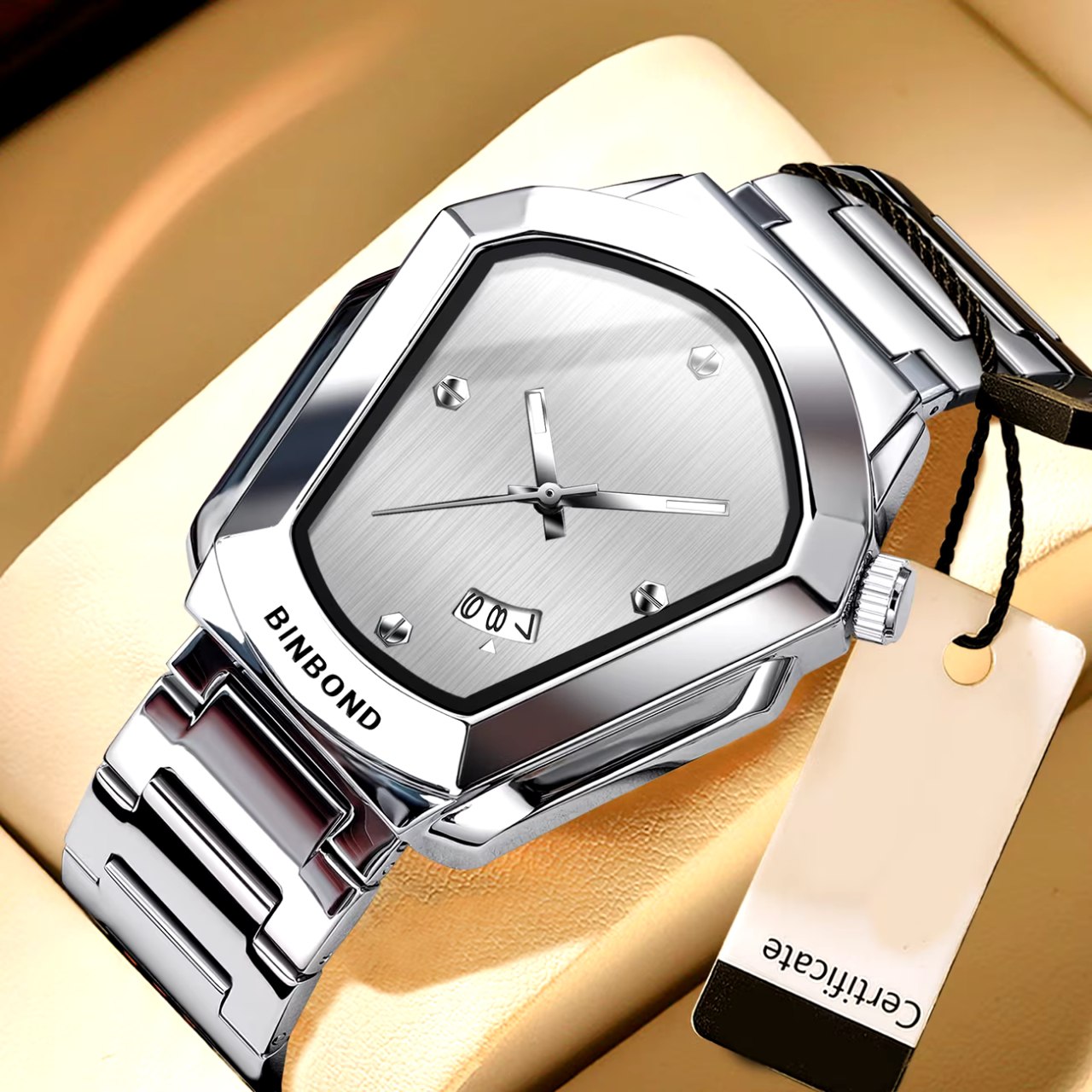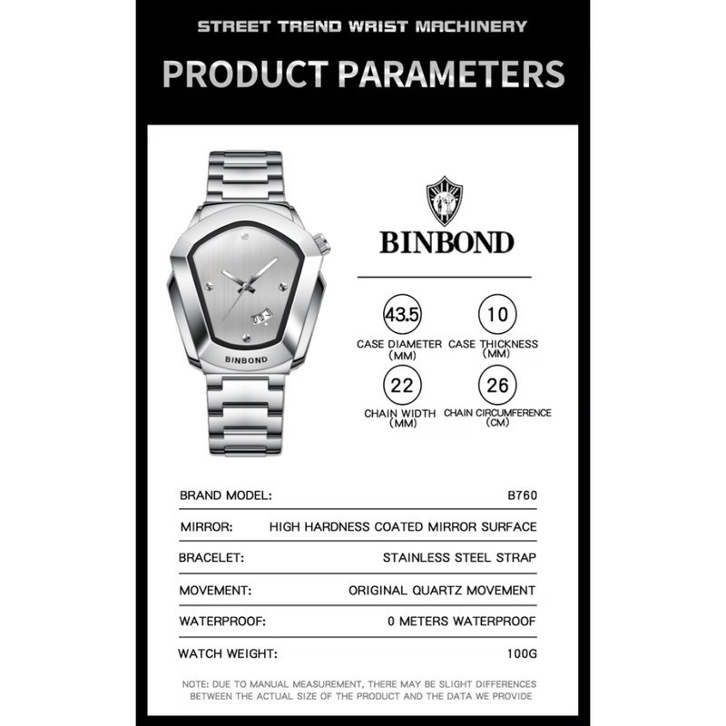 ساعت مچی مردانه مدل بوگاتی برند بین باند BIN BOND با بند استیل و صفحه سفید یک کار خاص مثل بوگاتی است. این مدل شرکتی اوریجینال با موتور کوارتز دارای روزشمار شیشه معدنی ضد خش رفلکس دار و کاملا مقاوم در برابر آب میباشد. بند استیل فولادی ضد حساسیت پوستی با قفل دو پروانه در کنار قطر صفحه ۴۵ میل و ضخامت ۱۱ میل طراحی قدرتمند آن را کامل کرده و فروشگاه اینترنتی روبی مد این ساعت را همراه با کارت گارانتی ارائه میدهد.