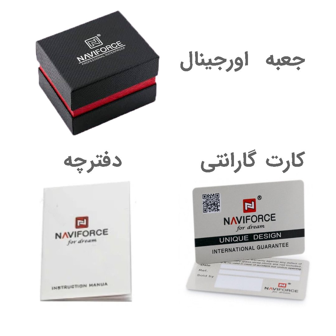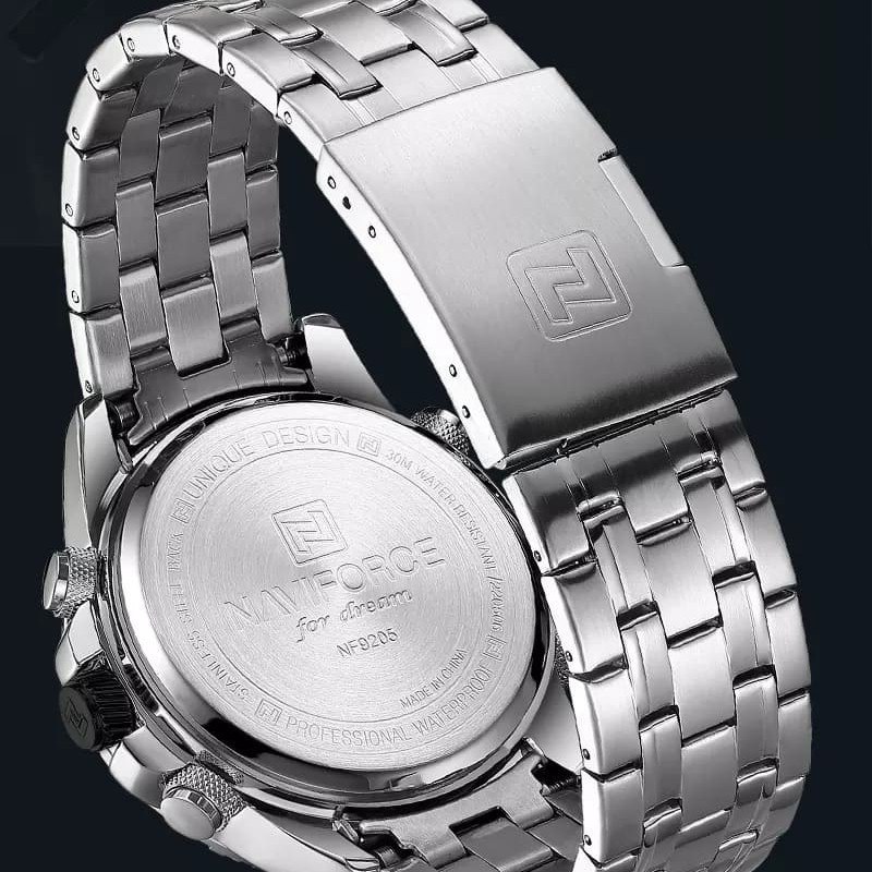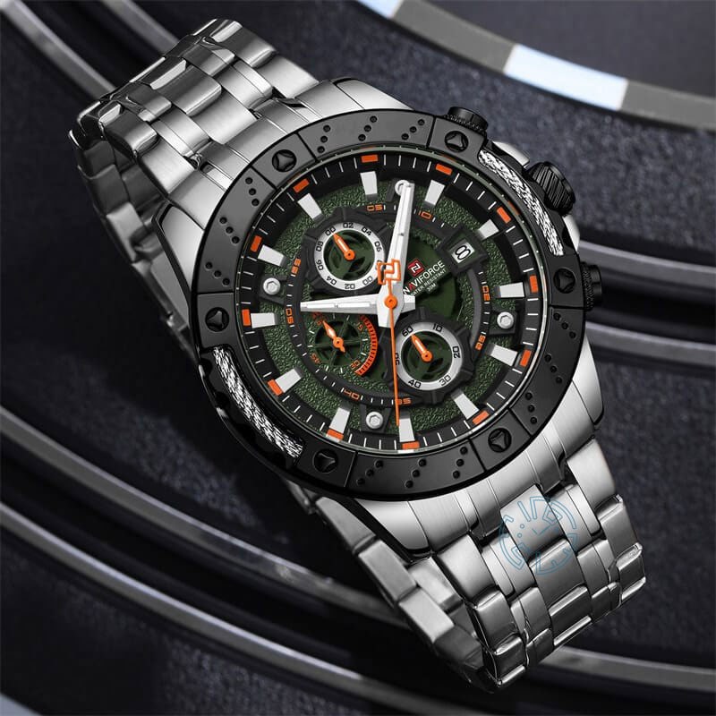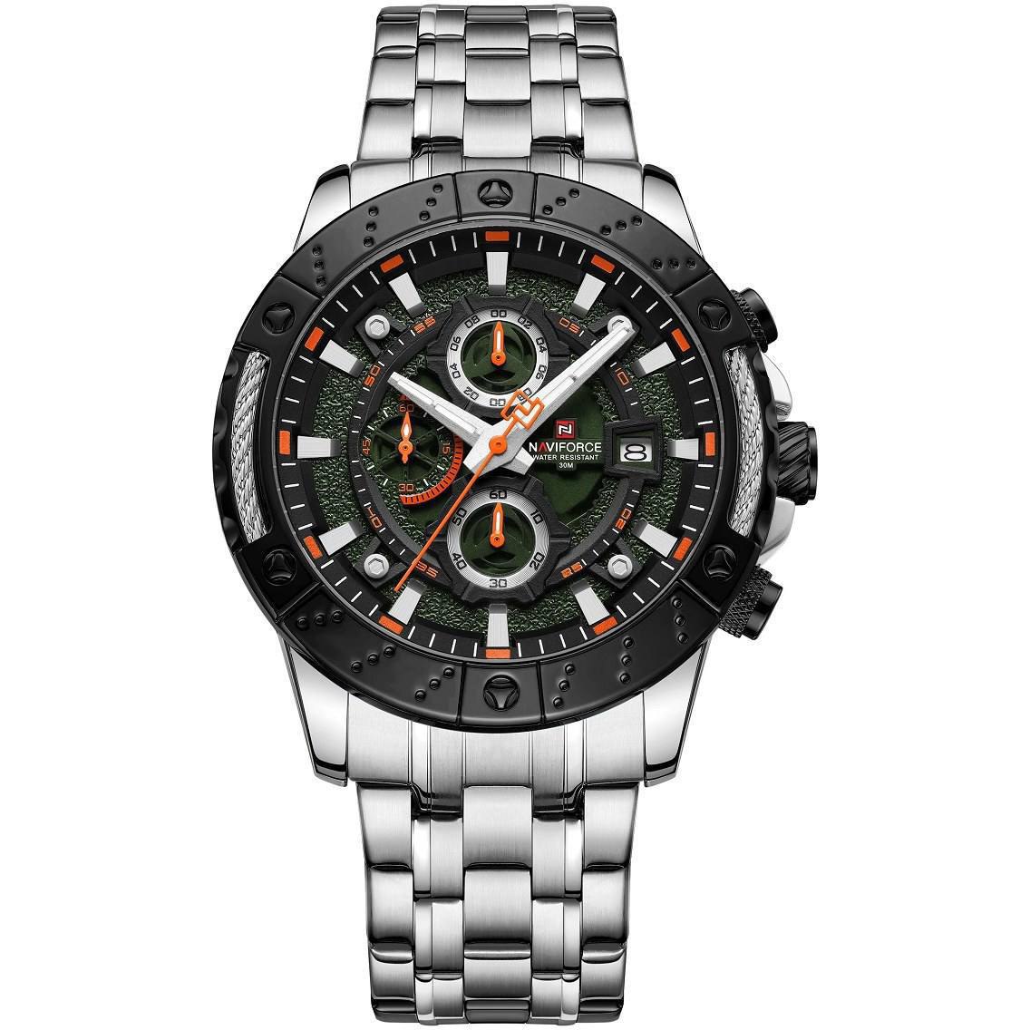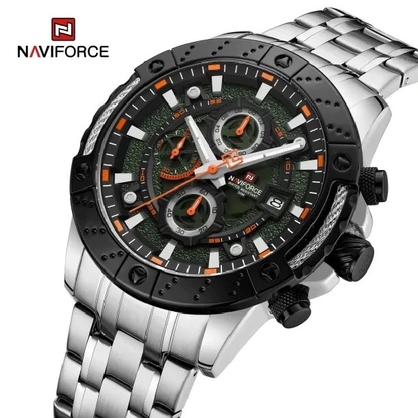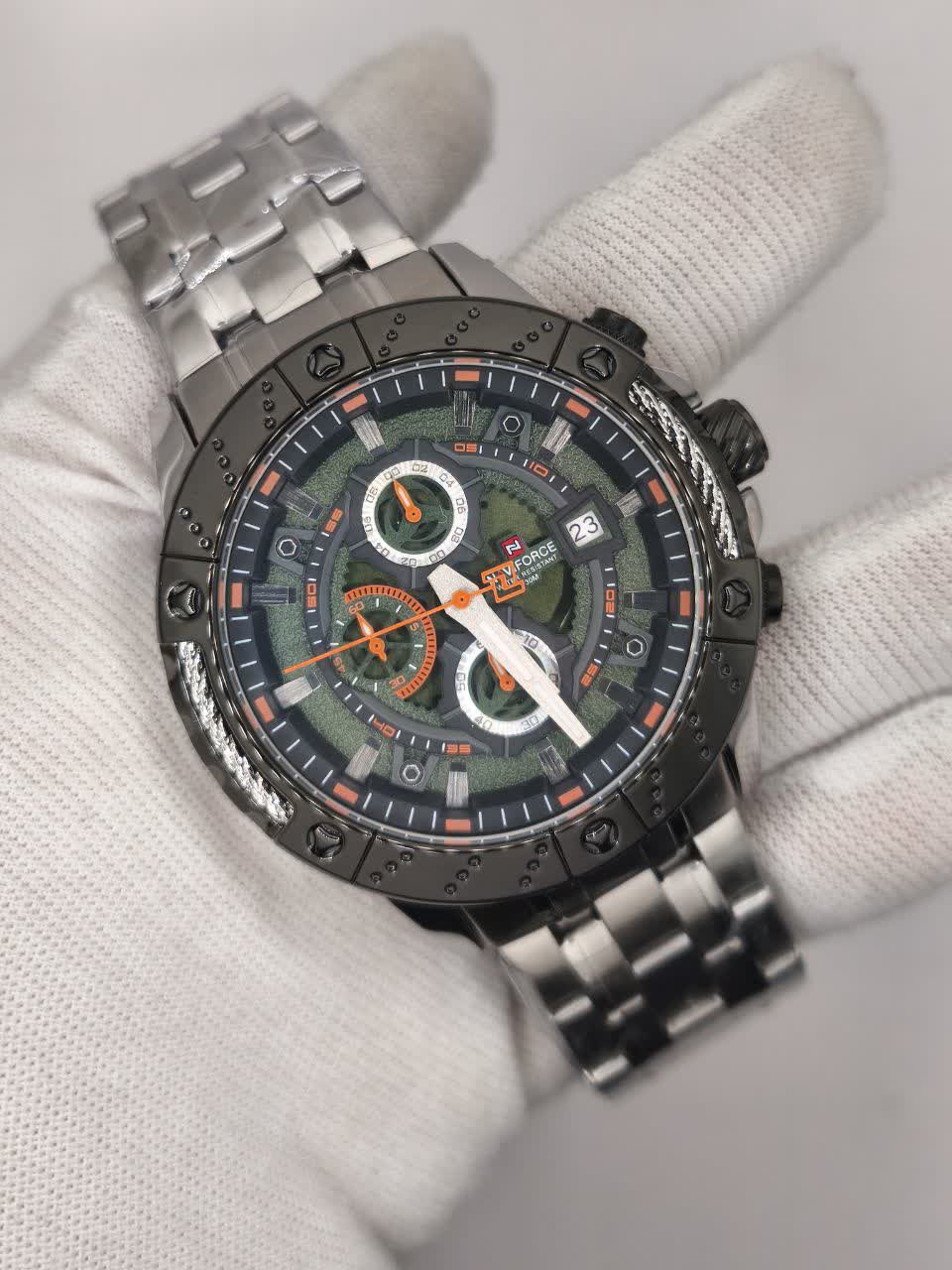 ساعت مچی کرنوگراف مردانه نیوی فورس NAVIFORCE مدل NF9227 با بند استیل رنگ ثابت و توپُر و صفحه مشکی و سبز طراحی شیک و مردانه ای دارد. این ساعت سه موتوره کرنوگراف با موتور ژاپن تقویم دار عقربه شب تاب شیشه معدنی ضد خش قاب استیل ضد آب و بند ضد حساسیت پوستی همراه با قفل کلیپسی ضامن دار ارائه میشود و به صورت ارجینال با جعبه و کارت گارانتی از فروشگاه اینترنتی روبی مد قابل تهیه است.