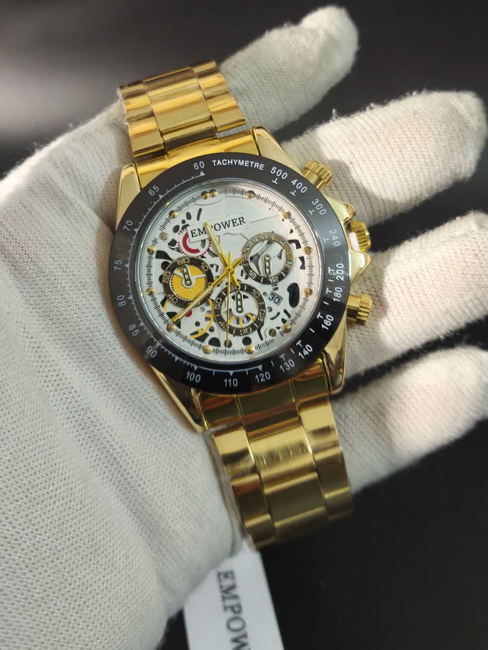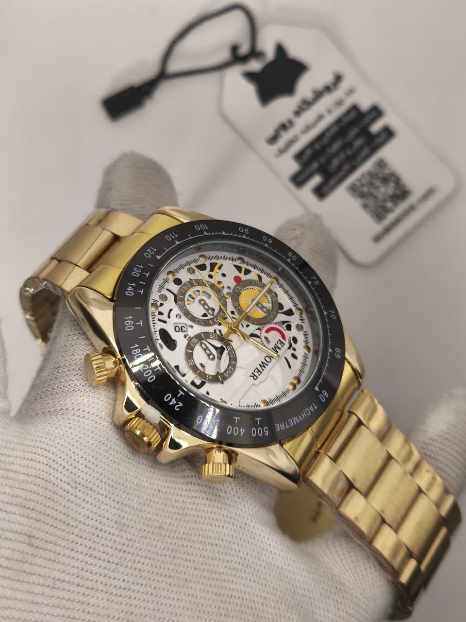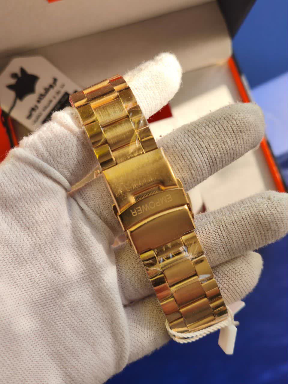 ساعت مچی مردانه امپاور EMPOWER طرح سه موتوره با کیفیت عالی و طراحی خاص تقدیم نگاه زیبای شما می شود. این مدل با بند توپُر رنگ ثابت طلایی سفید طرح چرخ دنده، صفحه دایره ای ضد خش و طرح سه موتوره جذاب جلوه ای لوکس دارد. دارای موتور کوارتز دقیق، تقویم دار، قابلیت ضد آب و قفل مخفی ضامن دار دو قفله می باشد. برند شرکتی معتبر این ساعت را به انتخابی شیک و ماندگار تبدیل کرده است. محصول به همراه جعبه هدیه از فروشگاه اینترنتی روبی مد ارائه می شود.