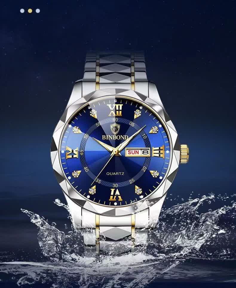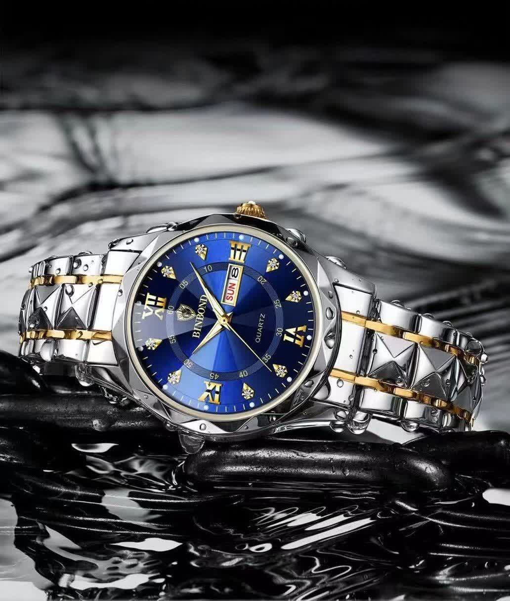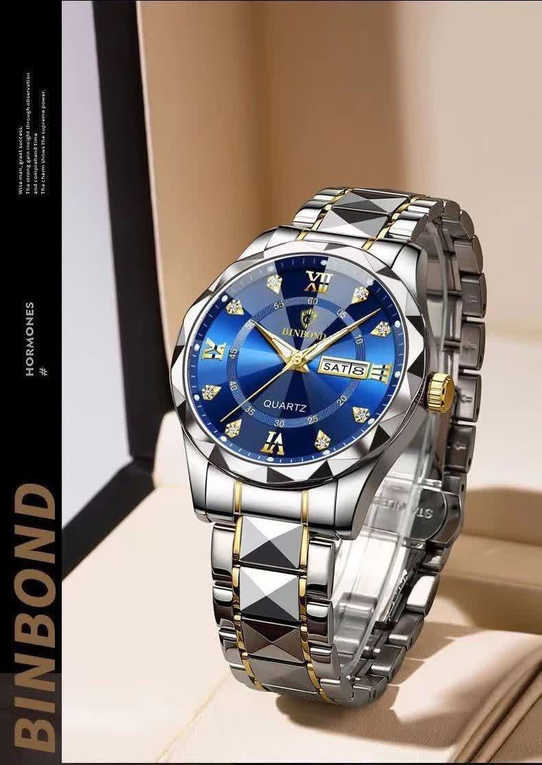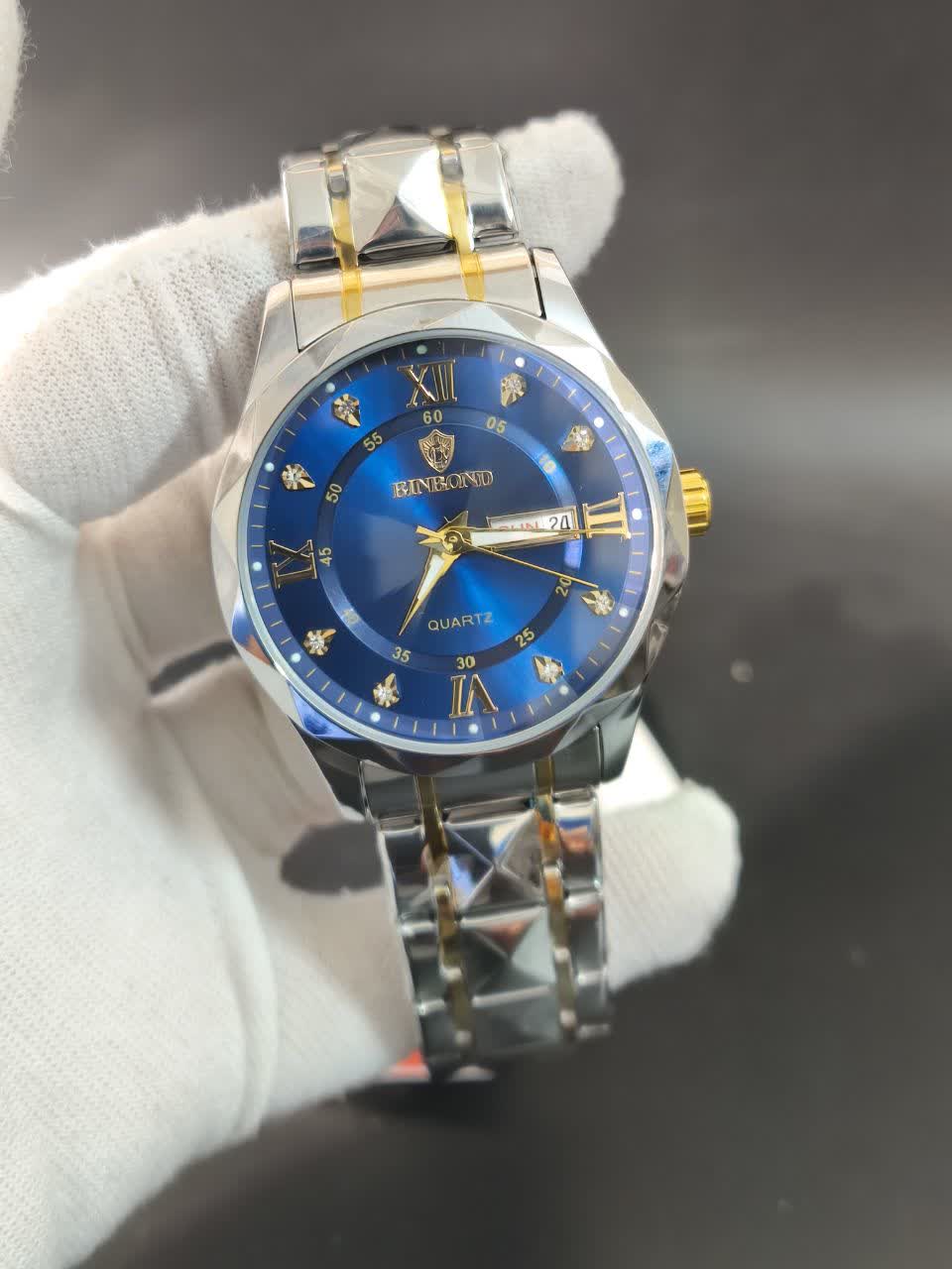 ساعت مچی مردانه بین باند (BIN BOND) الماسی اورجینال با رنگ بند نقرهای رگه طلایی و صفحه آبی، یک انتخاب بینظیر و لوکس برای آقایان است. این ساعت با بند استیل فولاد توپر و قفل پروانه ای خاص دو قفله، ظاهری مجلل و مدرن دارد. صفحه الماس کاری، شیشه الماسی برجسته و ضد خط و خش نشکن، به همراه موتور کوارتز ژاپنی با دقت عالی، این ساعت را به یک اثر هنری تبدیل کرده است. مقاوم در برابر آب، دارای تقویم، روز شمار و صفحه شب نما بوده و با جعبه هدیه عرضه میشود. برای خرید این ساعت ارزشمند و باکیفیت، به فروشگاه اینترنتی روبی مد سر بزنید.