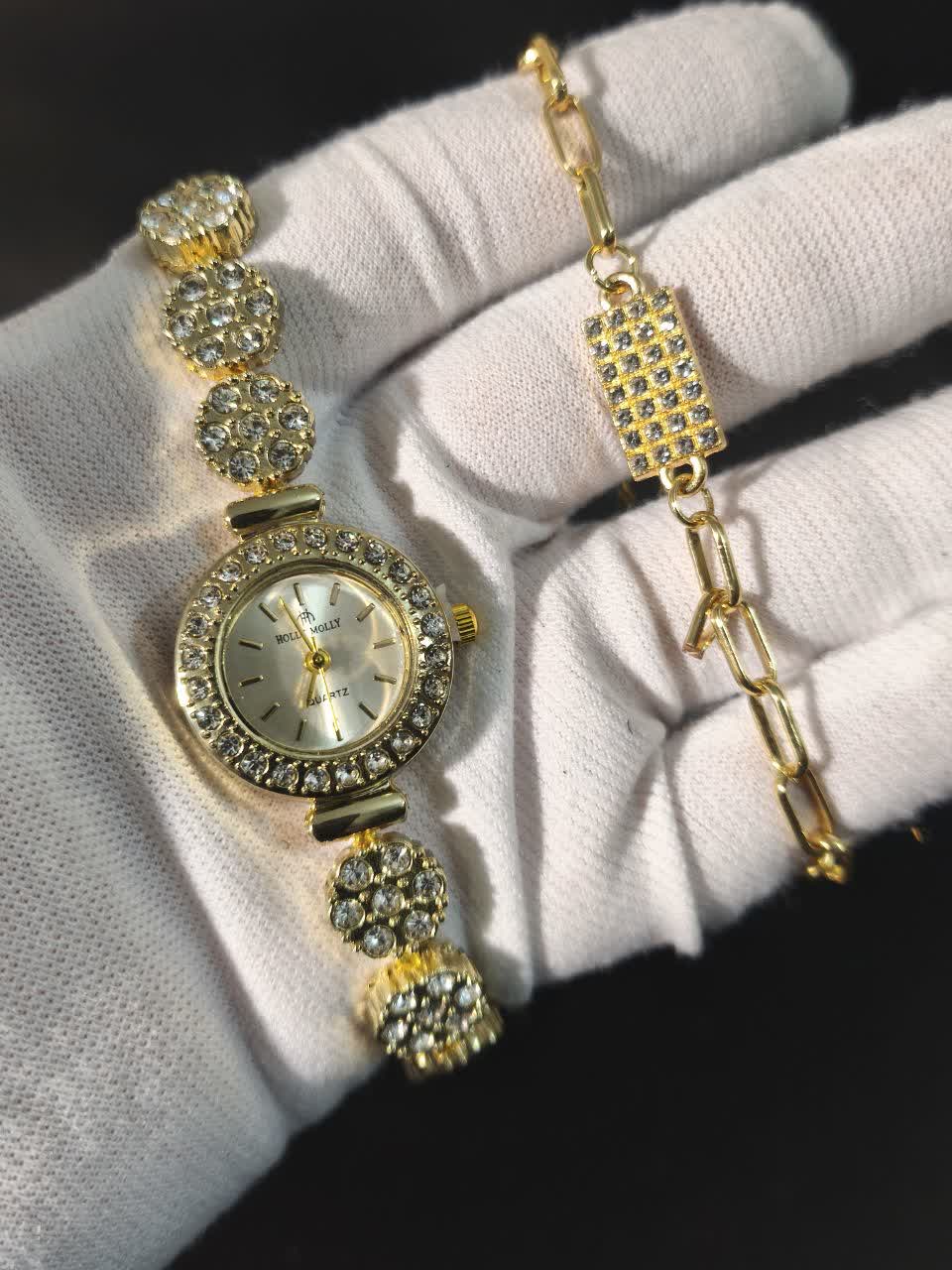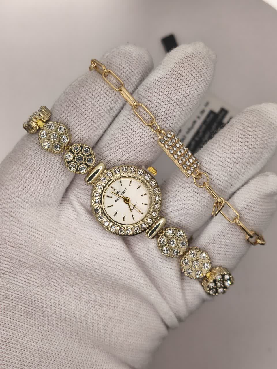ست ساعت و دستبند دخترانه نگینی برند هولی مولی طرح پلاک با رنگ بند طلایی و صفحه سفید انتخابی ظریف و چشم نواز برای استایل های خاص و مجلسی است. این ست شامل ساعت و دستبند با قفل دستبندی و قاب نگینی با طرح بند الماسی و مدل یونانی است که جلوه ای لوکس به دستان شما می بخشد. بند فلزی نگین کاری شده در کنار طراحی مجلسی باعث می شود همه نگاه ها به دست شما باشد. این محصول به همراه جعبه هدیه ارائه می شود و گزینه ای عالی برای هدیه دادن است. این ست خاص را می توانید از فروشگاه اینترنتی روبی مد تهیه کنید.