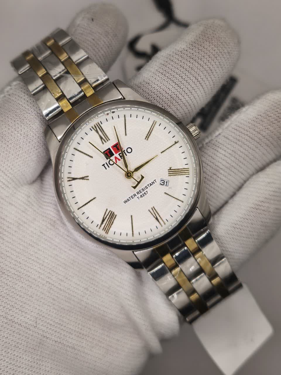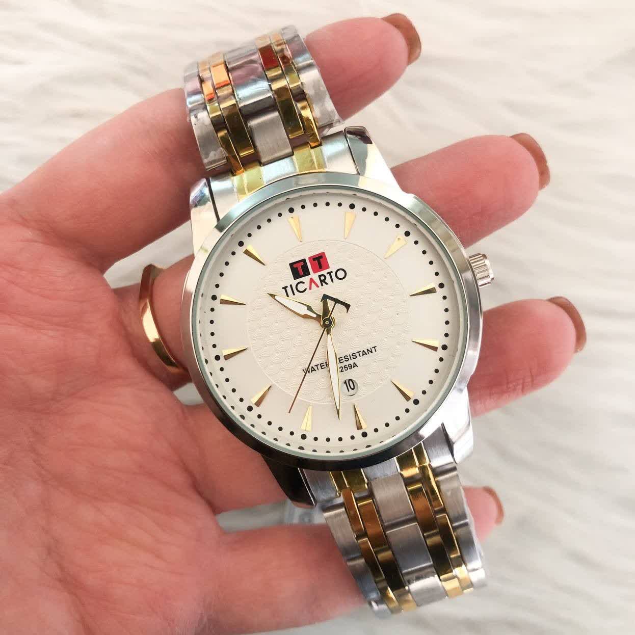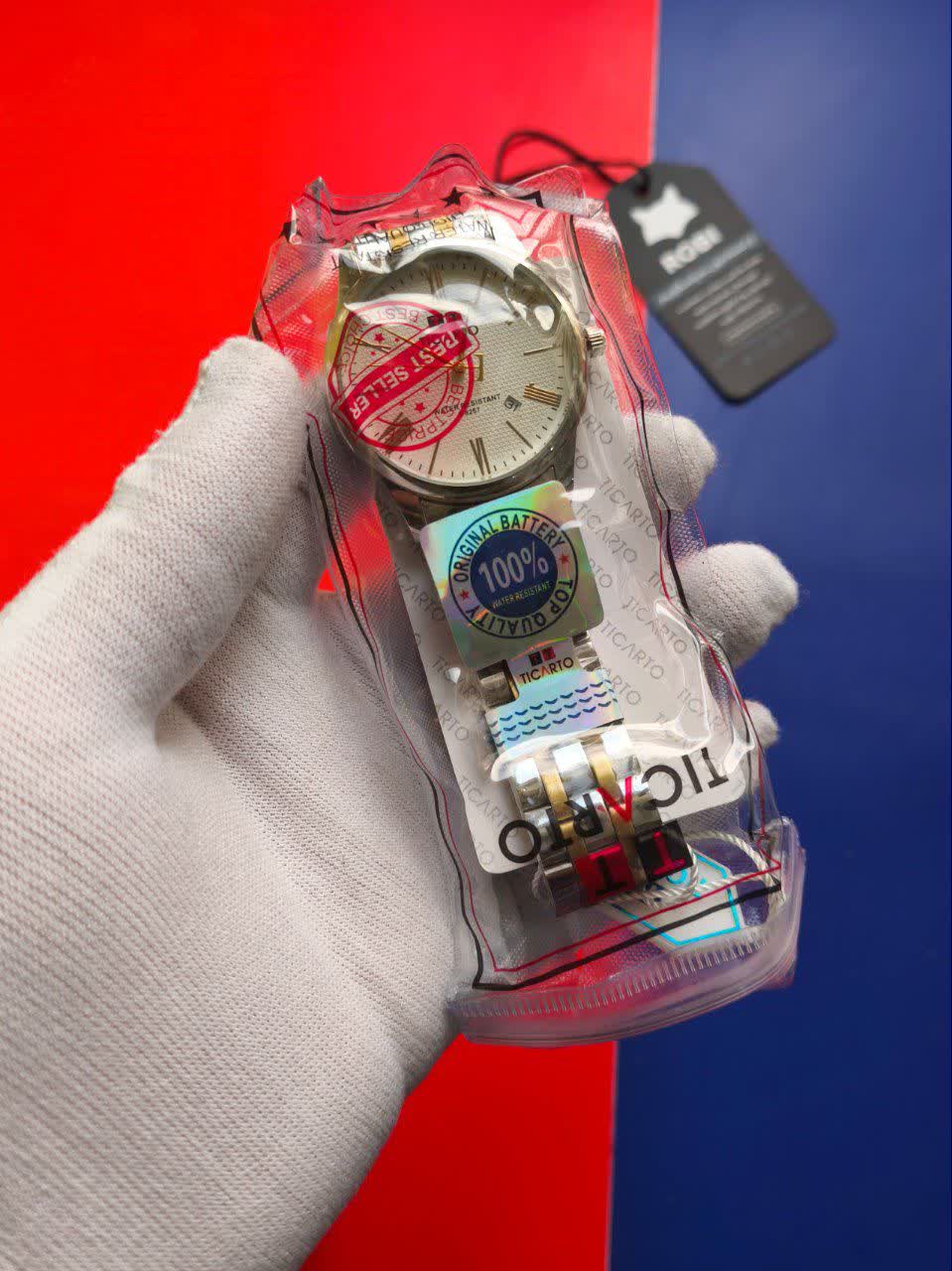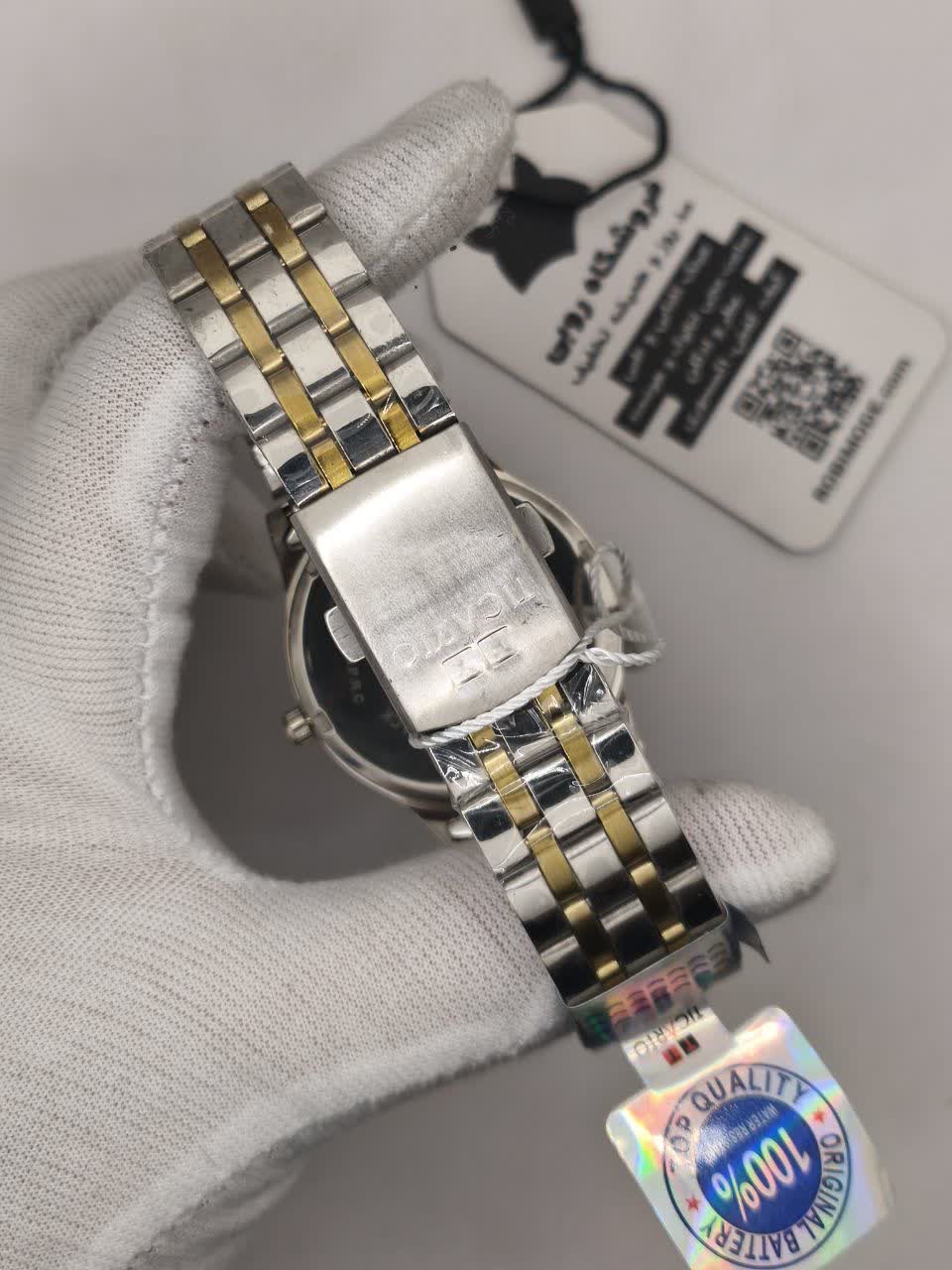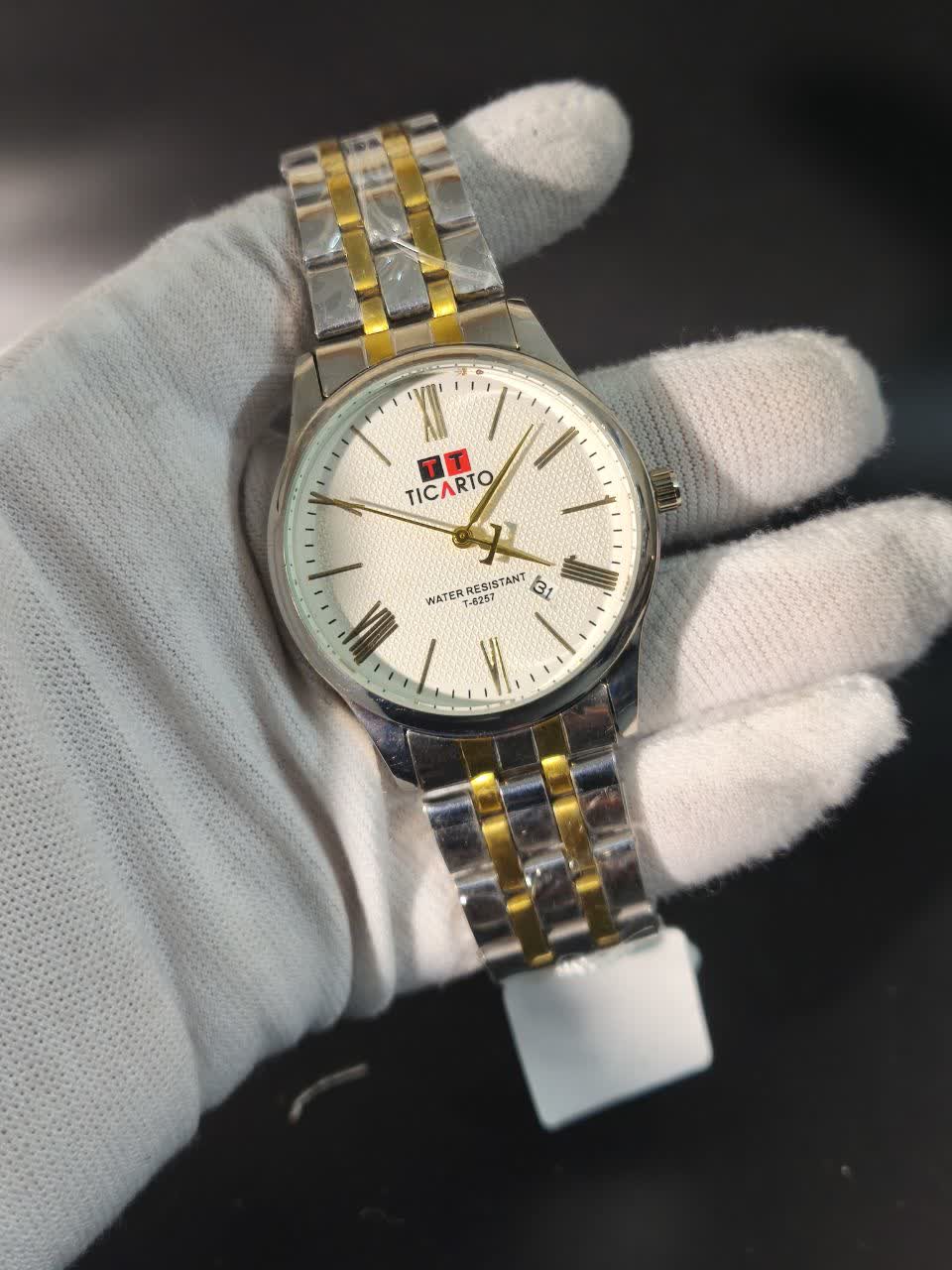 ساعت مچی مردانه تیکارتو طرح کرنو TICARTO اورجینال با طراحی شیک و رسمی دارای بند استیل رنگ ثابت با رگه طلایی و صفحه سفید دایرهای است. این مدل به موتور باکیفیت تایوان مجهز بوده و روزشمار ماه و هفته را با دقت نمایش میدهد. شیشه کریستال مقاوم و ضد خط و خش در کنار حک برند روی قاب دوام و جلوه خاص ساعت را تضمین میکند. قفل استیل سگکی فشاری و خاصیت ضد آب ۱۰۰٪ آن را برای استفاده روزمره کاملا مناسب کرده است. این محصول تولید یک شرکت معتبر بوده و به همراه جعبه هدیه از فروشگاه اینترنتی روبی مد با کیفیت بالا عرضه میشود.