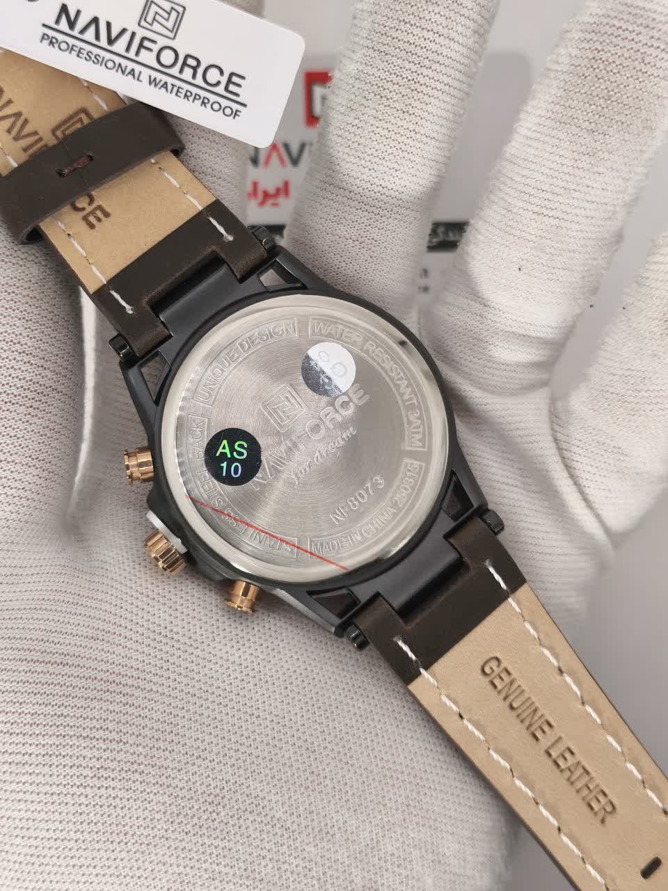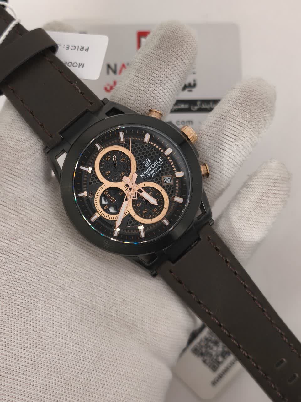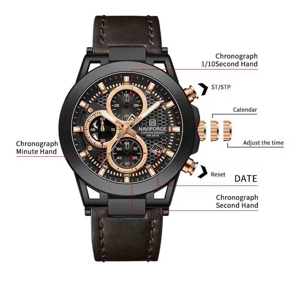 ساعت مچی کرنوگراف مردانه نیوی فورس NAVIFORCE مدل NF8073 با موتور ژاپن انتخابی شیک و حرفهای برای آقایان خوشسلیقه است. این ساعت با بند چرم قهوهای اصلی و باکیفیت دور دوخت و ضد حساسیت پوستی به همراه صفحه و قاب مشکی دایرهای جلوهای کلاسیک و جذاب دارد. سه موتور فعال کرنوگراف به همراه تقویم و موتور ژاپن کوارتز دقت و عملکرد قابل اعتمادی ارائه میدهد. قاب استیل مقاوم شیشه معدنی ضد خش عقربههای شب تاب و خاصیت ضد آب بودن دوام و کیفیت بالای ساعت را تضمین میکند. این محصول به صورت کاملا ارجینال با جعبه و کارت گارانتی و همراه با گارانتی نیوی فورس ایران از فروشگاه اینترنتی روبی مد عرضه میشود.
