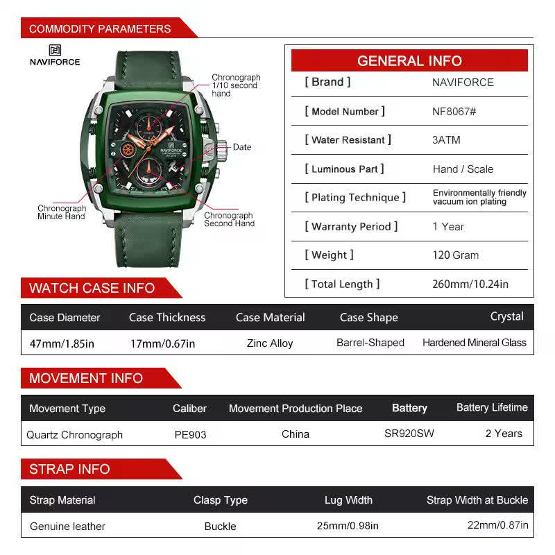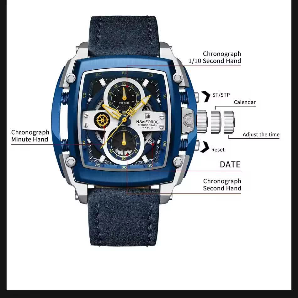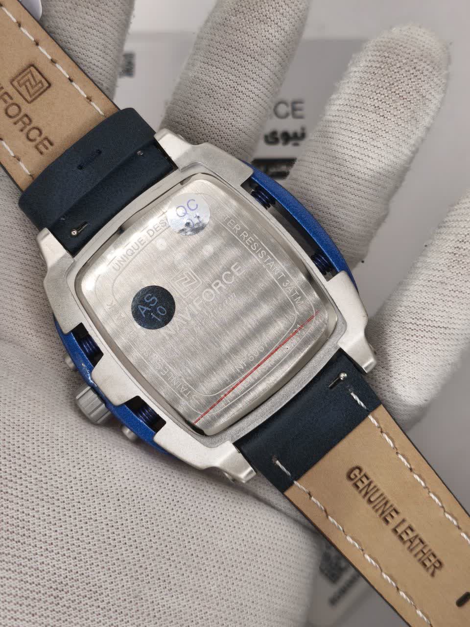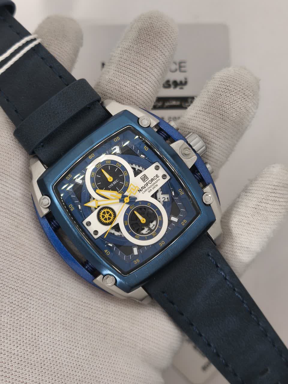 ساعت مچی کرنوگراف مردانه نیوی فورس NAVIFORCE مدل NF8067 با موتور ژاپن انتخابی شیک و لوکس برای آقایان خوشسلیقه است. این ساعت با بند چرم سرمهای اصلی و باکیفیت دور دوخت و ضد حساسیت پوستی به همراه صفحه مستطیل ترکیب سرمهای و نقرهای و قاب استیل جلوهای خاص و مدرن دارد. سه موتور فعال کرنوگراف به همراه تقویم و موتور ژاپن کوارتز دقت و عملکرد قابل اعتماد را ارائه میدهد. شیشه معدنی ضد خش عقربههای شب تاب قفل سگکی و خاصیت ضد آب بودن دوام و کیفیت بالای ساعت را تضمین میکند. این محصول به صورت کاملا ارجینال با جعبه و کارت گارانتی و همراه با گارانتی نیوی فورس ایران از فروشگاه اینترنتی روبی مد عرضه میشود.