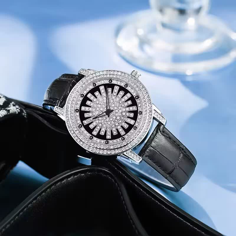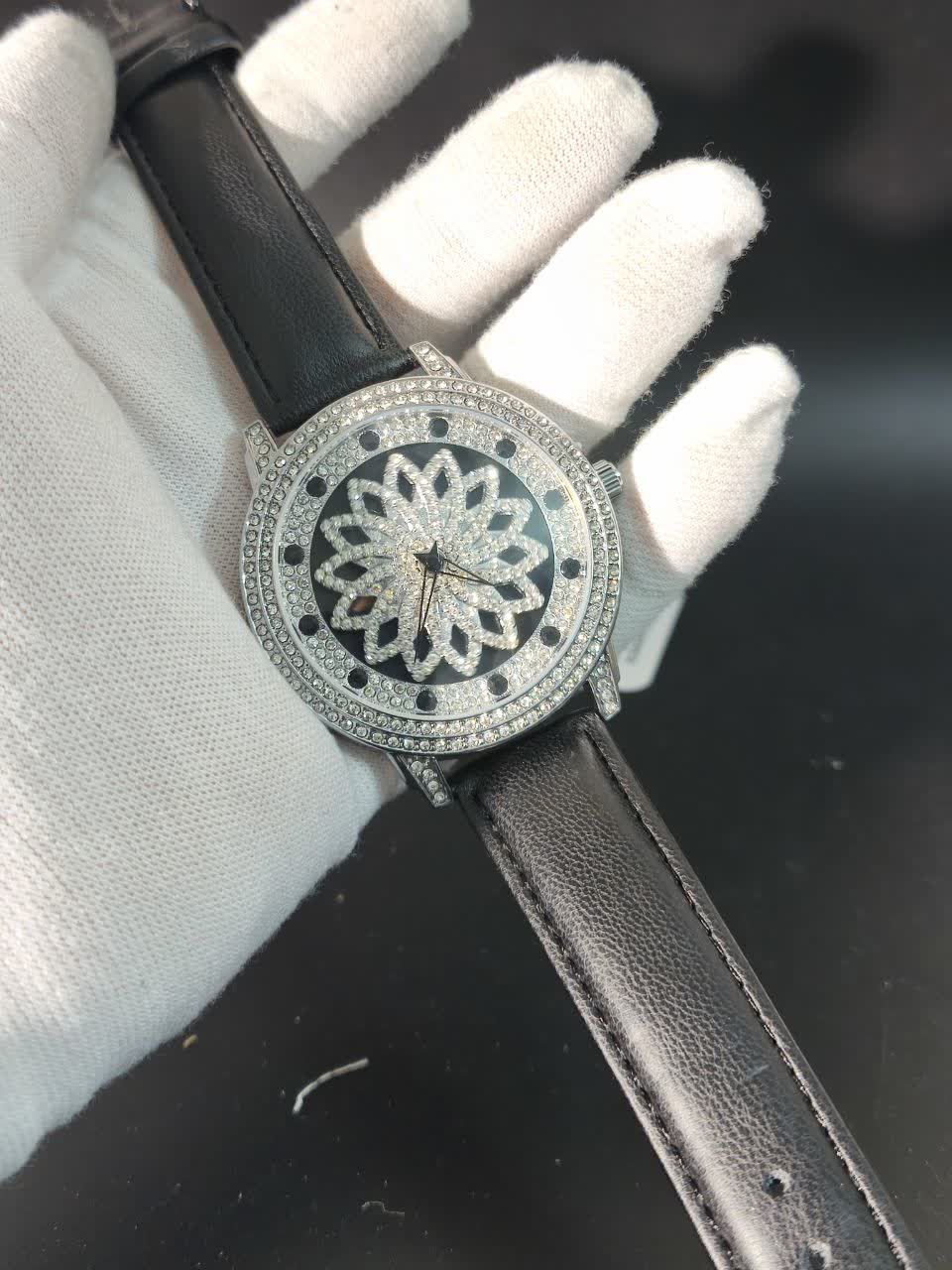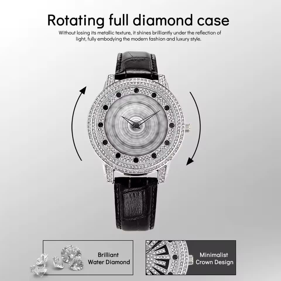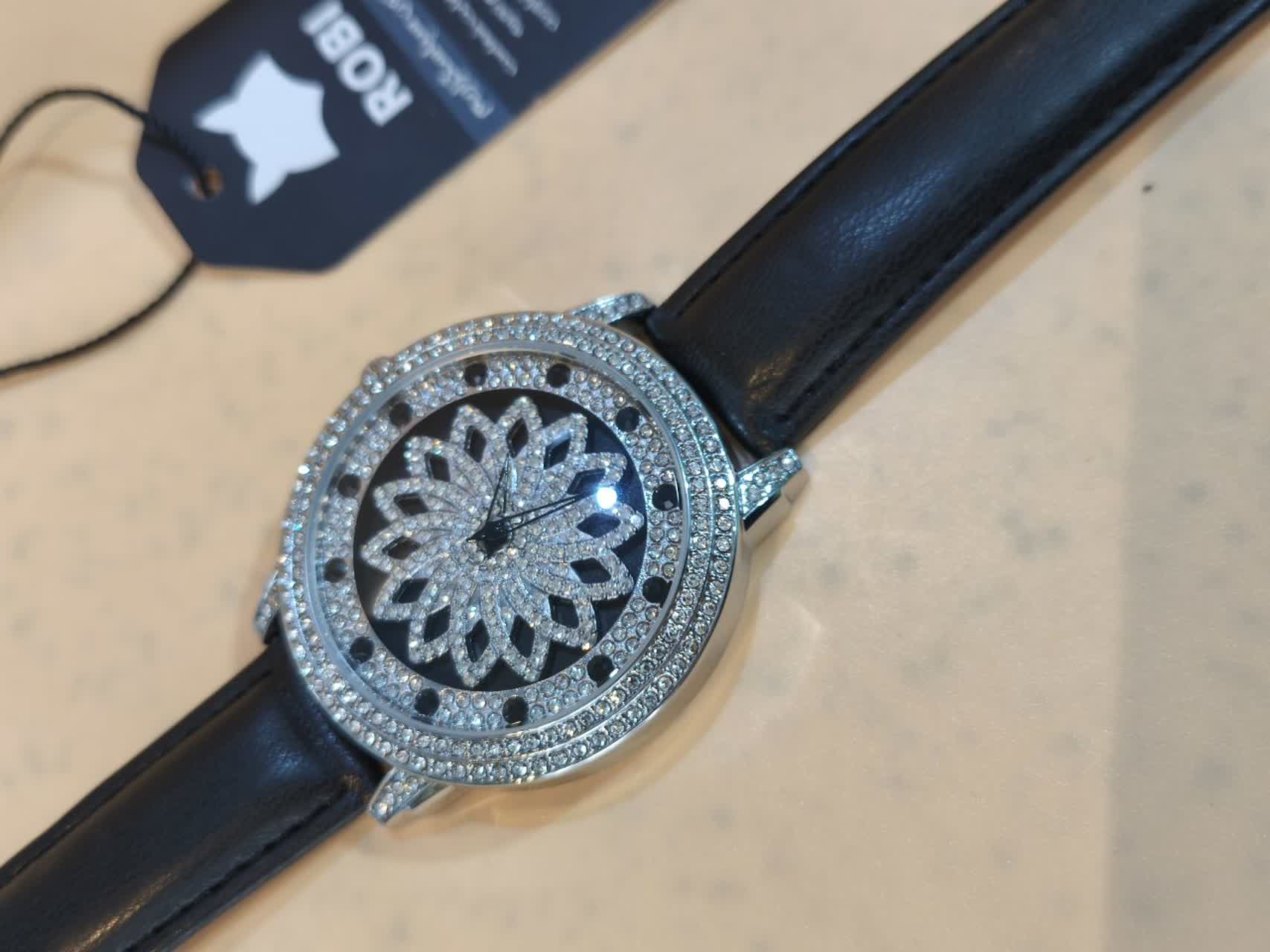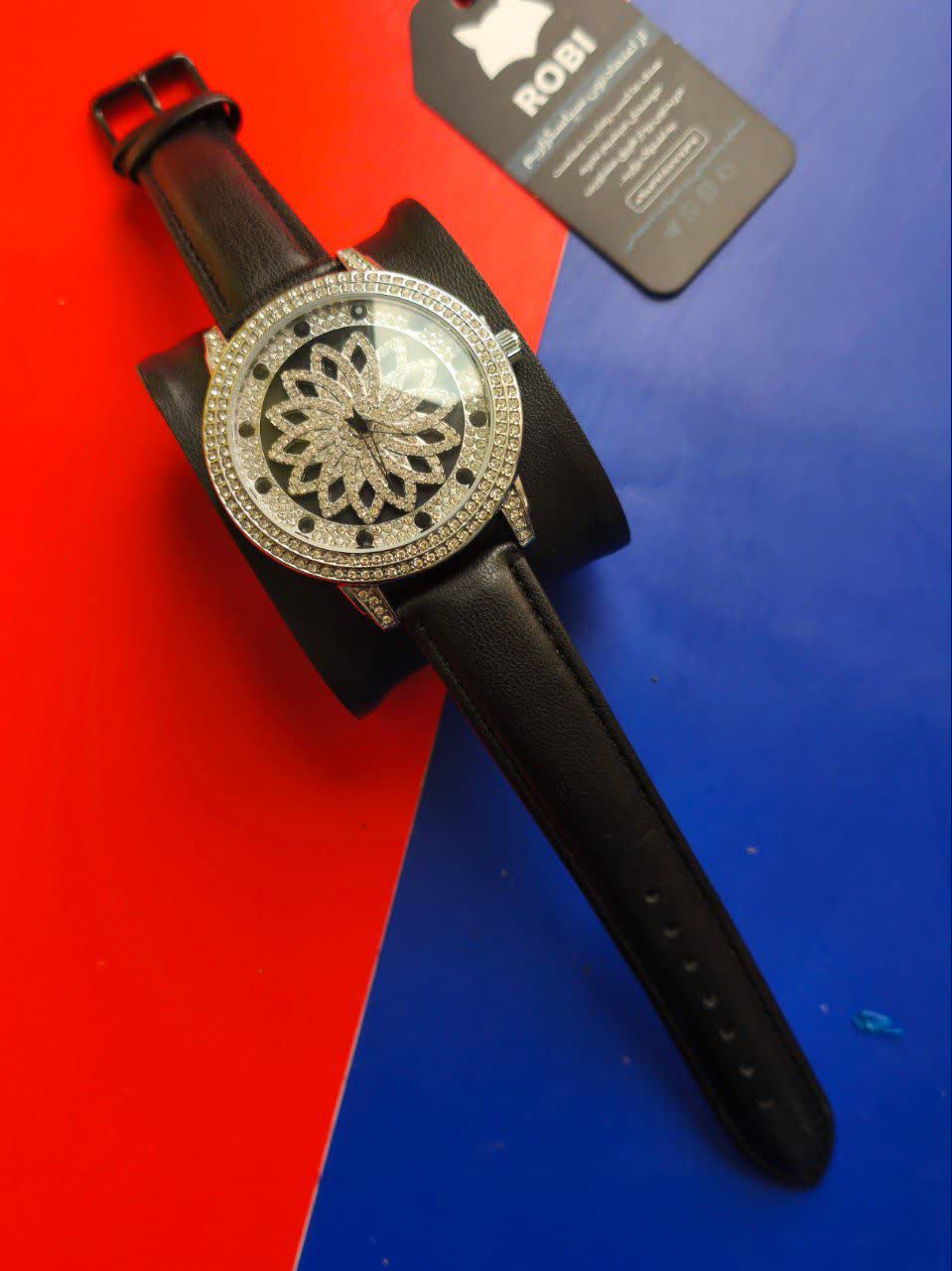 ساعت مچي زنانه رينگي چرخشي با بند چرمی باکیفیت رنگ مشکی و صفحه نقرهای طراحی دایرهای و صفحه متحرک با حرکت دست مجهز به موتور کوارتز با دقت بالا و صفحه فول نگین قاب استیل و شیشه معدنی ضد خش سافایر بند چرمی دور دوخت ضد حساسیت پوستی با قفل سوزنی سگکی کمربندی و ضد آب این ساعت زیبا و شیک از فروشگاه اینترنتی روبی مد قابل تهیه است و استایل شما را با جذابیت و کیفیت بالا تکمیل میکند