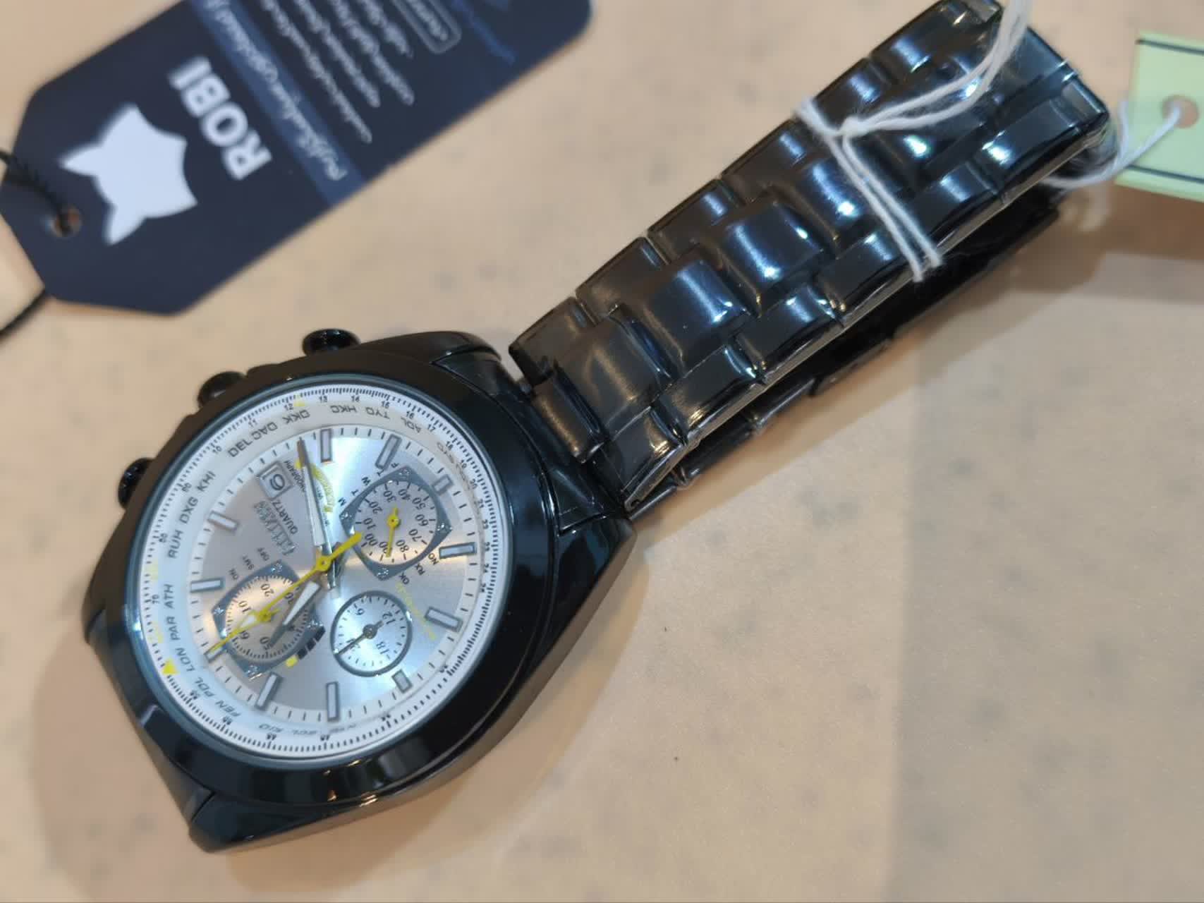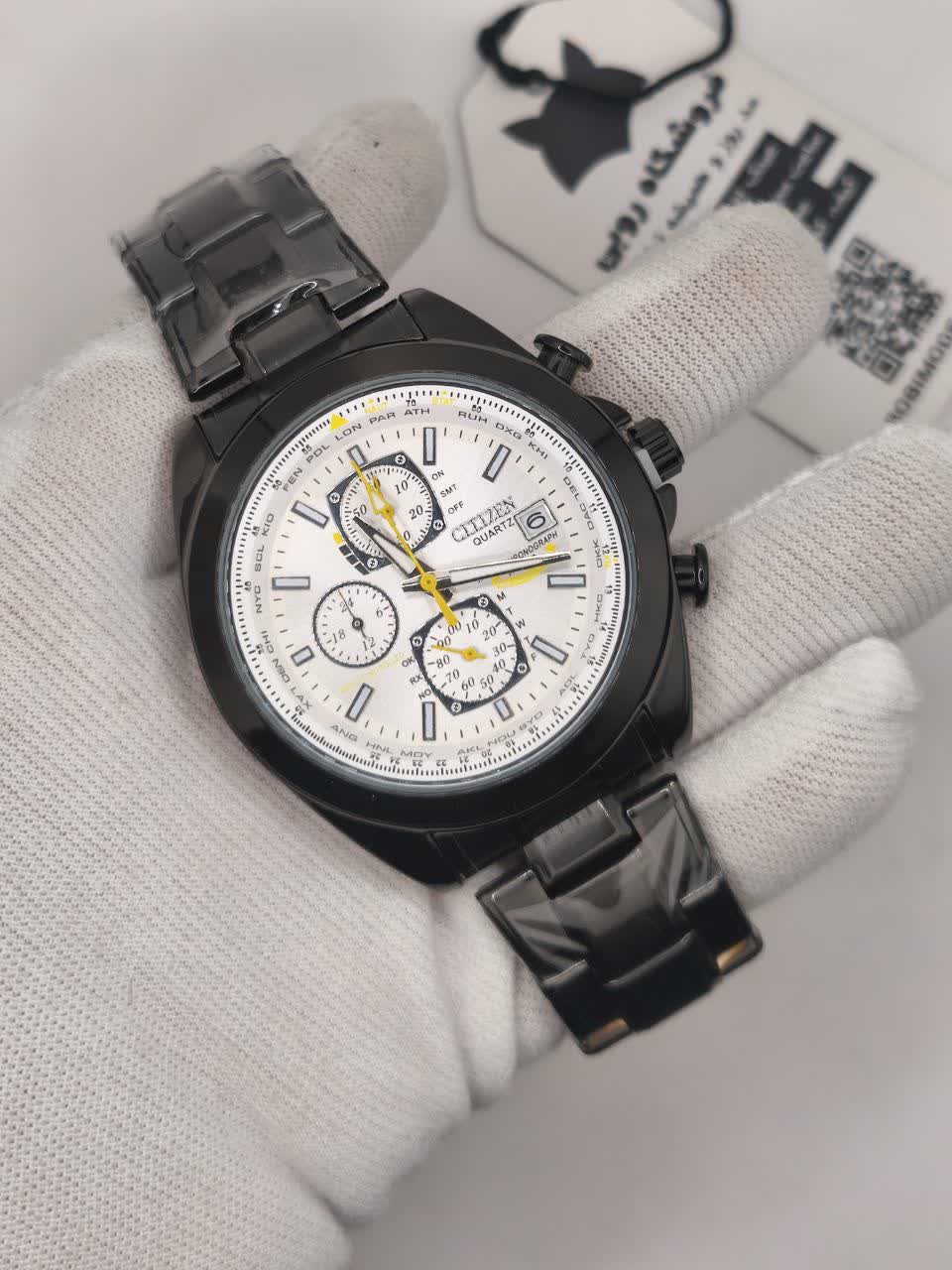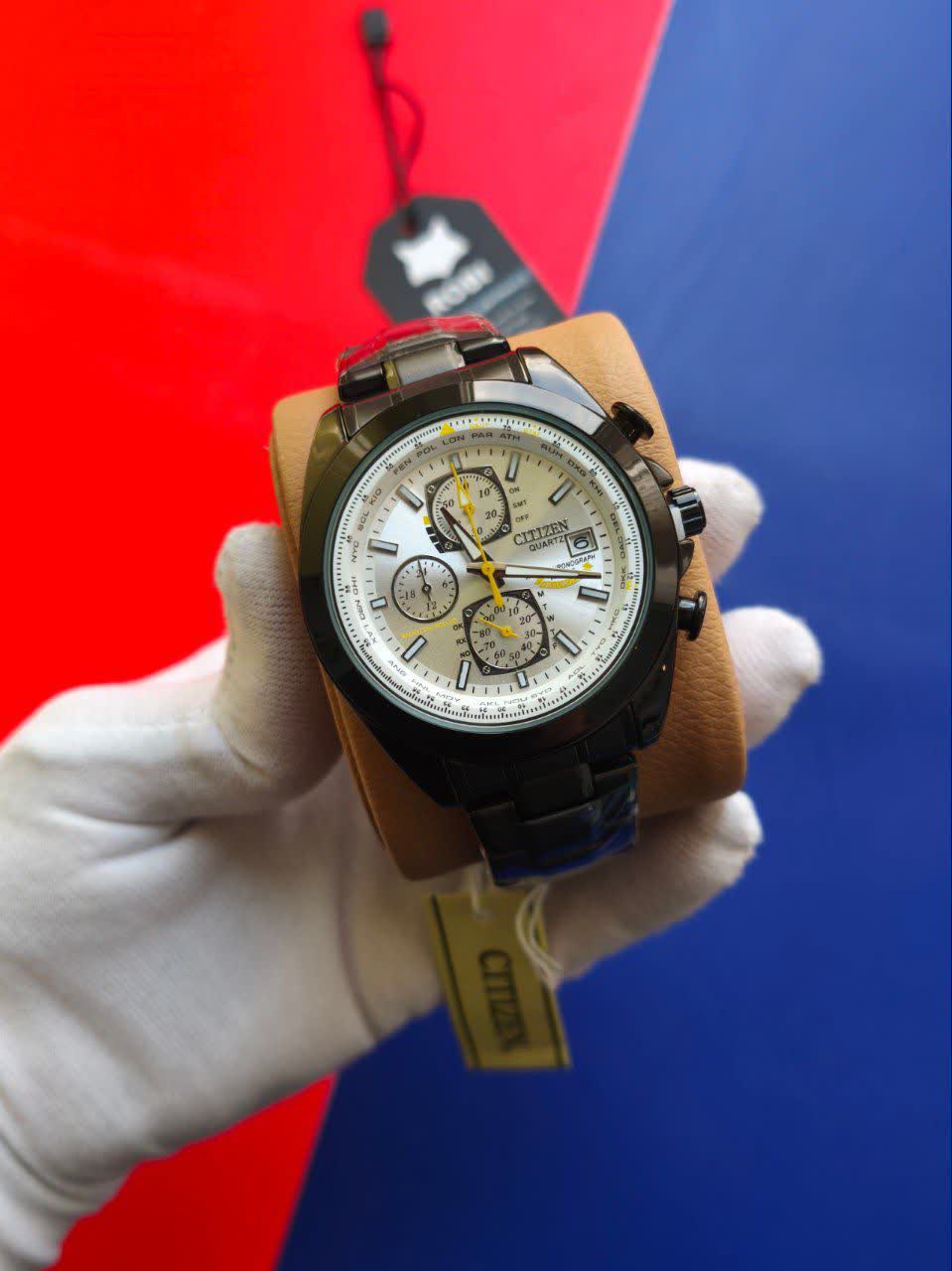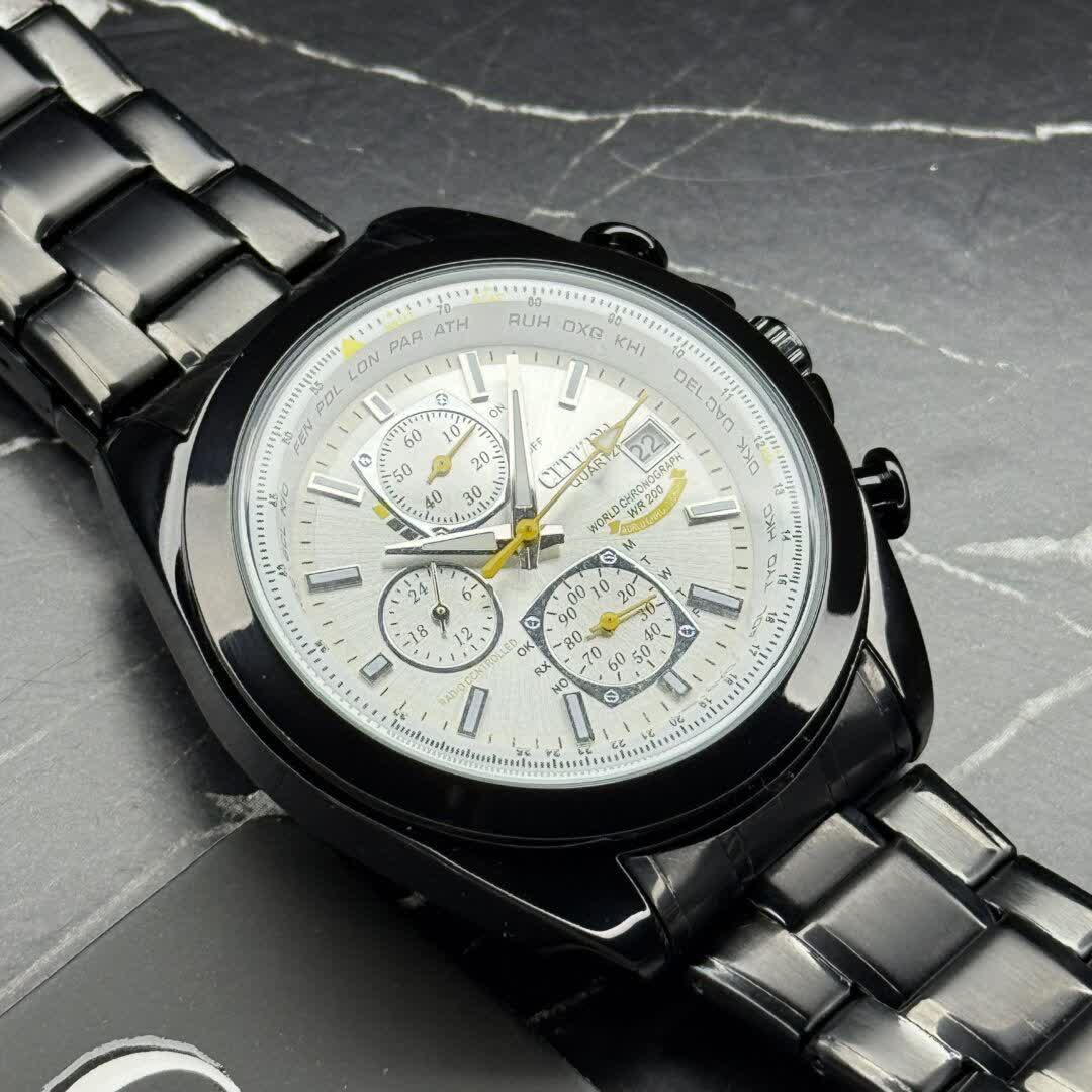 ساعت مچي مردانه کرنوگراف برند سيتيزن CITEZEN مدل 3310 سه موتوره با بند مشکی و صفحه سفید فرم دایرهای سه موتور فعال کرنوگراف طراحی کژوال لوکس فشن خلبانی مجهز به تقویم و عقربه شب نما موتور کوارتز ژاپنی اورجينال شیشه معدنی ضد خش سافایر و بند استیل توپُر سنگین درجه 1 ضد حساسیت پوستی و رنگ ثابت با قفل کلیپسی ضامن دار ضد آب صددرصد این ساعت با گارانتی و جعبه از فروشگاه اینترنتی روبی مد قابل تهیه است و در رنگهای دیگر هم موجود میباشد کافیست پیام بدهید