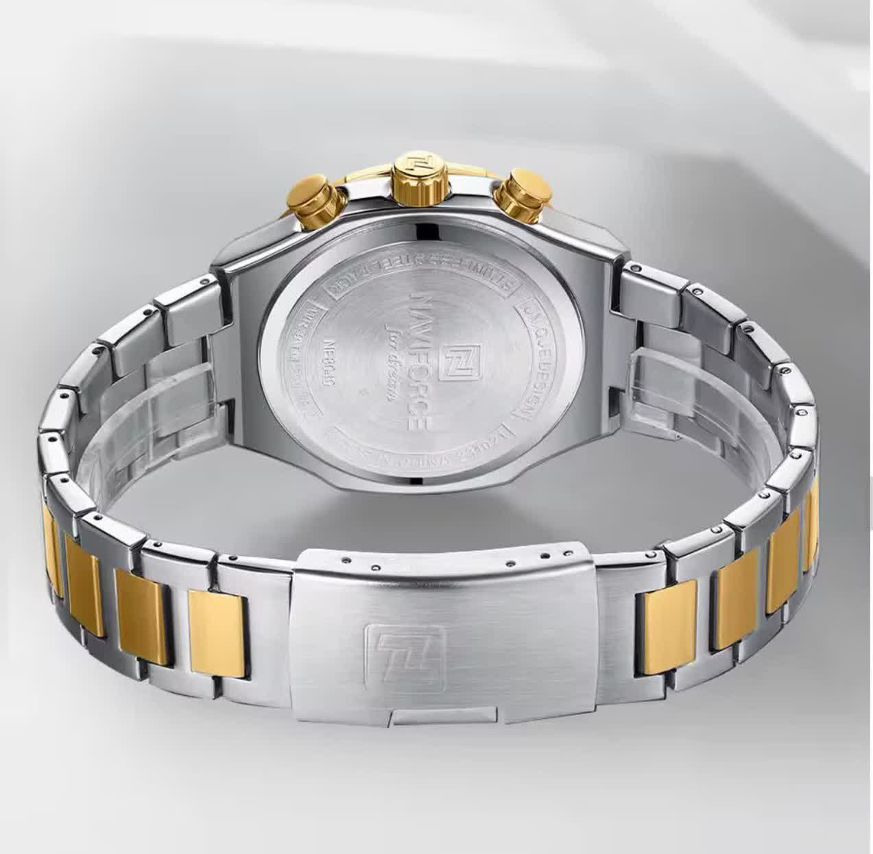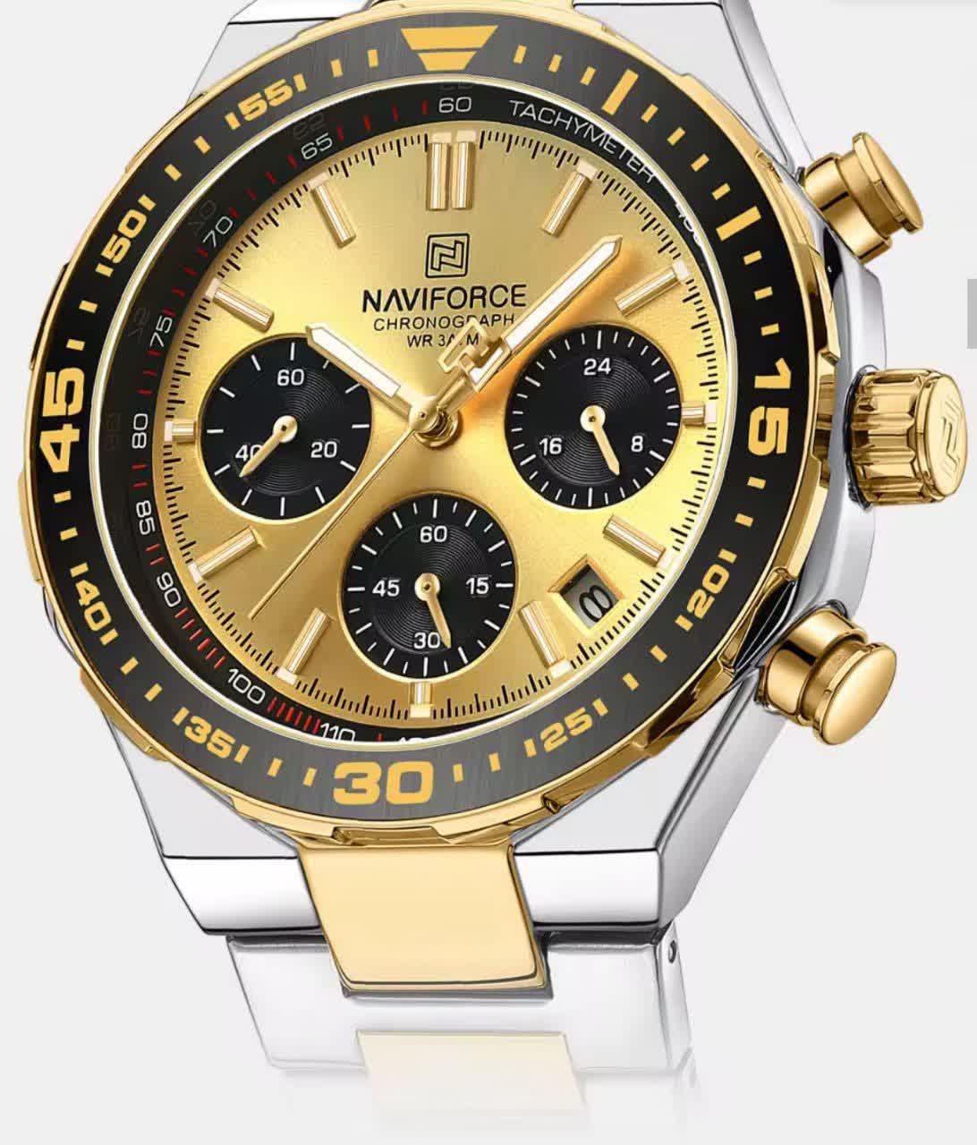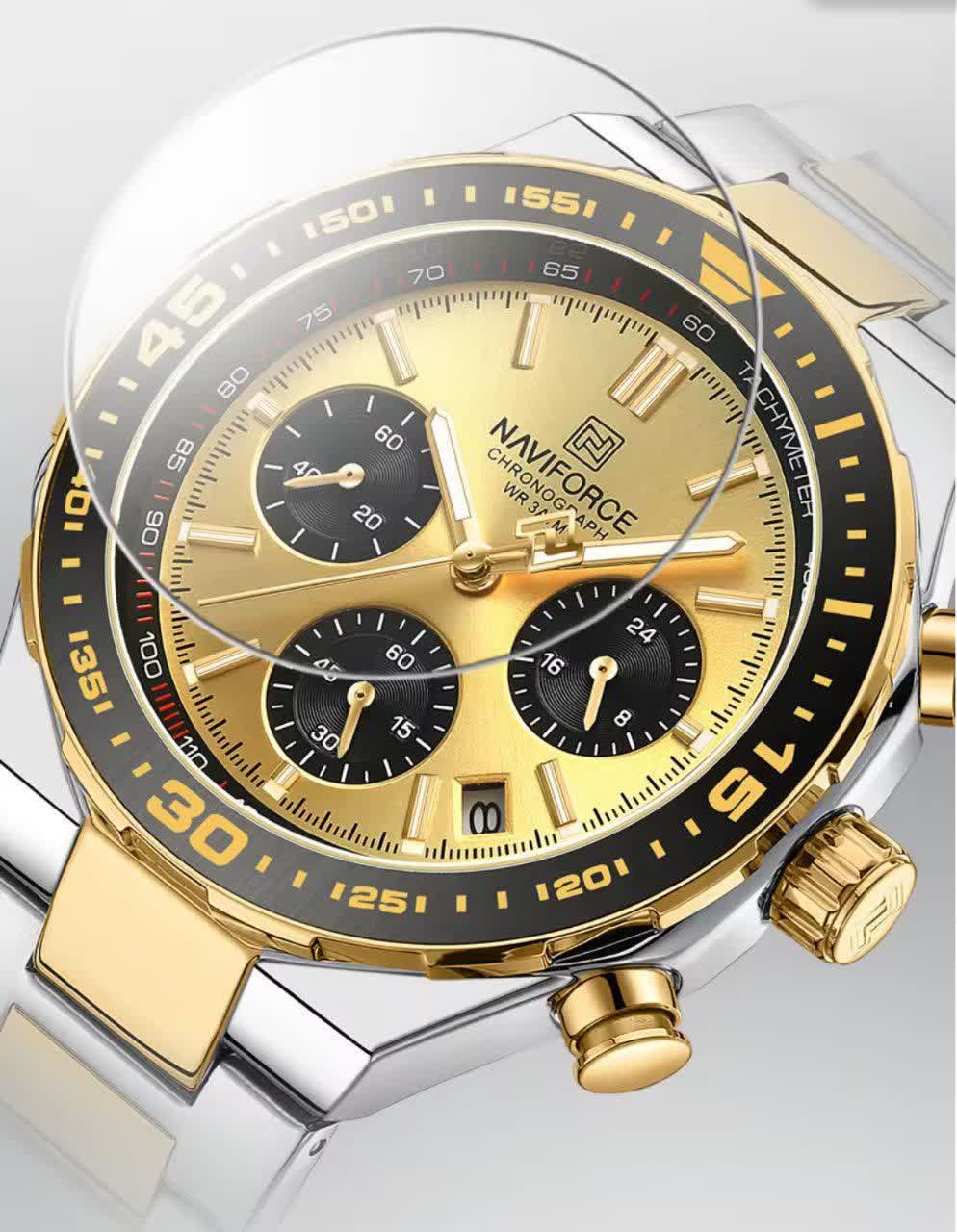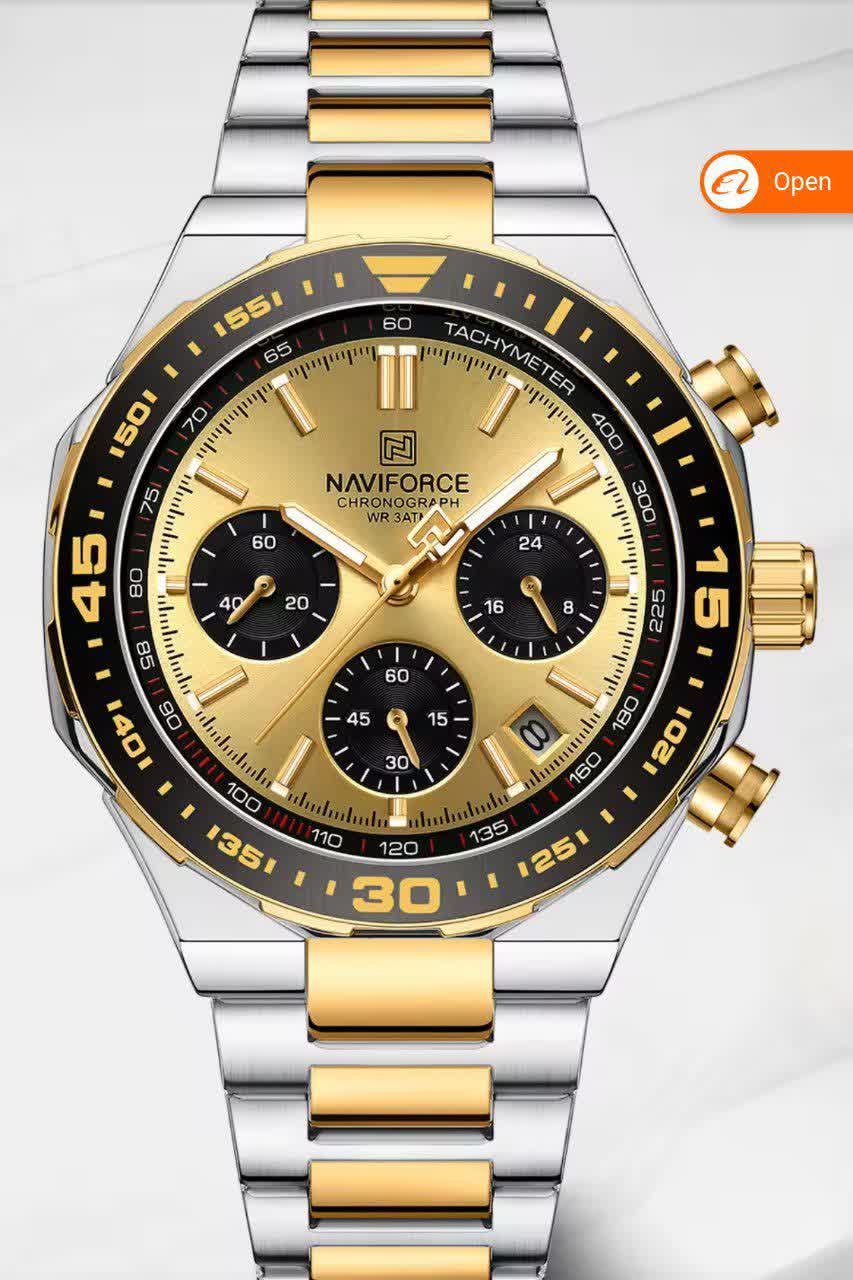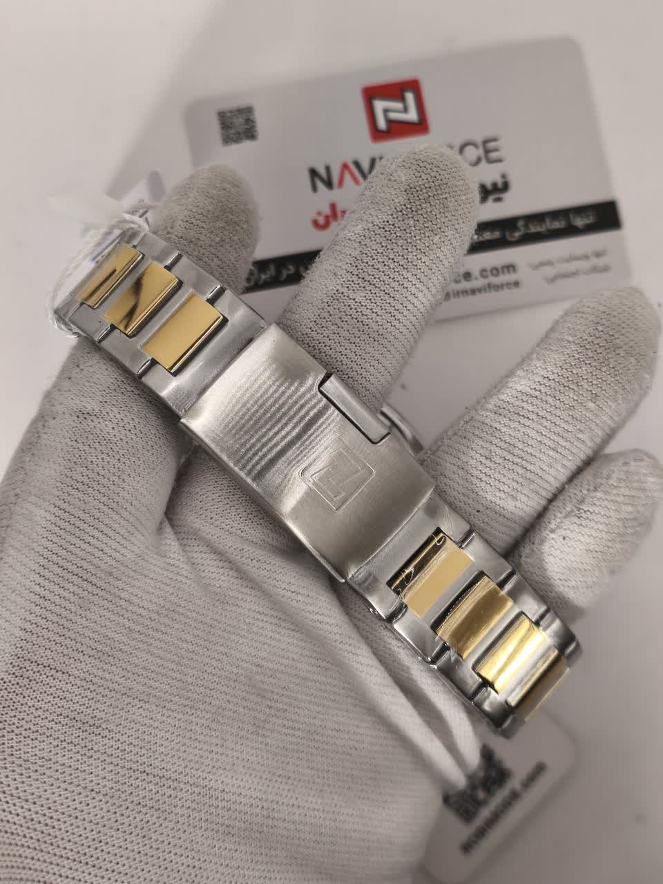 ساعت مچی کرنوگراف مردانه نیوی فورس NAVIFORCE مدل Nf8049 با موتور ژاپن کوارتز انتخابی شیک و قدرتمند برای آقایان خوش سلیقه است. این مدل با بند استیل ضد زنگ توپُر و سنگین به رنگ نقره ای با رگه طلایی و صفحه طلایی جلوه ای لوکس و مردانه دارد. ساعت سه موتوره کرنوگراف بوده و دارای تقویم عقربه های شب تاب شیشه معدنی ضد خش قاب استیل و مقاومت در برابر آب است. بند ضد حساسیت پوستی و قفل کلیپسی ضامن دار استفاده روزمره را راحت و ایمن می کند. این محصول کاملا ارجینال به همراه جعبه و کارت گارانتی معتبر نیوی فورس ایران از فروشگاه اینترنتی روبی مد عرضه می شود.