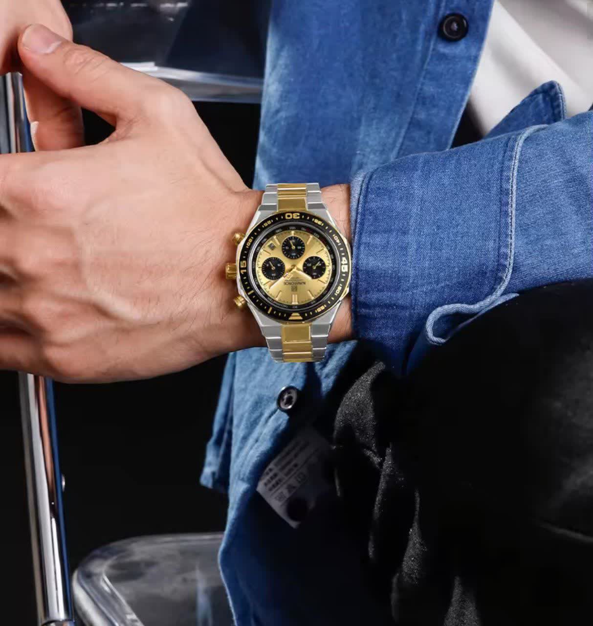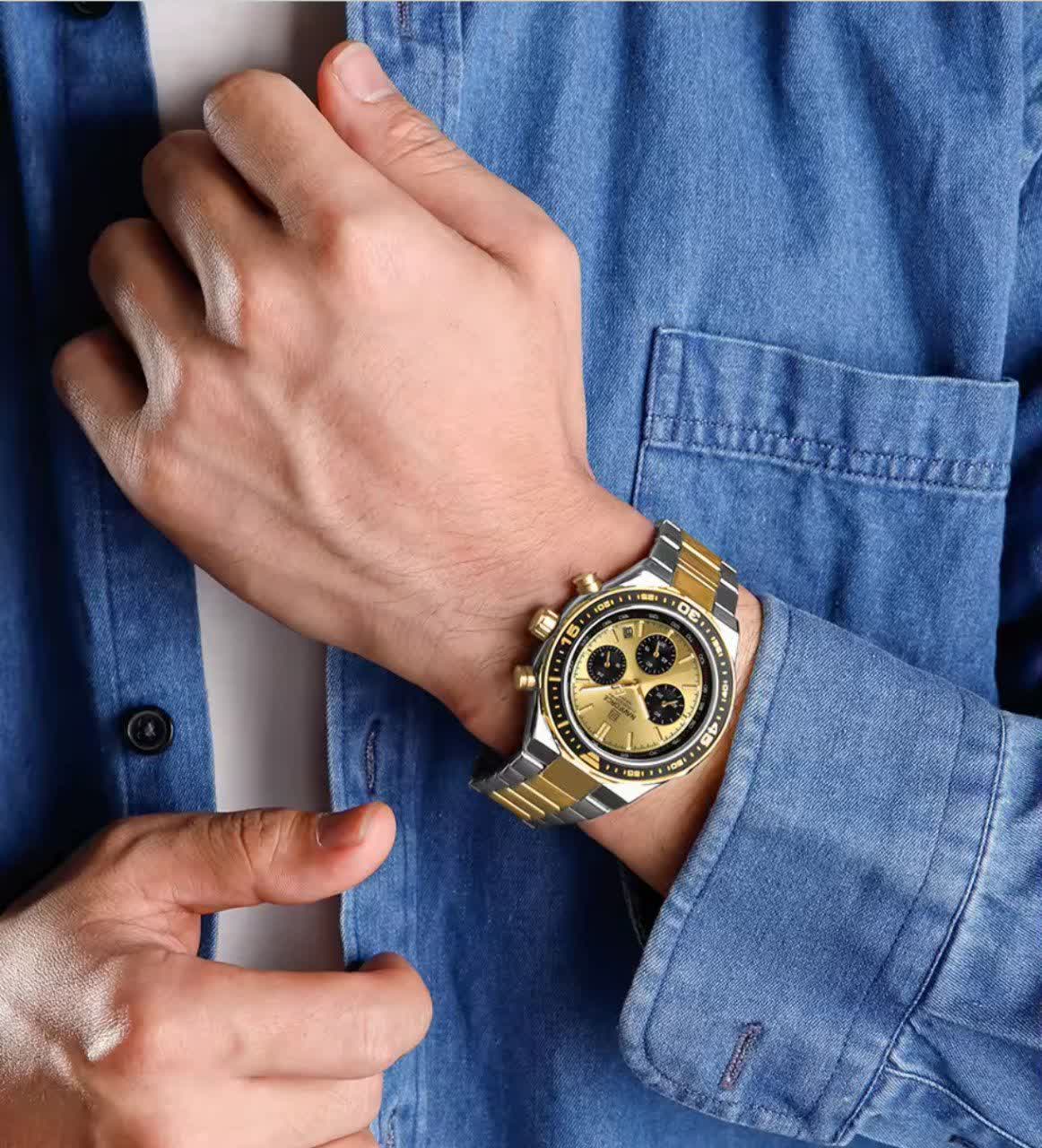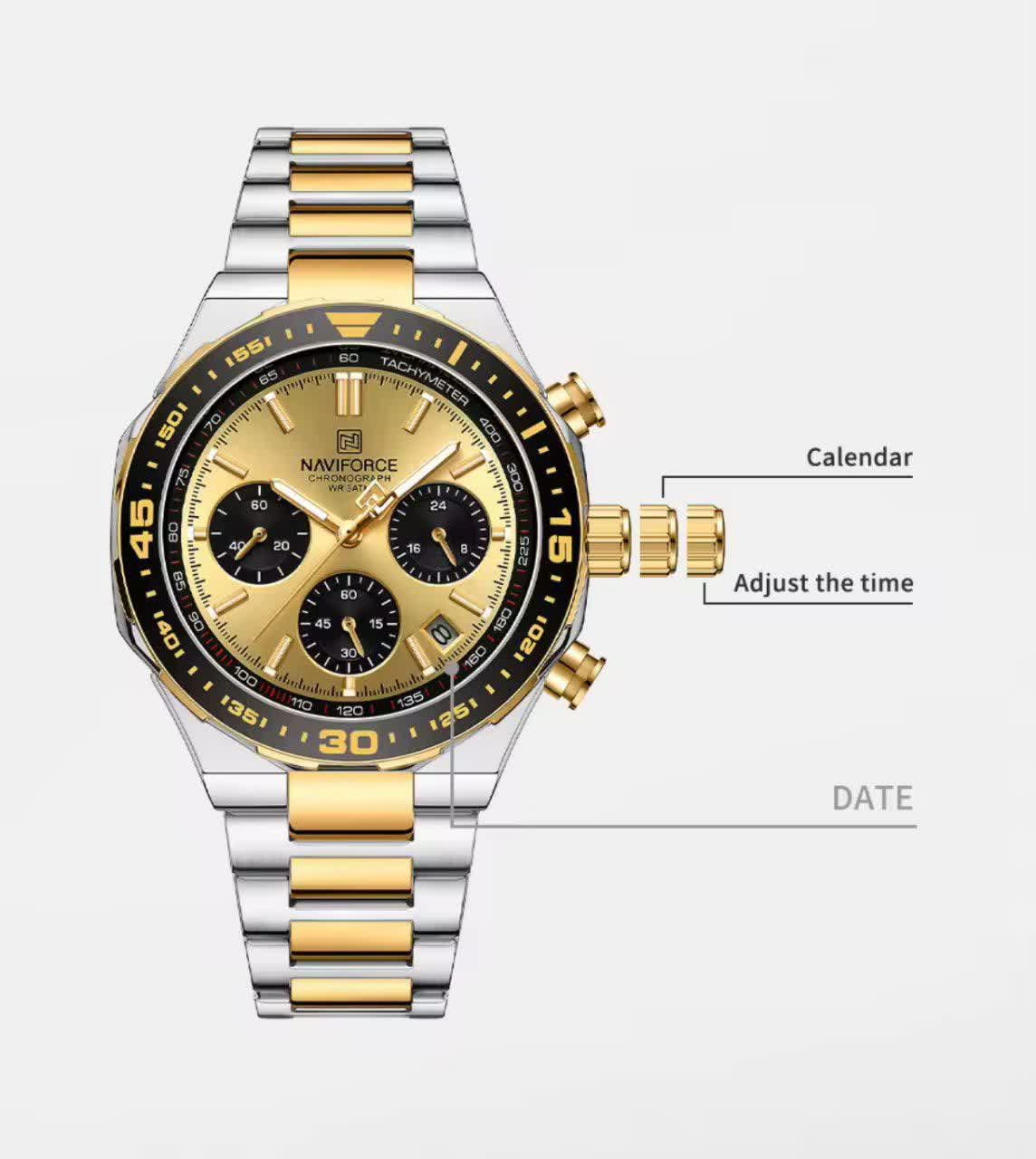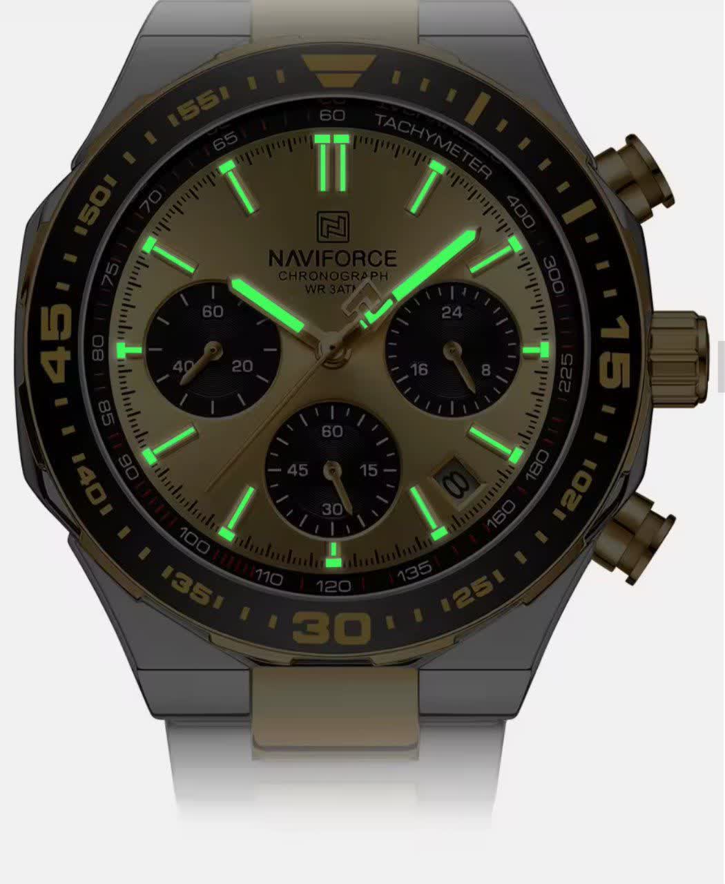 ساعت مچی کرنوگراف مردانه نیوی فورس NAVIFORCE مدل Nf8049 با موتور ژاپن کوارتز انتخابی شیک و قدرتمند برای آقایان خوش سلیقه است. این مدل با بند استیل ضد زنگ توپُر و سنگین به رنگ نقره ای با رگه طلایی و صفحه طلایی جلوه ای لوکس و مردانه دارد. ساعت سه موتوره کرنوگراف بوده و دارای تقویم عقربه های شب تاب شیشه معدنی ضد خش قاب استیل و مقاومت در برابر آب است. بند ضد حساسیت پوستی و قفل کلیپسی ضامن دار استفاده روزمره را راحت و ایمن می کند. این محصول کاملا ارجینال به همراه جعبه و کارت گارانتی معتبر نیوی فورس ایران از فروشگاه اینترنتی روبی مد عرضه می شود.