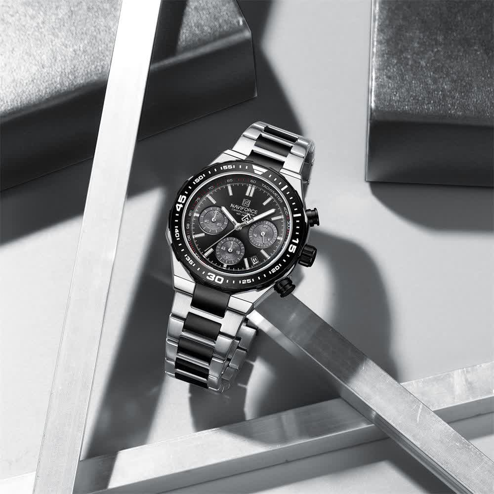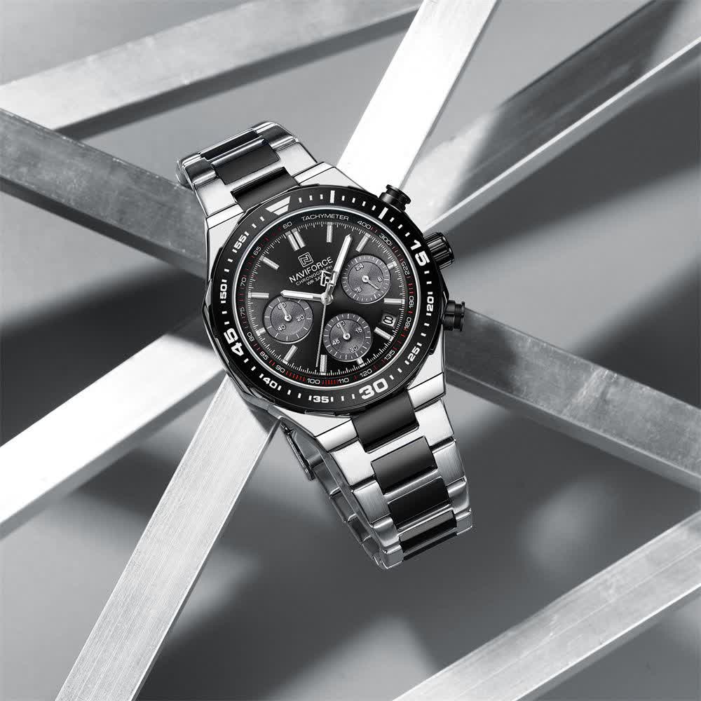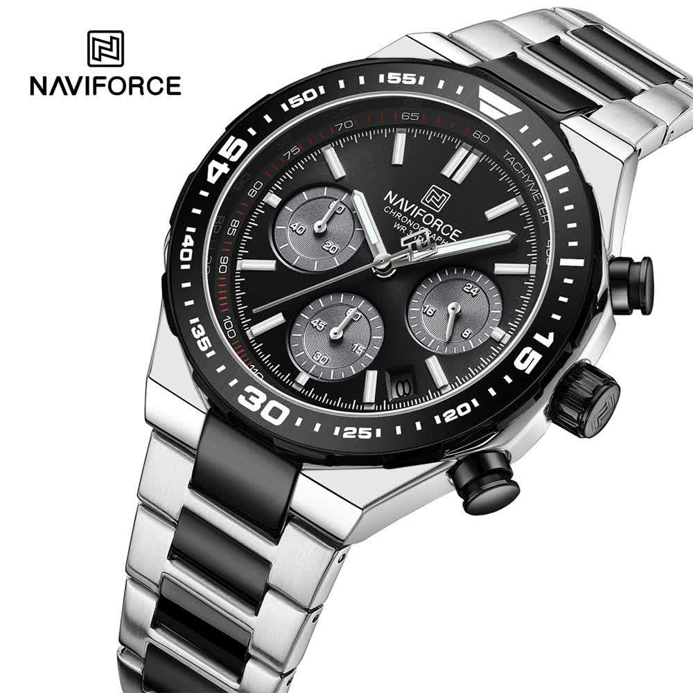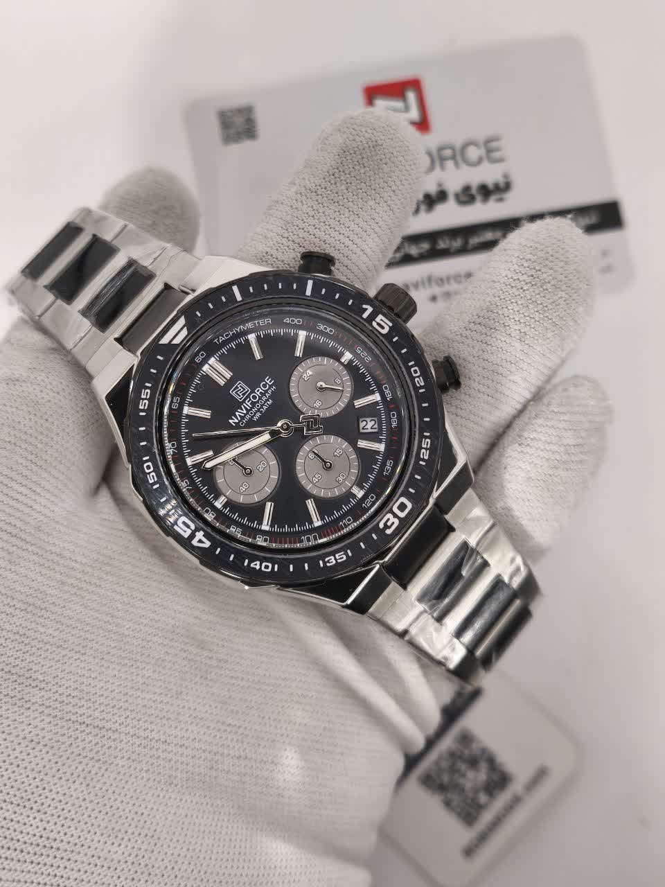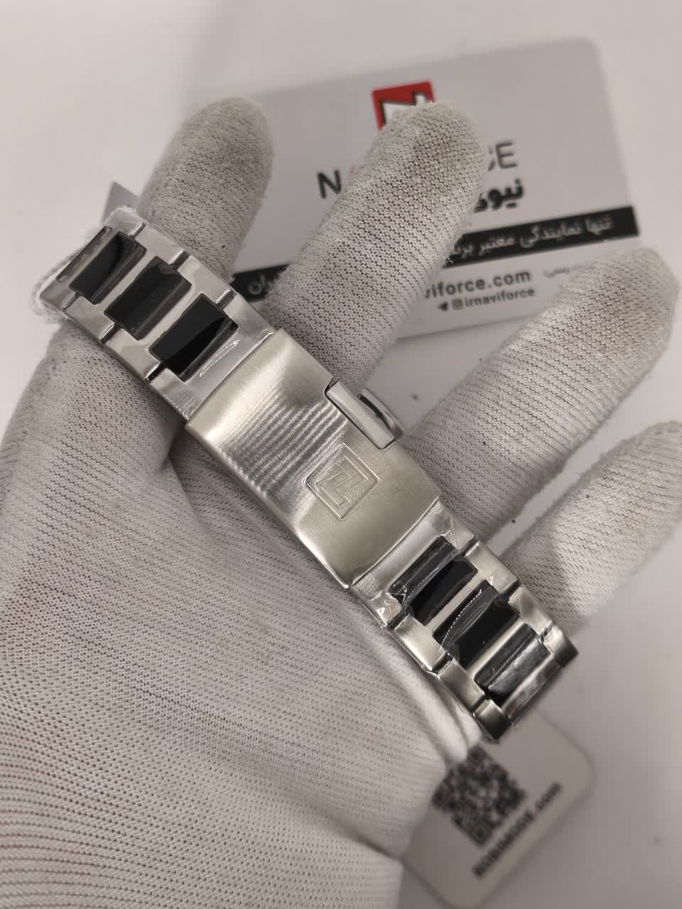 ساعت مچی کرنوگراف مردانه نیوی فورس NAVIFORCE مدل Nf8049 با موتور ژاپن کوارتز گزینه ای شیک و مقاوم برای استفاده روزمره و رسمی است. این ساعت با بند استیل ضد زنگ توپُر و سنگین با رگه مشکی و صفحه مشکی طراحی شده و ظاهری کاملا مردانه دارد. سه موتوره کرنوگراف تقویم دار قاب استیل عقربه های شب تاب شیشه معدنی ضد خش و مقاومت در برابر آب از ویژگی های کاربردی آن هستند. بند ضد حساسیت پوستی به همراه قفل کلیپسی ضامن دار راحتی و ایمنی بالایی ایجاد می کند. این محصول اصل به همراه جعبه و کارت گارانتی معتبر نیوی فورس ایران از فروشگاه اینترنتی روبی مد عرضه می شود.
