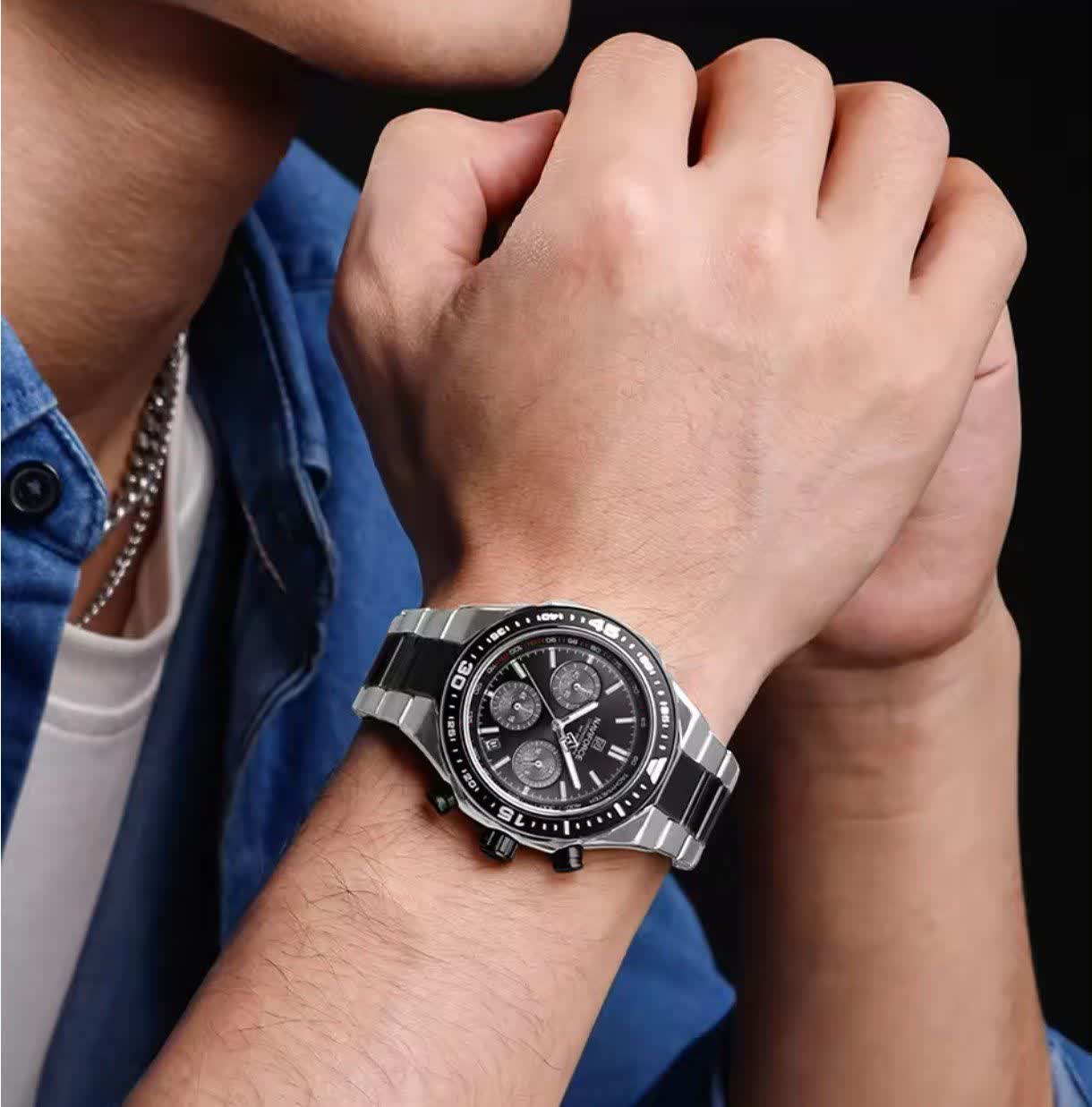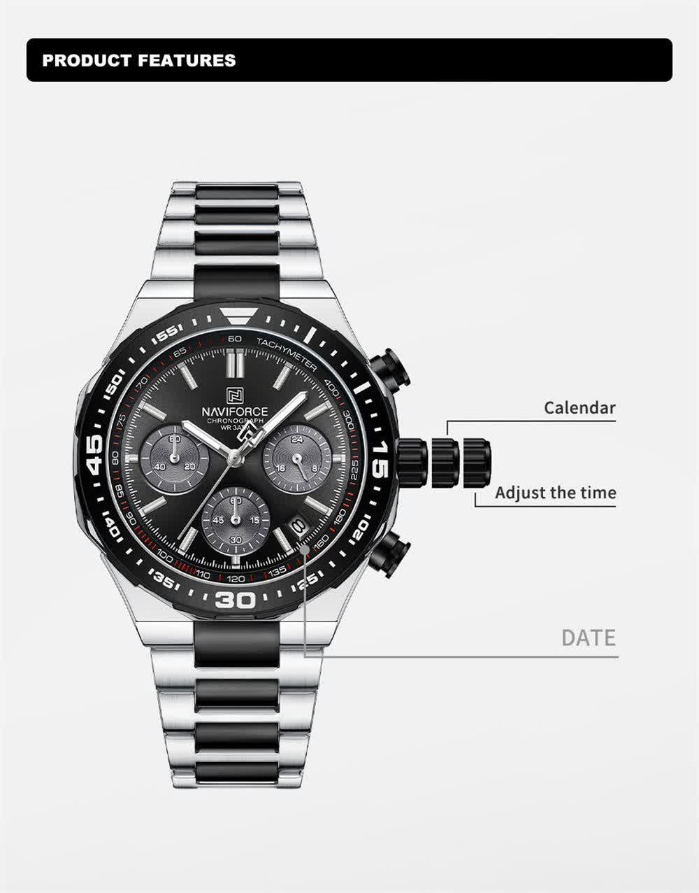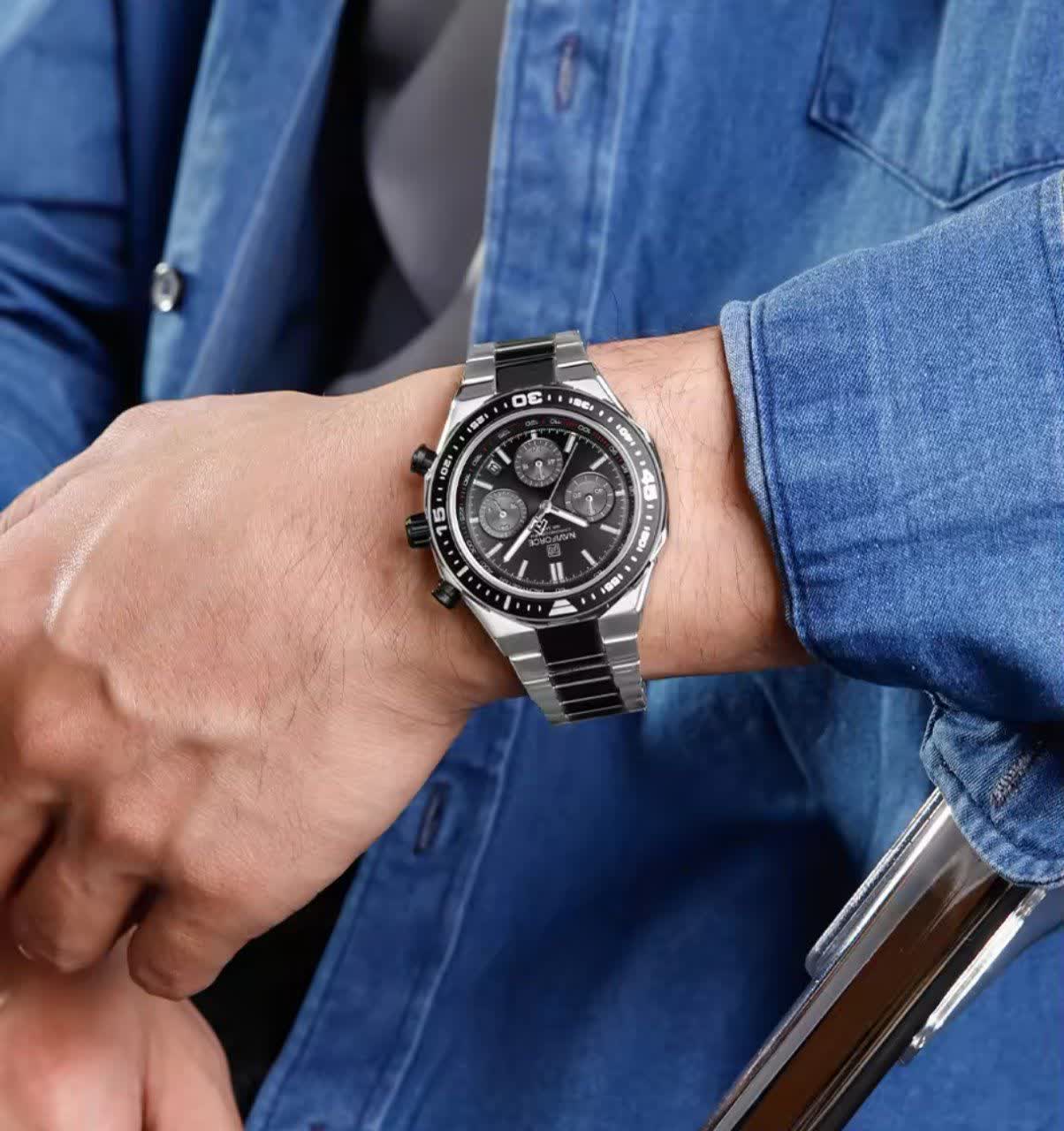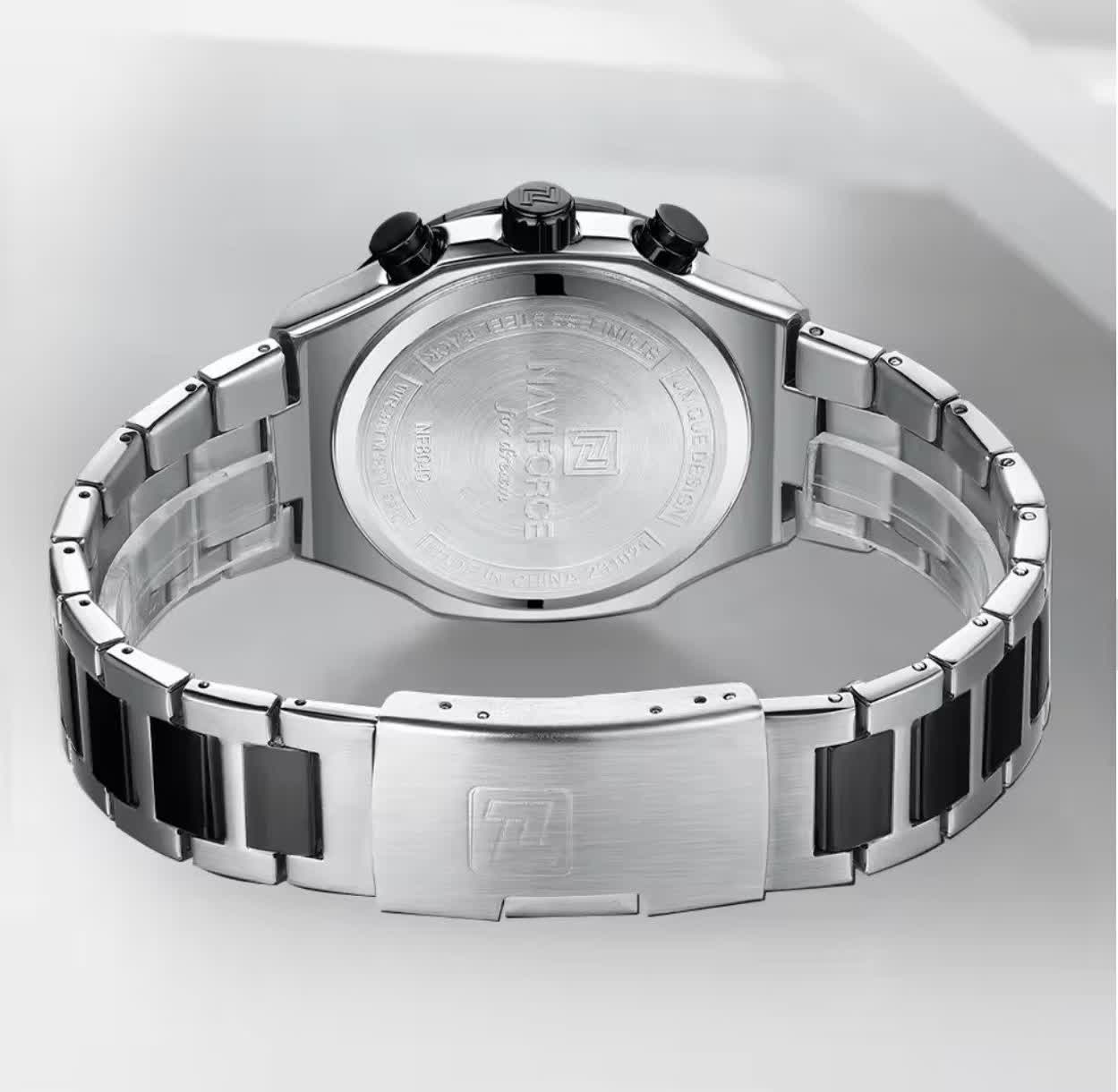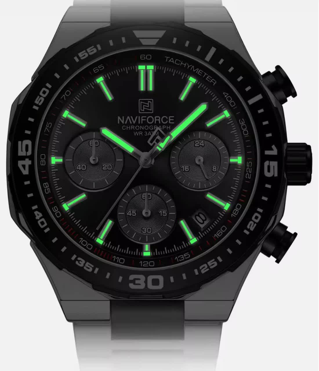 ساعت مچی کرنوگراف مردانه نیوی فورس NAVIFORCE مدل Nf8049 با موتور ژاپن کوارتز گزینه ای شیک و مقاوم برای استفاده روزمره و رسمی است. این ساعت با بند استیل ضد زنگ توپُر و سنگین با رگه مشکی و صفحه مشکی طراحی شده و ظاهری کاملا مردانه دارد. سه موتوره کرنوگراف تقویم دار قاب استیل عقربه های شب تاب شیشه معدنی ضد خش و مقاومت در برابر آب از ویژگی های کاربردی آن هستند. بند ضد حساسیت پوستی به همراه قفل کلیپسی ضامن دار راحتی و ایمنی بالایی ایجاد می کند. این محصول اصل به همراه جعبه و کارت گارانتی معتبر نیوی فورس ایران از فروشگاه اینترنتی روبی مد عرضه می شود.