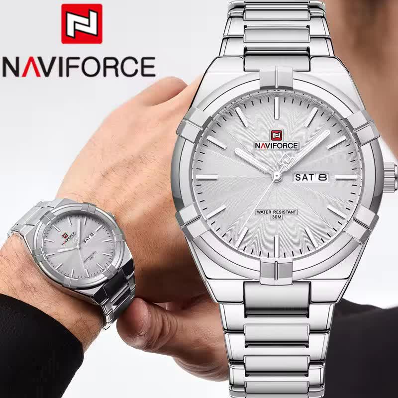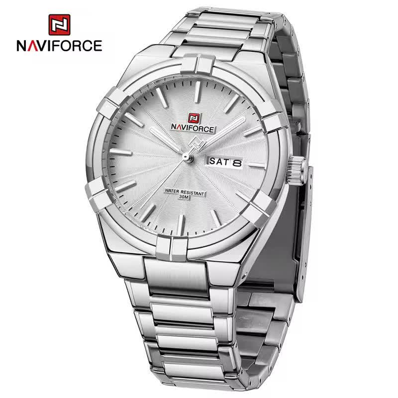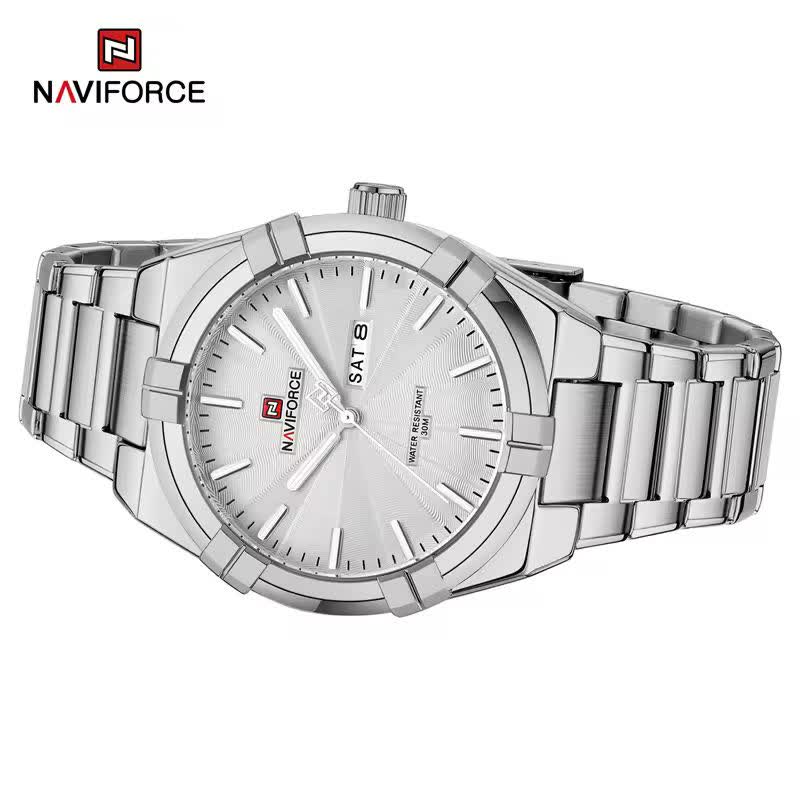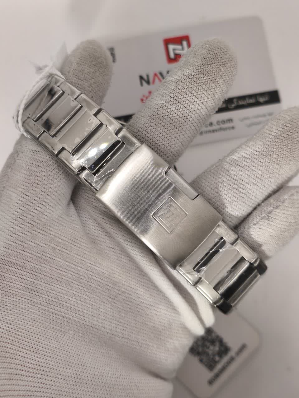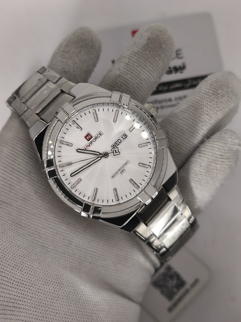 ساعت مچی عقربه ای مردانه نیوی فورس NAVIFORCE مدل Nf9218 اورجینال با موتور ژاپن انتخابی شیک و کاربردی برای استایل روزمره و رسمی است. این ساعت با بند استیل ضد زنگ توپُر و سنگین و صفحه سفید طراحی شده و جلوه ای کلاسیک و مردانه دارد. وجود تقویم قاب استیل عقربه های شب تاب شیشه معدنی ضد خش و مقاومت در برابر آب کارایی بالای آن را تضمین می کند. بند ضد حساسیت پوستی به همراه قفل کلیپسی ضامن دار راحتی و امنیت استفاده را افزایش می دهد. این محصول اصل به همراه جعبه و کارت گارانتی معتبر نیوی فورس ایران از فروشگاه اینترنتی روبی مد ارائه می شود.