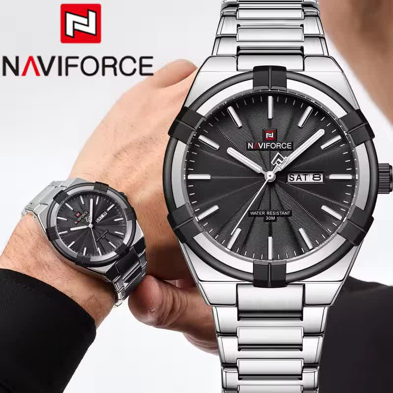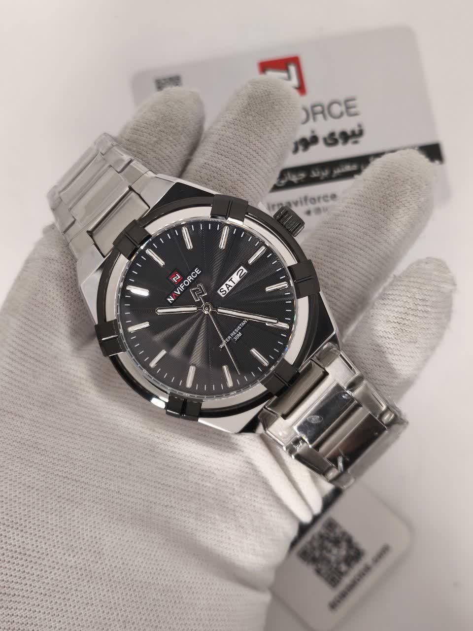 ساعت مچی عقربه ای مردانه نیوی فورس NAVIFORCE مدل Nf9218 اورجینال با موتور ژاپن انتخابی شیک و بادوام برای آقایان خوش سلیقه است. این مدل با بند استیل ضد زنگ توپُر و سنگین و صفحه مشکی طراحی شده و ظاهری کلاسیک و جذاب دارد. وجود تقویم قاب استیل عقربه های شب تاب شیشه معدنی ضد خش و مقاومت در برابر آب کارایی بالای ساعت را تضمین می کند. بند ضد حساسیت پوستی به همراه قفل کلیپسی ضامن دار استفاده راحت و ایمن را فراهم می سازد. این محصول اصل به همراه جعبه و کارت گارانتی معتبر نیوی فورس ایران از فروشگاه اینترنتی روبی مد عرضه می شود.