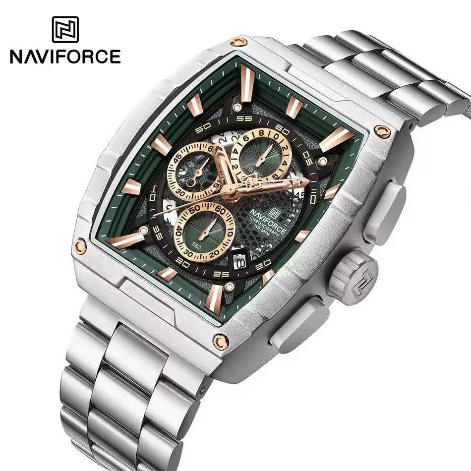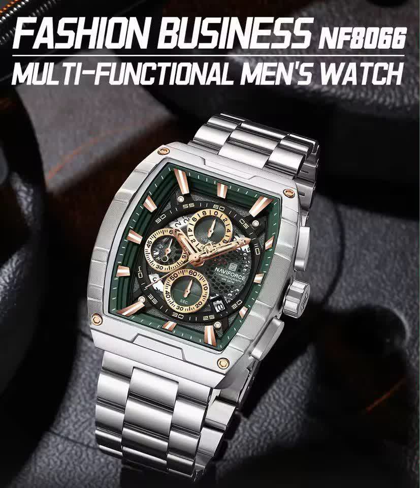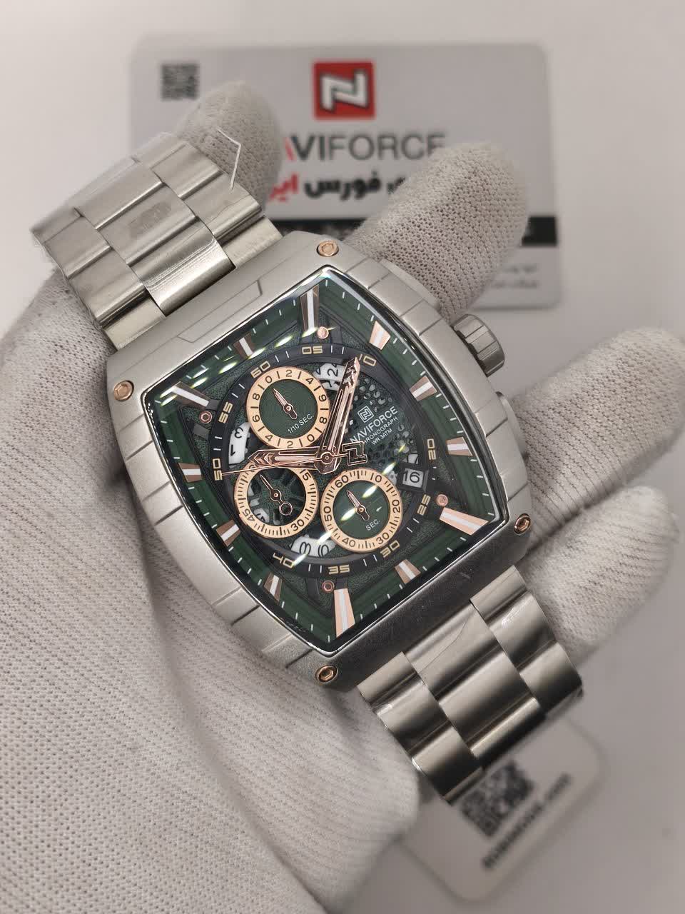 ساعت مچی کرنوگراف مردانه نیوی فورس NAVIFORCE مدل Nf8066 با صفحه سبز و موتور ژاپن کوارتز انتخابی خاص و متفاوت برای آقایان خوش سلیقه است. این مدل با بند استیل ضد زنگ توپُر و سنگین و صفحه مستطیلی طراحی شده و جلوه ای مدرن و لوکس دارد. سه موتوره کرنوگراف تقویم دار قاب استیل عقربه های شب تاب شیشه معدنی ضد خش و مقاومت در برابر آب از ویژگی های کاربردی این ساعت هستند. بند ضد حساسیت پوستی در کنار قفل کلیپسی ضامن دار راحتی و ایمنی بالایی فراهم می کند. این محصول اصل به همراه جعبه و کارت گارانتی معتبر نیوی فورس ایران از فروشگاه اینترنتی روبی مد عرضه می شود.