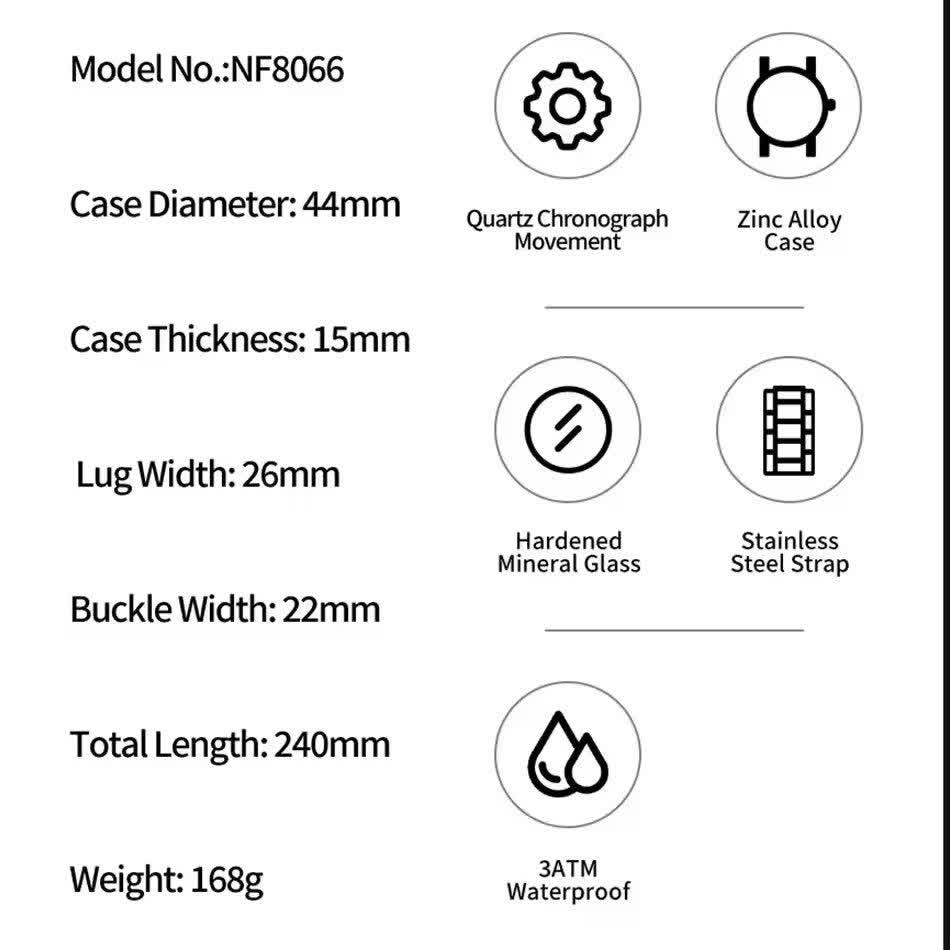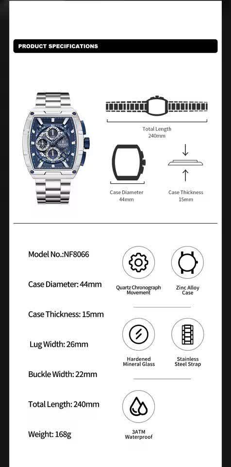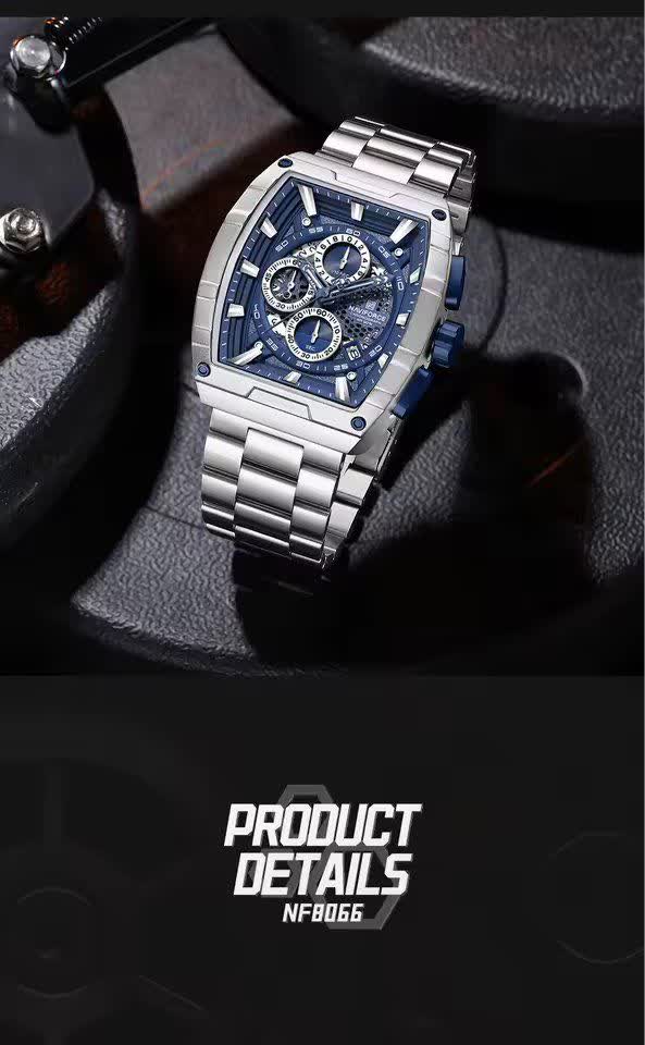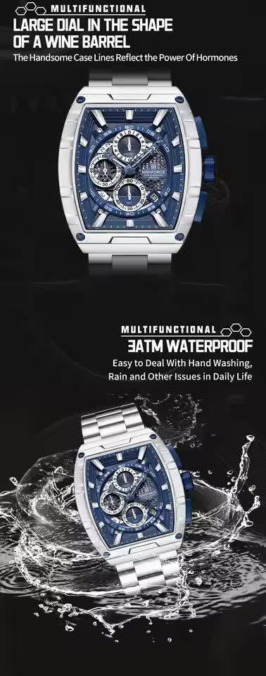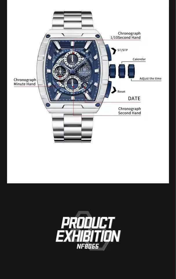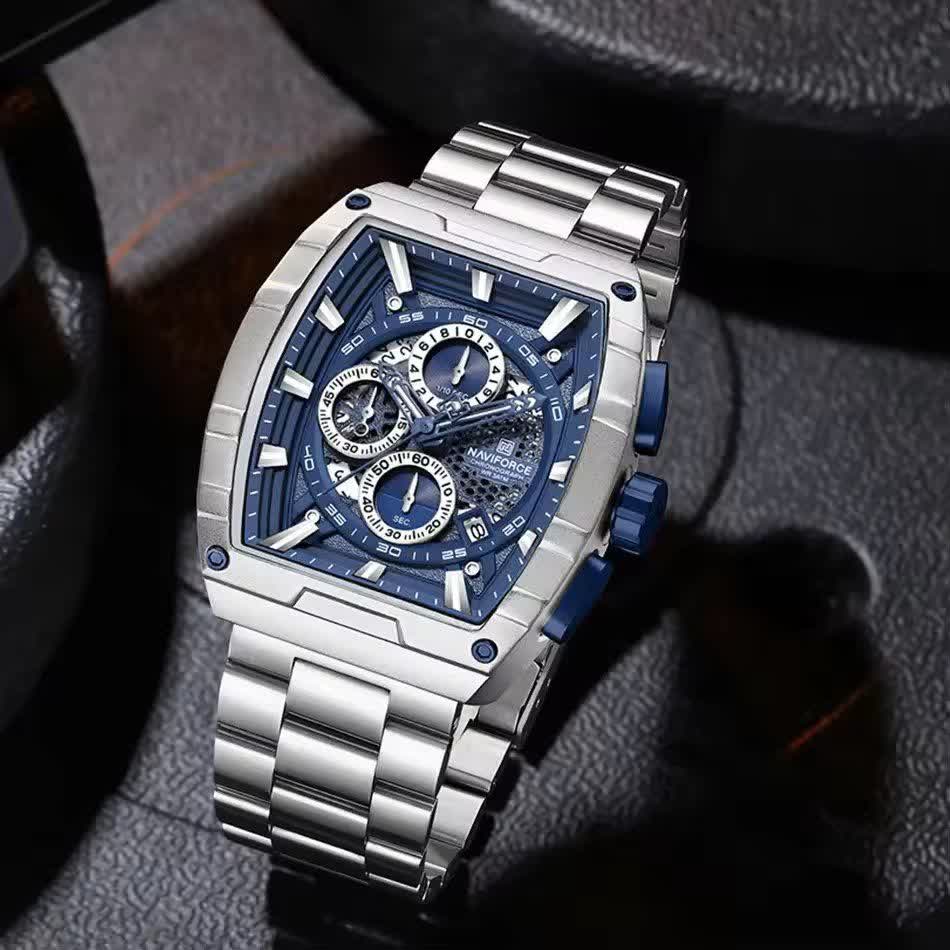 ساعت مچی کرنوگراف مردانه نیوی فورس NAVIFORCE مدل Nf8066 با صفحه آبي و موتور ژاپن کوارتز انتخابی خاص و متفاوت برای آقایان خوش سلیقه است. این مدل با بند استیل ضد زنگ توپُر و سنگین و صفحه مستطیلی طراحی شده و جلوه ای مدرن و لوکس دارد. سه موتوره کرنوگراف تقویم دار قاب استیل عقربه های شب تاب شیشه معدنی ضد خش و مقاومت در برابر آب از ویژگی های کاربردی این ساعت هستند. بند ضد حساسیت پوستی در کنار قفل کلیپسی ضامن دار راحتی و ایمنی بالایی فراهم می کند. این محصول اصل به همراه جعبه و کارت گارانتی معتبر نیوی فورس ایران از فروشگاه اینترنتی روبی مد عرضه می شود.