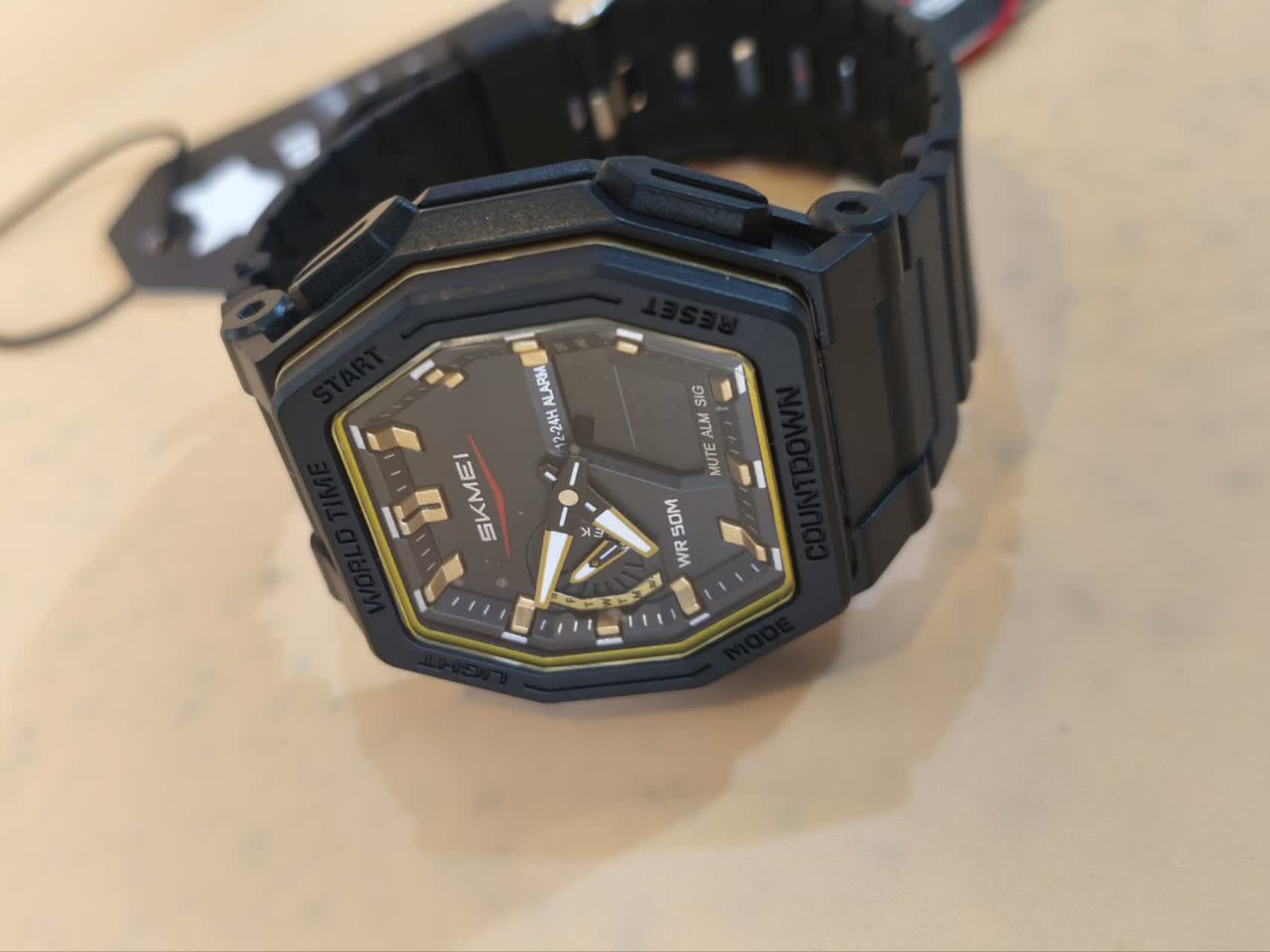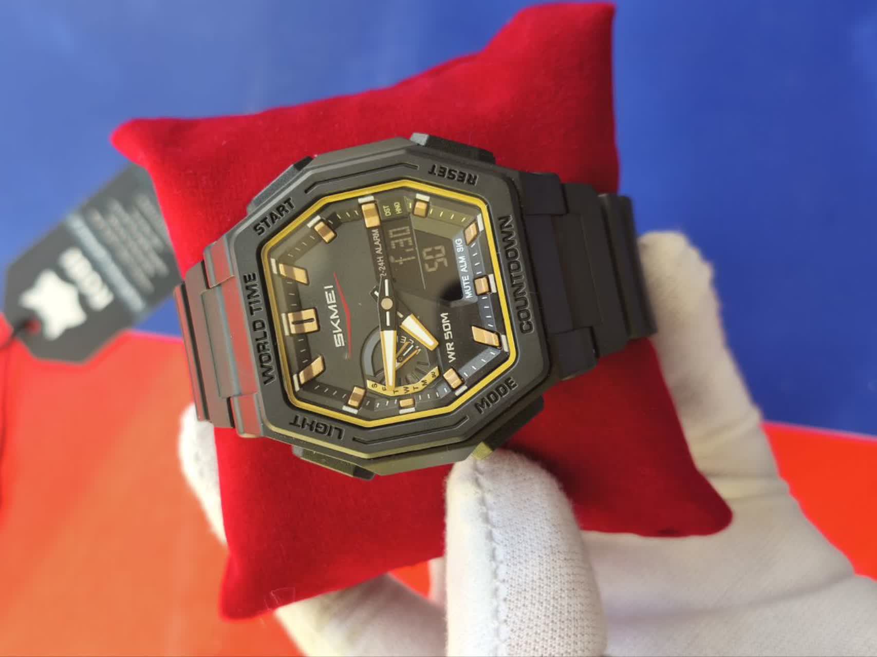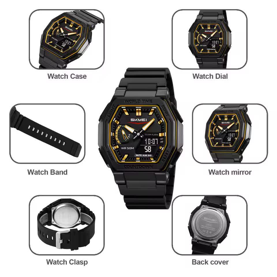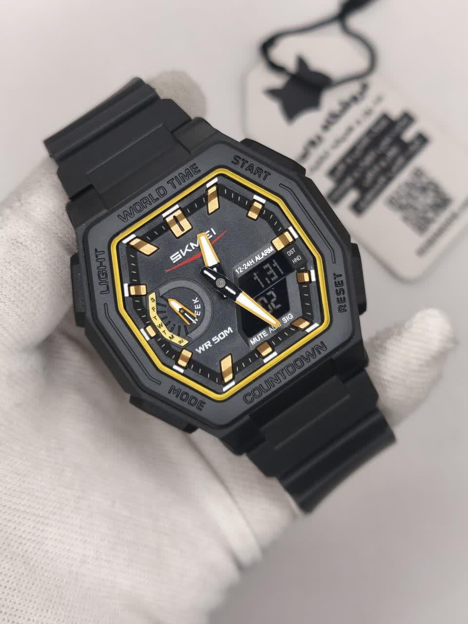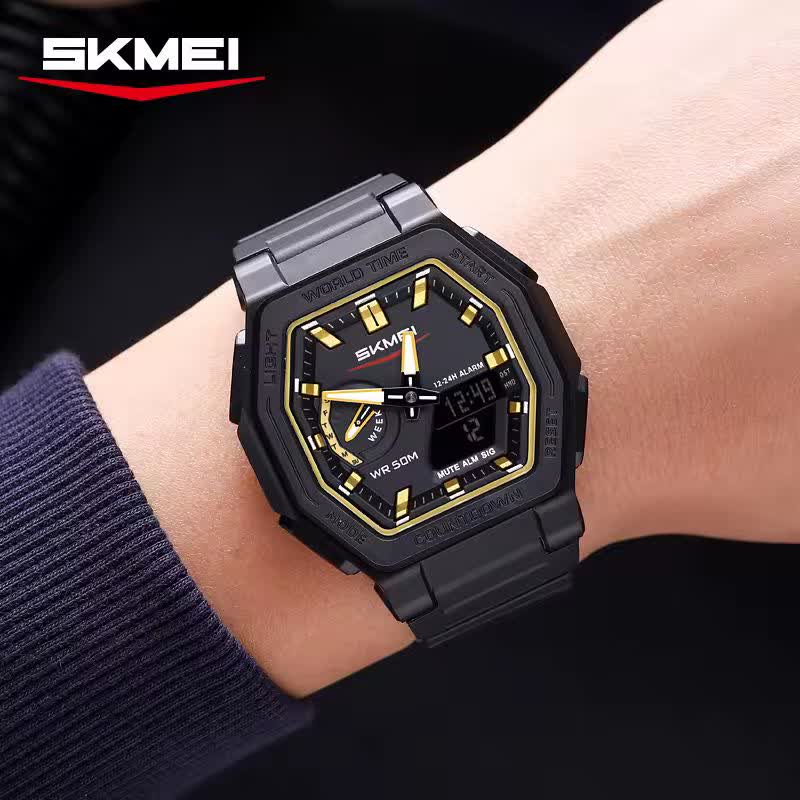 ساعت مچی مردانه دیجیتال و عقربهای اسکمی مدل SKMEI 2438 اوریجینال با بند مشکی و صفحه مشکی طراحی جذاب و عملکرد حرفهای دارد این ساعت با قابلیت دو زمانه تاریخ شمار آلارم تایمر و صفحه چراغدار برای دید در شب مناسب است ضد آب تضمینی و با شیشه سافایر ضد خط و خش و جنس بند پلی اورتان با کیفیت تولید شده است بند سوزنی سگکی کمربندی دارد و به همراه جعبه هدیه ارائه میشود در فروشگاه اینترنتی روبی مد