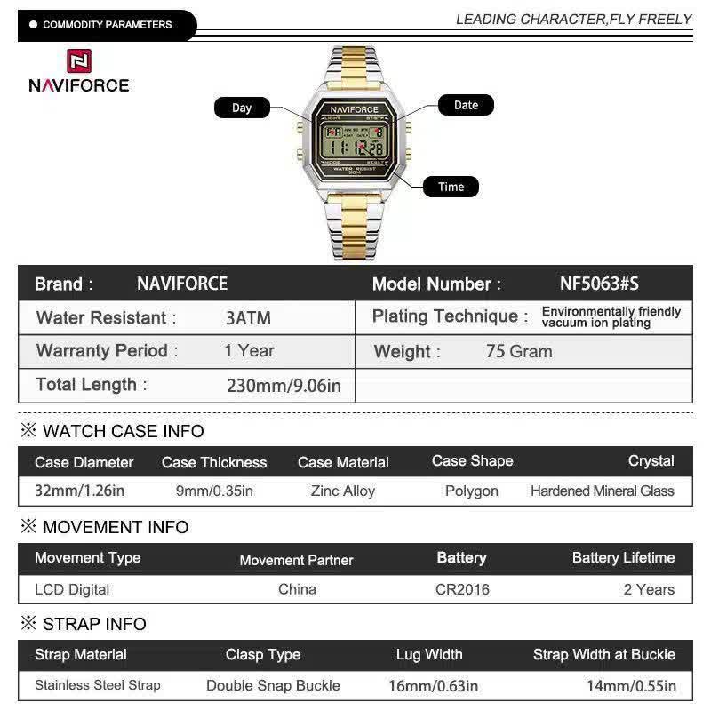 ساعت مچی دیجیتال مردانه نیوی فورس مدل Nf5063s با بند طلايي استيل ، یک ساعت فوق العاده خاص و جذاب است. این مدل ارجینال با کارت گارانتی و جعبه به همراه گارانتی نیوی فورس ایران ارائه میشود. دارای کرنومتر، تایمر، تقویم، ثانیه شمار و موتور کوارتز ژاپن است. همچنین دارای صفحه چراغ دار، ضد آب، بند ضد حساسیت، شیشه معدنی ضد خش، قاب استیل رنگ ثابت و قفل ضامن دار کلیپسی میباشد. برای خرید این ساعت شیک و مدرن به فروشگاه اینترنتی روبیمد مراجعه کنید.