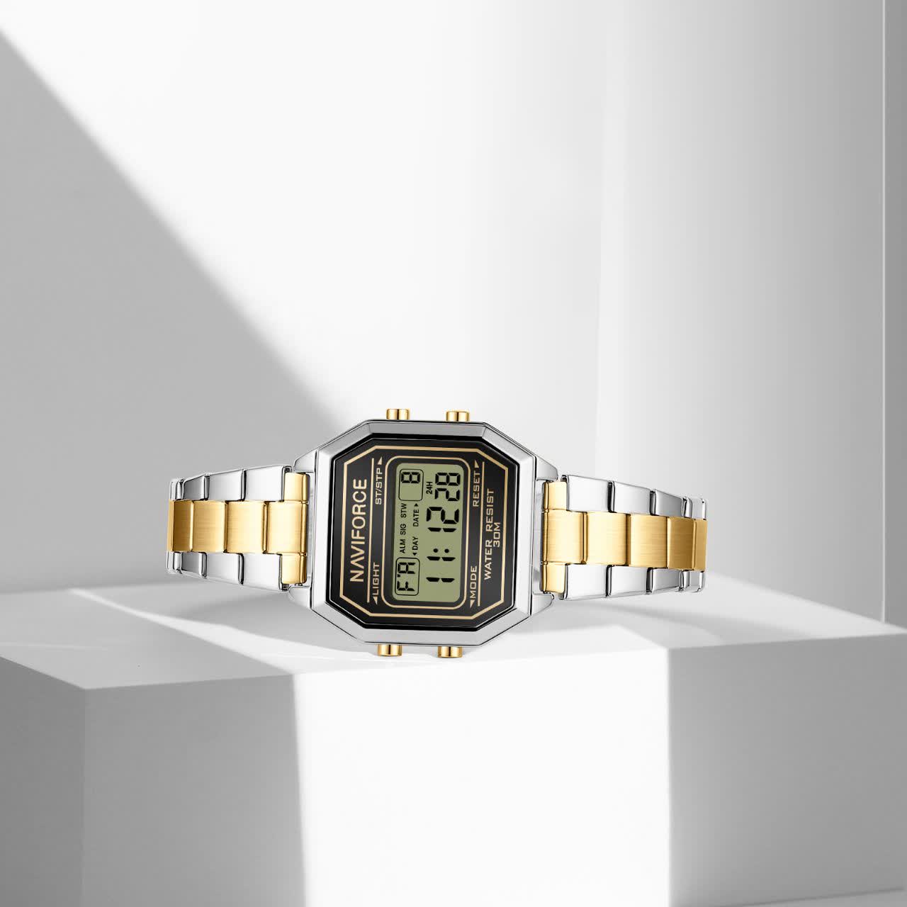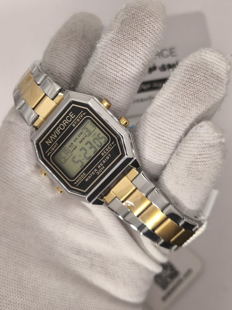 ساعت مچی دیجیتال مردانه نیوی فورس مدل Nf5063s با بند نقرهای رگه طلایی و قاب استیل مشکی، یک ساعت فوقالعاده خاص و جذاب است. این مدل ارجینال با کارت گارانتی و جعبه به همراه گارانتی نیوی فورس ایران عرضه میشود. مجهز به کرنومتر، تایمر، تقویم، ثانیه شمار و موتور کوارتز ژاپن است. دارای صفحه چراغدار، ضد آب، بند ضد حساسیت، شیشه معدنی ضد خش، قاب استیل رنگ ثابت و قفل ضامندار کلیپسی میباشد. برای داشتن این ساعت شیک و مدرن، به فروشگاه اینترنتی روبیمد سر بزنید.