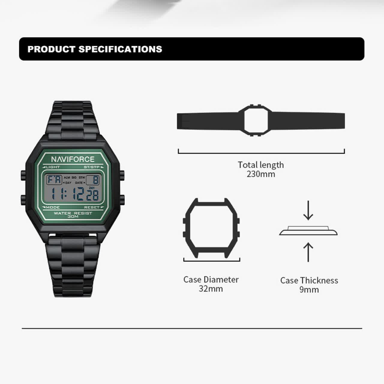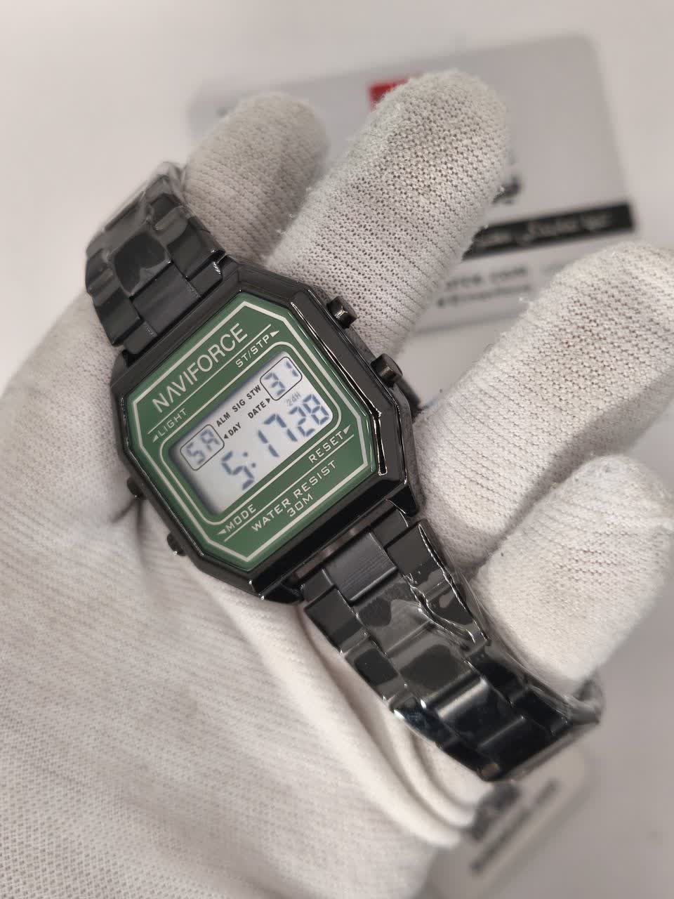 ساعت مچی دیجیتال مردانه نیوی فورس مدل Nf5063s با بند و صفحه مشکی و رگه های سبز، یک ساعت فوق العاده خاص و جذاب است. این مدل ارجینال با کارت گارانتی و جعبه به همراه گارانتی نیوی فورس ایران ارائه میشود. مجهز به کرنومتر، تایمر، تقویم، ثانیه شمار و موتور کوارتز ژاپن است. همچنین دارای صفحه چراغ دار، ضد آب، بند ضد حساسیت، شیشه معدنی ضد خش، قاب استیل رنگ ثابت و قفل ضامن دار کلیپسی میباشد. برای خرید این ساعت شیک و مدرن به فروشگاه اینترنتی روبیمد مراجعه کنید.