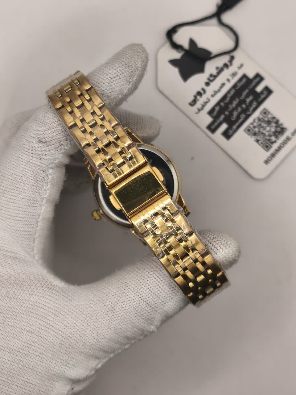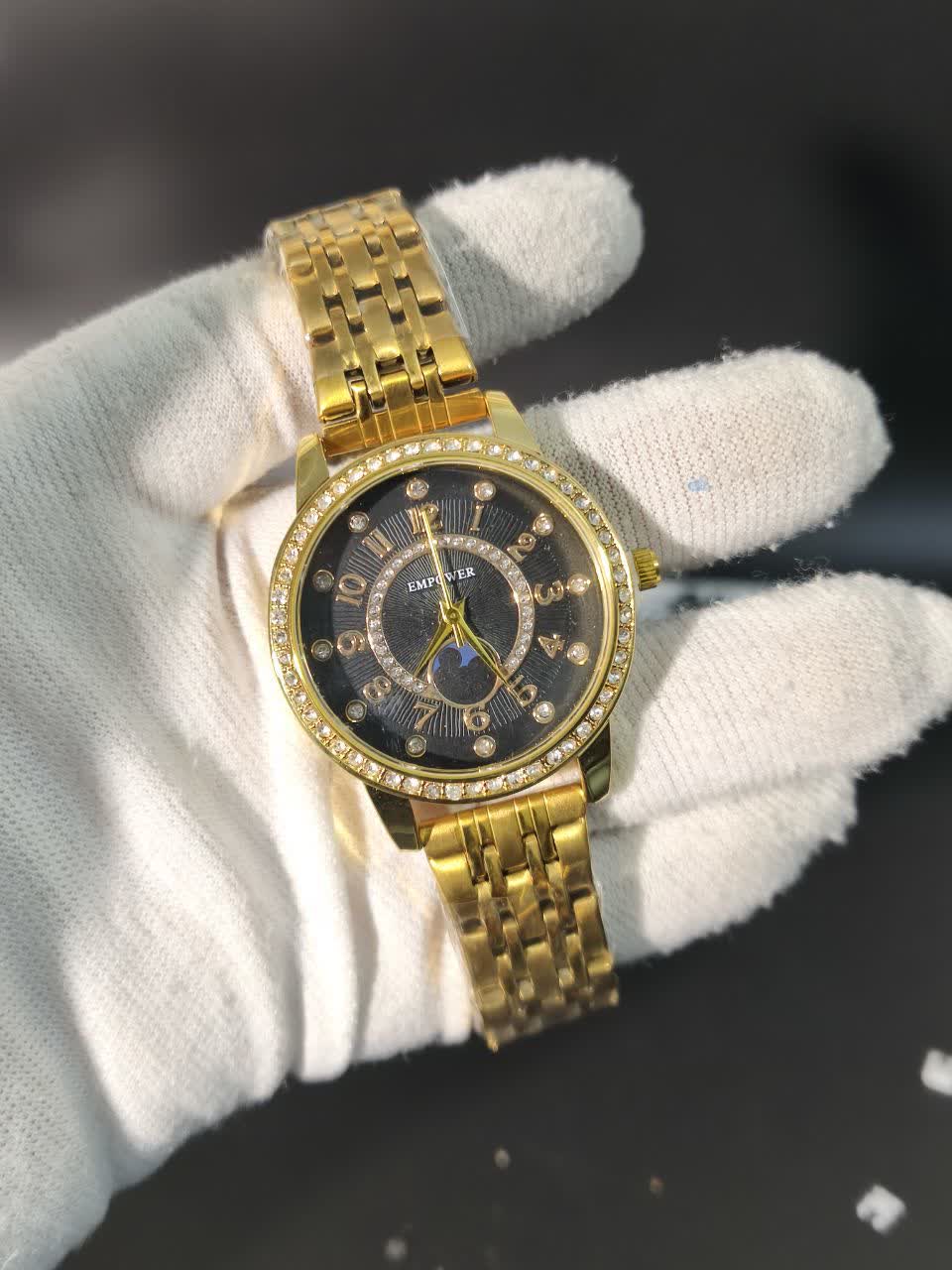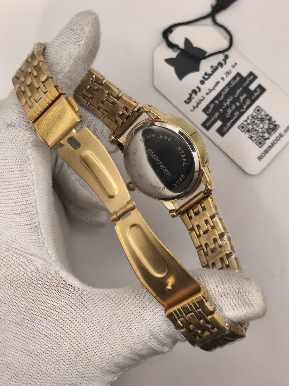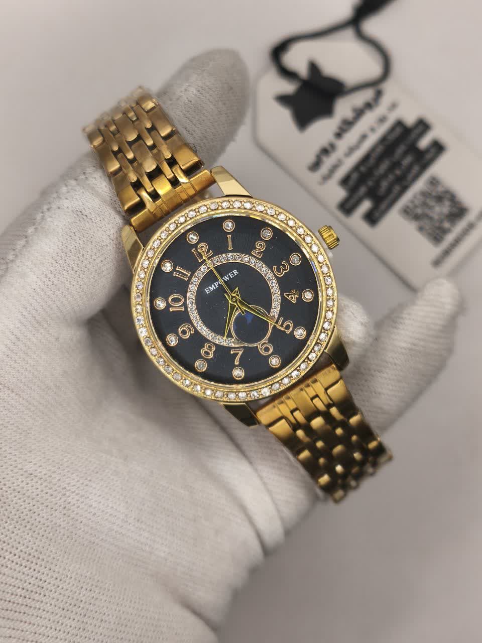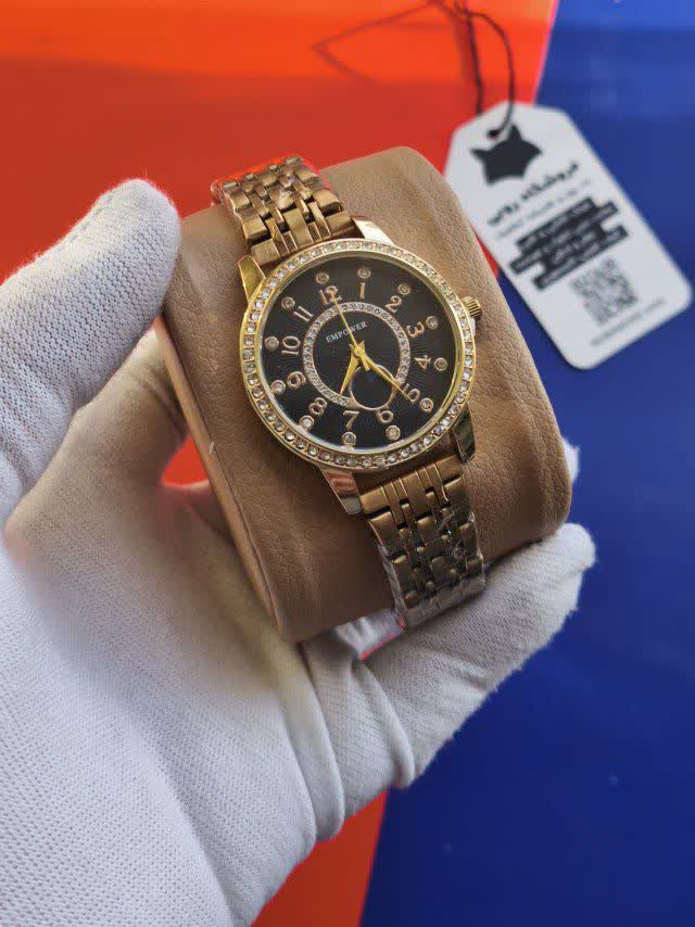ساعت مچی زنانه امپاور EMPAWER دور نگین با بند طلایی و صفحه مشکی انتخابی شیک و چشمگیر برای بانوان خاص پسند است. این مدل ارجینال شرکتی برند امپاور با موتور کوارتز دقت بالا و قاب استیل مقاوم طراحی شده و عقربه های شب تاب خوانایی خوبی در شب دارند. صفحه نگین با فرم دایره در کنار بند استیل ضد زنگ توپُر و سنگین با رنگ ثابت جلوه ای لوکس به دستان شما می بخشد. شیشه معدنی ضد خش بند ضد حساسیت پوستی قفل کلیپسی دو قفله ضامن دار و خاصیت ضد آب دوام و راحتی را تضمین می کند. توجه داشته باشید عکس اول تزئینی می باشد و این محصول جذاب از فروشگاه اینترنتی روبی مد قابل تهیه است.