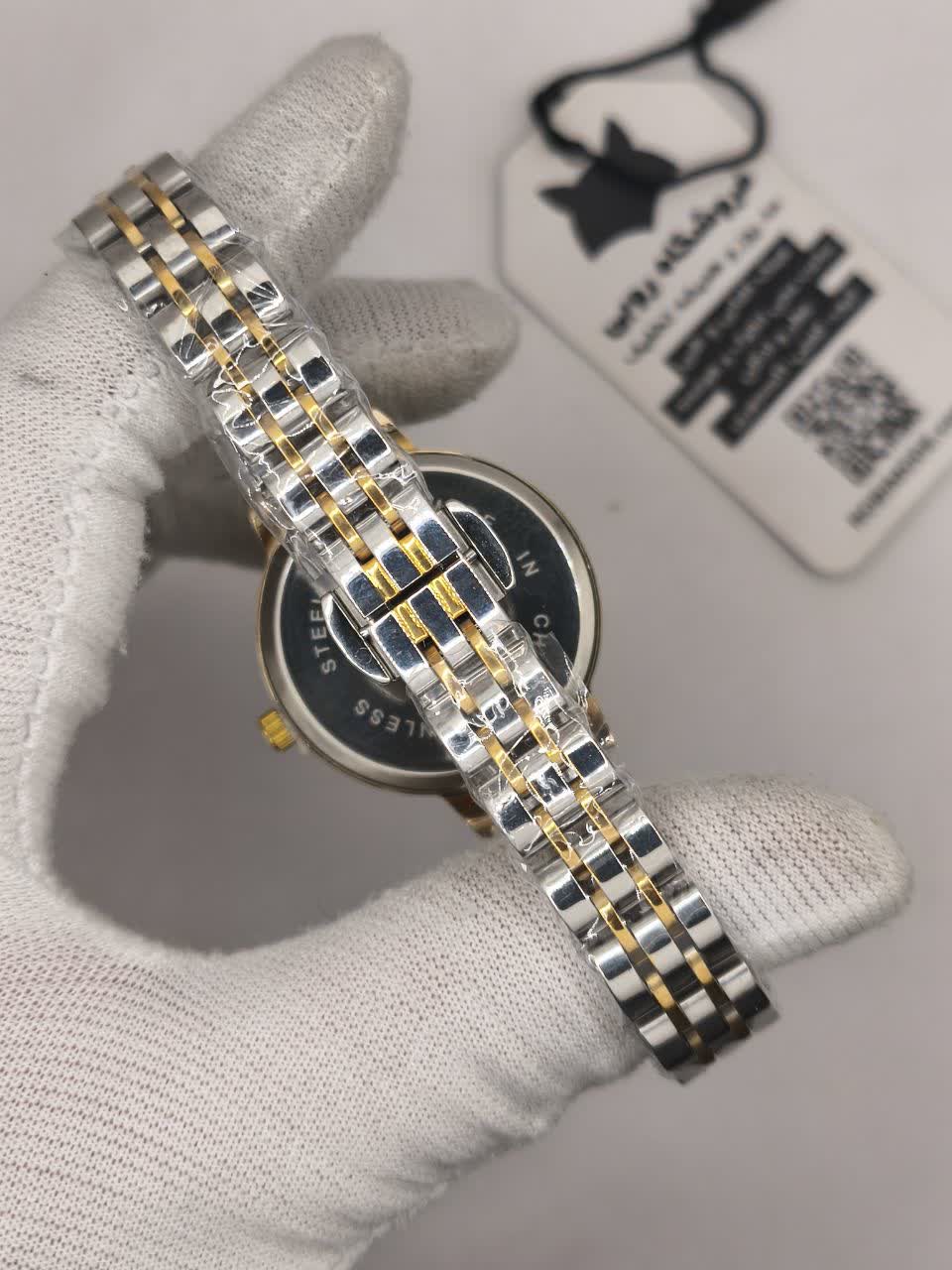 ساعت مچی زنانه امپاور EMPAWER طرح سه گل با بند نقره ای رگه طلایی و صفحه مشکی انتخابی خاص و شیک برای بانوان خوش سلیقه است. این مدل ارجینال شرکتی برند امپاور با موتور کوارتز دقت بالا و قاب استیل مقاوم طراحی شده و عقربه های شب تاب خوانایی مناسبی در نور کم ایجاد می کنند. فرم صفحه دایره با صفحه نگین در کنار بند استیل ضد زنگ توپُر و سنگین با رنگ ثابت جلوه ای لوکس به دستان شما می بخشد. شیشه معدنی ضد خش بند ضد حساسیت پوستی قفل پروانه ای جدید دو قفله و خاصیت ضد آب دوام و راحتی بالایی فراهم می کند. این ساعت جذابیت دستان شما را دوچندان کرده و از فروشگاه اینترنتی روبی مد قابل تهیه است.